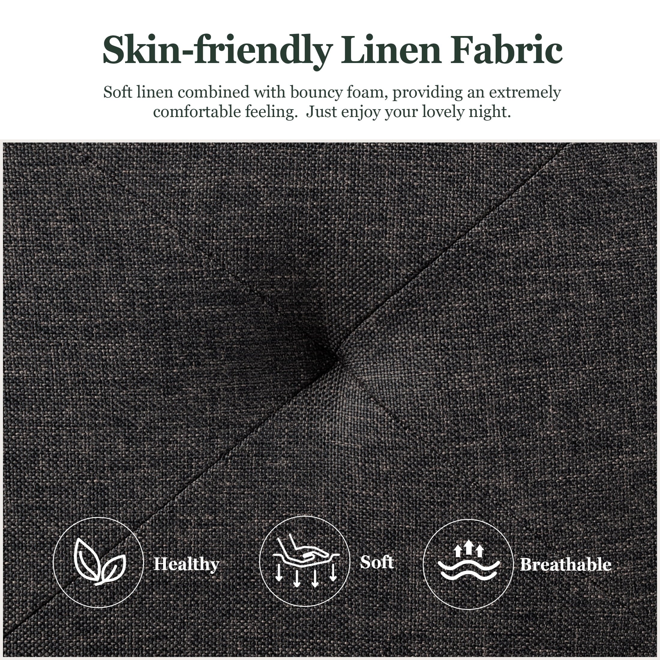 – Besides, with a simple platform design and a clean-lined headboard, the bed is perfect for a modern aesthetic. The headboard is upholstered with fabric, in a dark gray color, and filled with foam, offering you a comfortable feeling.