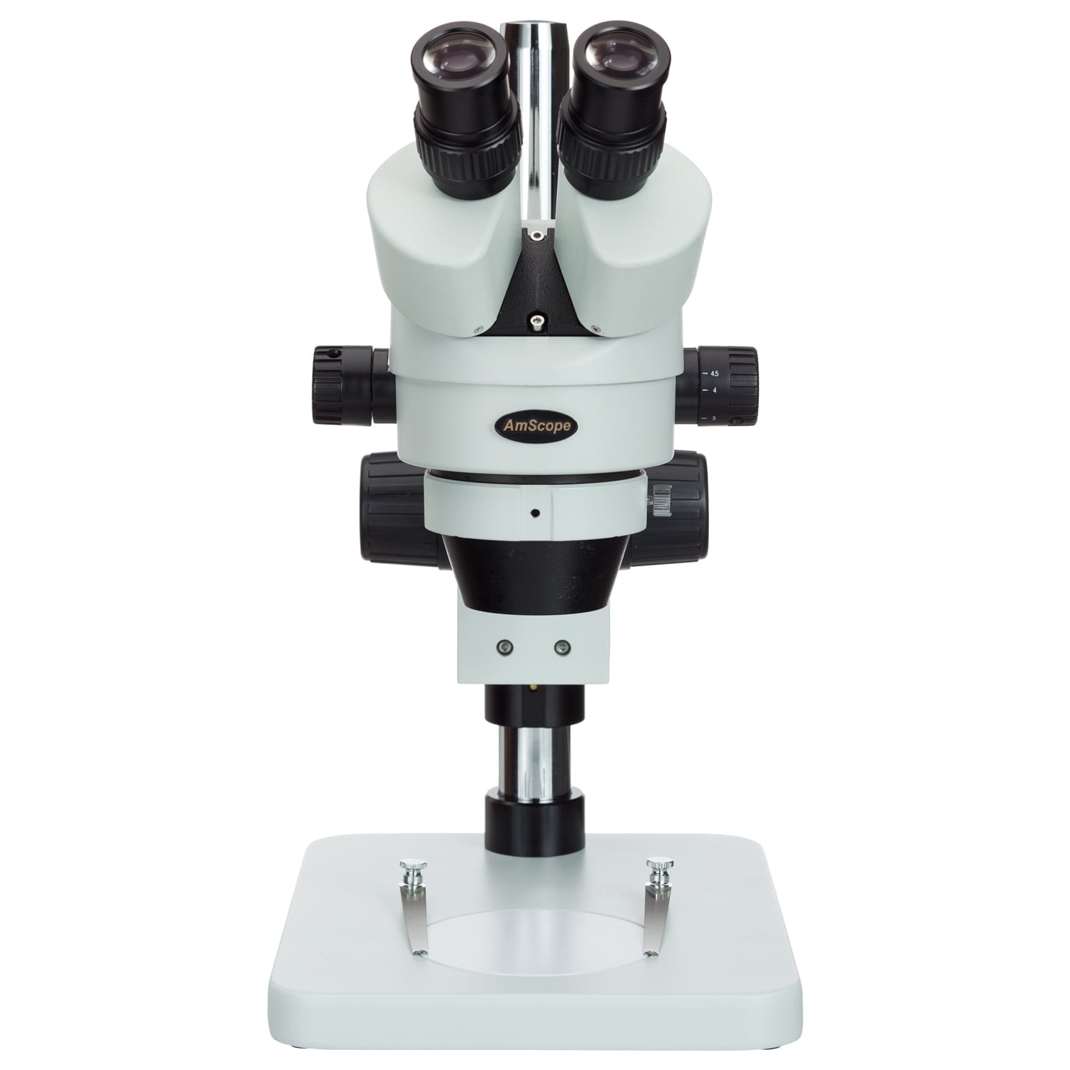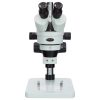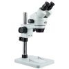 The SMZK-1BS stereo microscope is an ideal microscope for industrial inspection or biological analysis, with its 7X-45X zoom range. The tabletop-stand design allows for a simplified workspace, while allowing for various lighting arrangements. The 14″ pillar offers plenty of clearance, especially when using optional accessory lenses and ring-lights. The reversible black/white stage plate provides varied background-contrast.