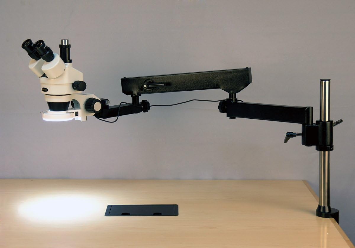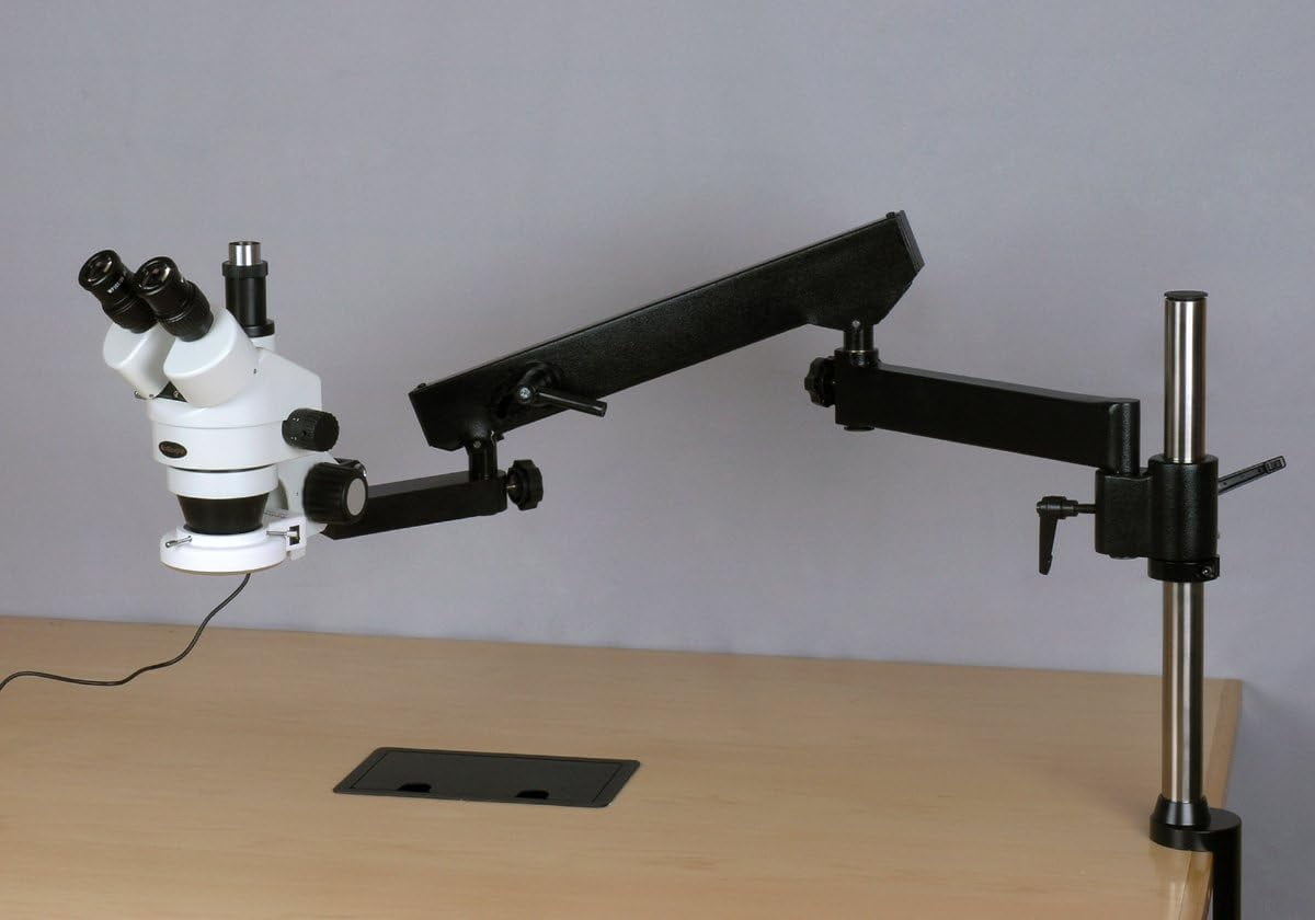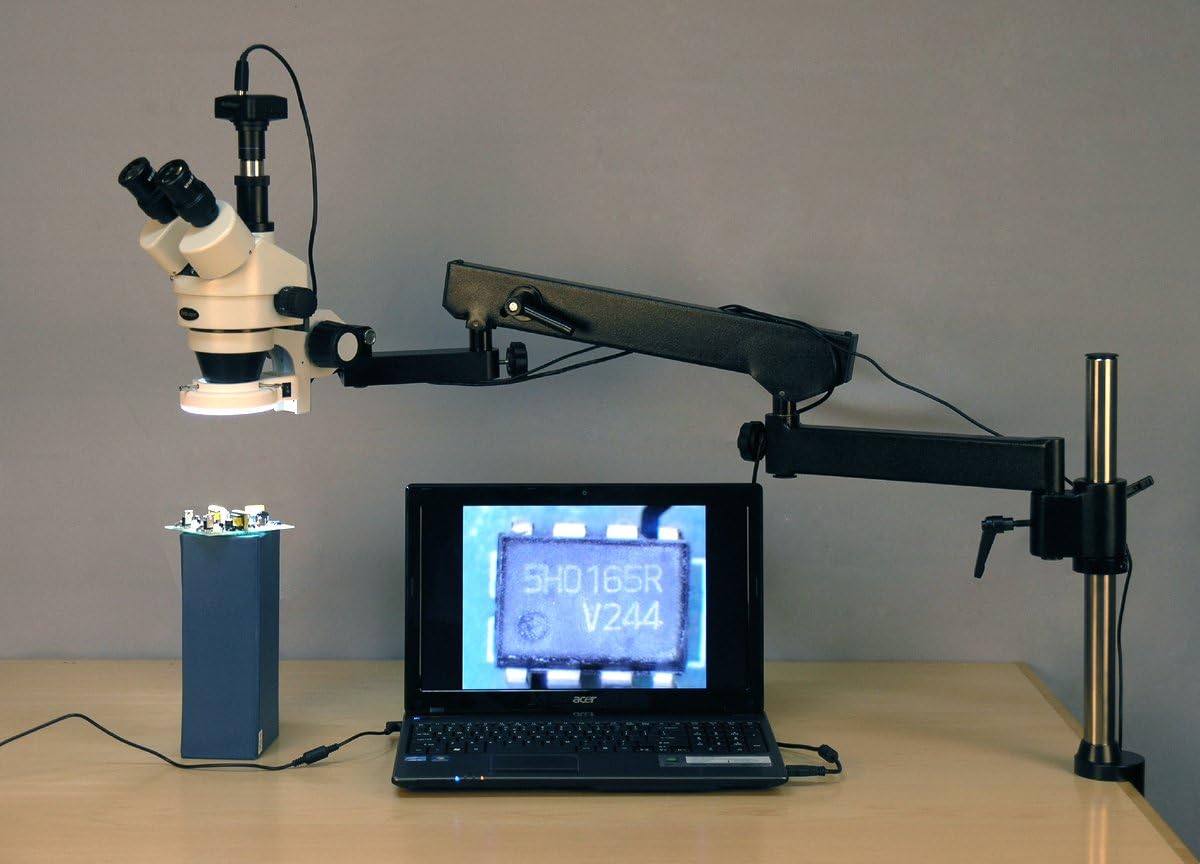 - Digital professional stereo microscope on articulating arm has long working distance to enable users to perform work or manipulate large items, including circuit boards and dental appliances, and has a 5MP camera with reduction lens and USB 2.0 output for capturing or displaying images on a computer or projector