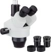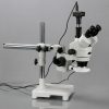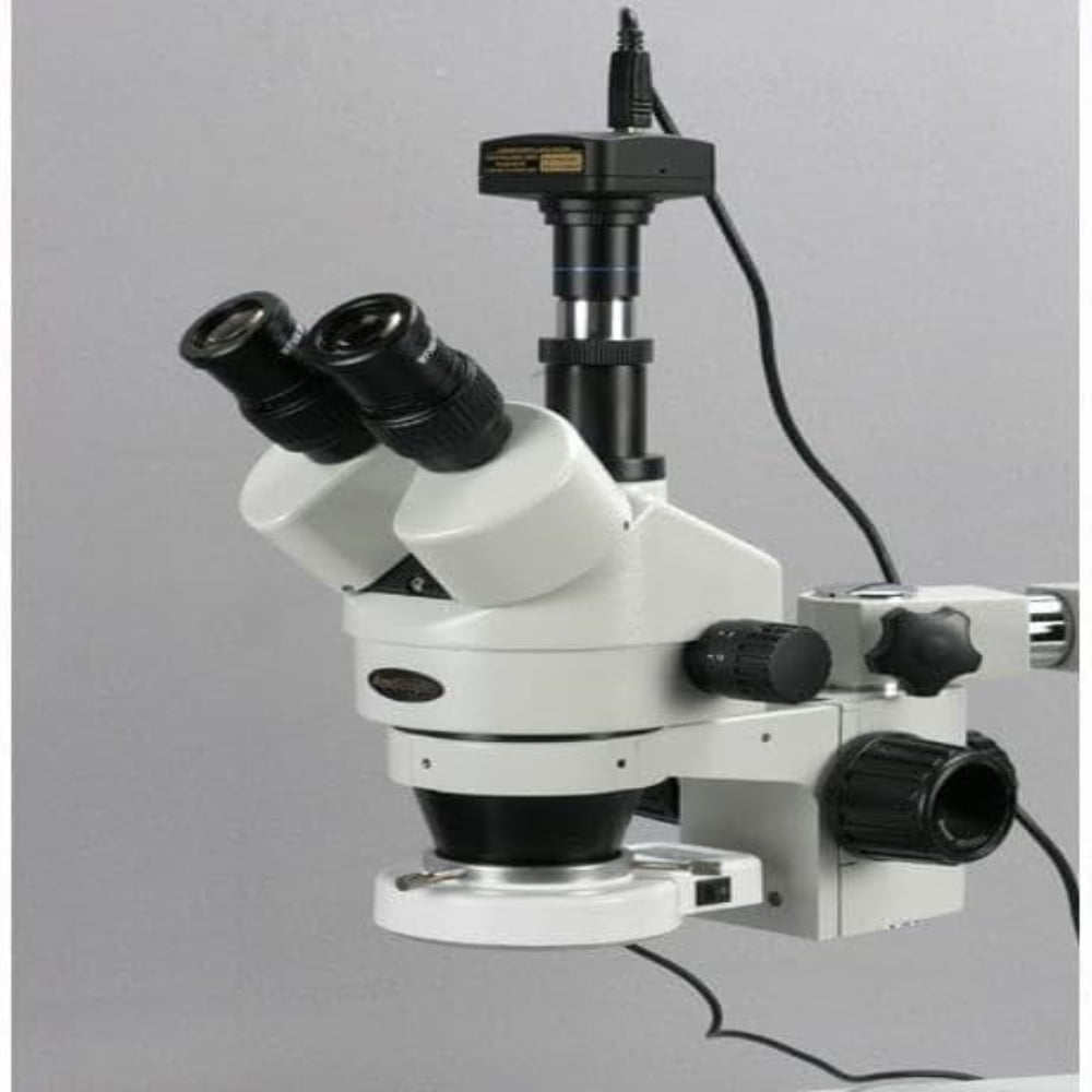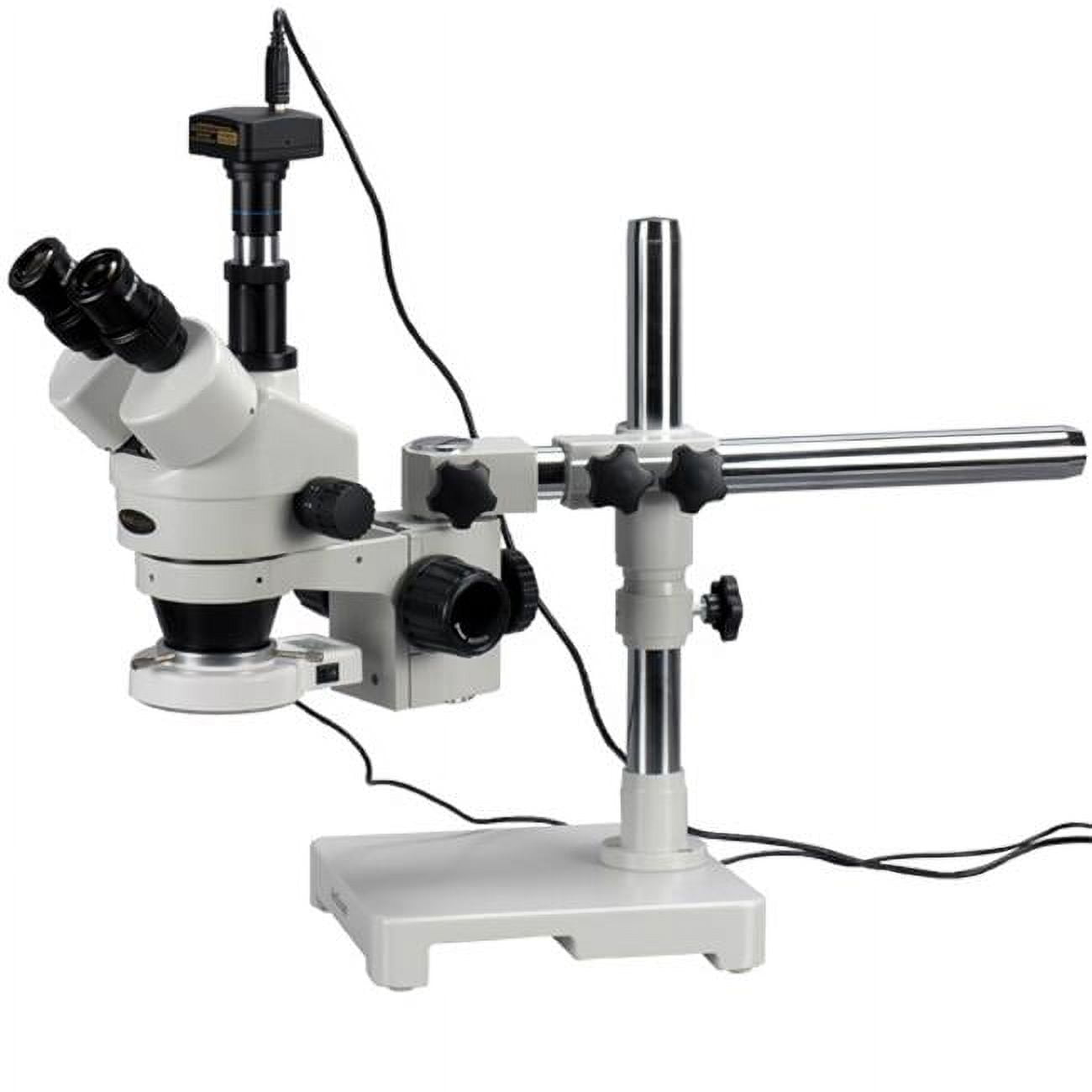 This 7X-45X trinocular stereo zoom microscope is on boom stand. It comes with a trinocular head with super widefield optics, a heavy-duty single-arm boom stand, a 54-LED ring light with dimmer, and a 5MP color digital camera. It offers crystal clear erect stereo images, super widefield of view, large magnification zoom range and large working distance. The high-eyepoint optical design ensures an easy and comfortable observation for all users including eyeglass wearers.