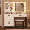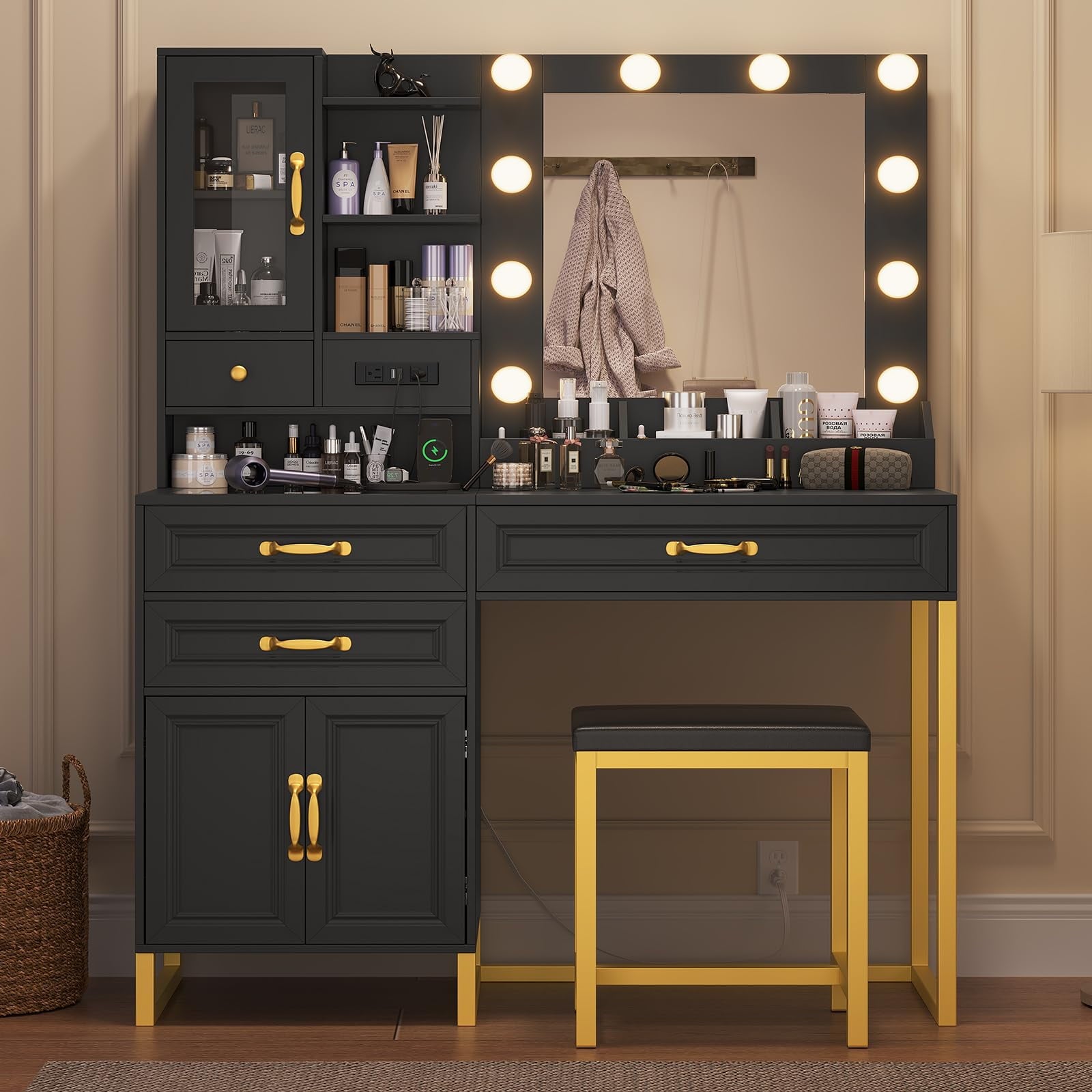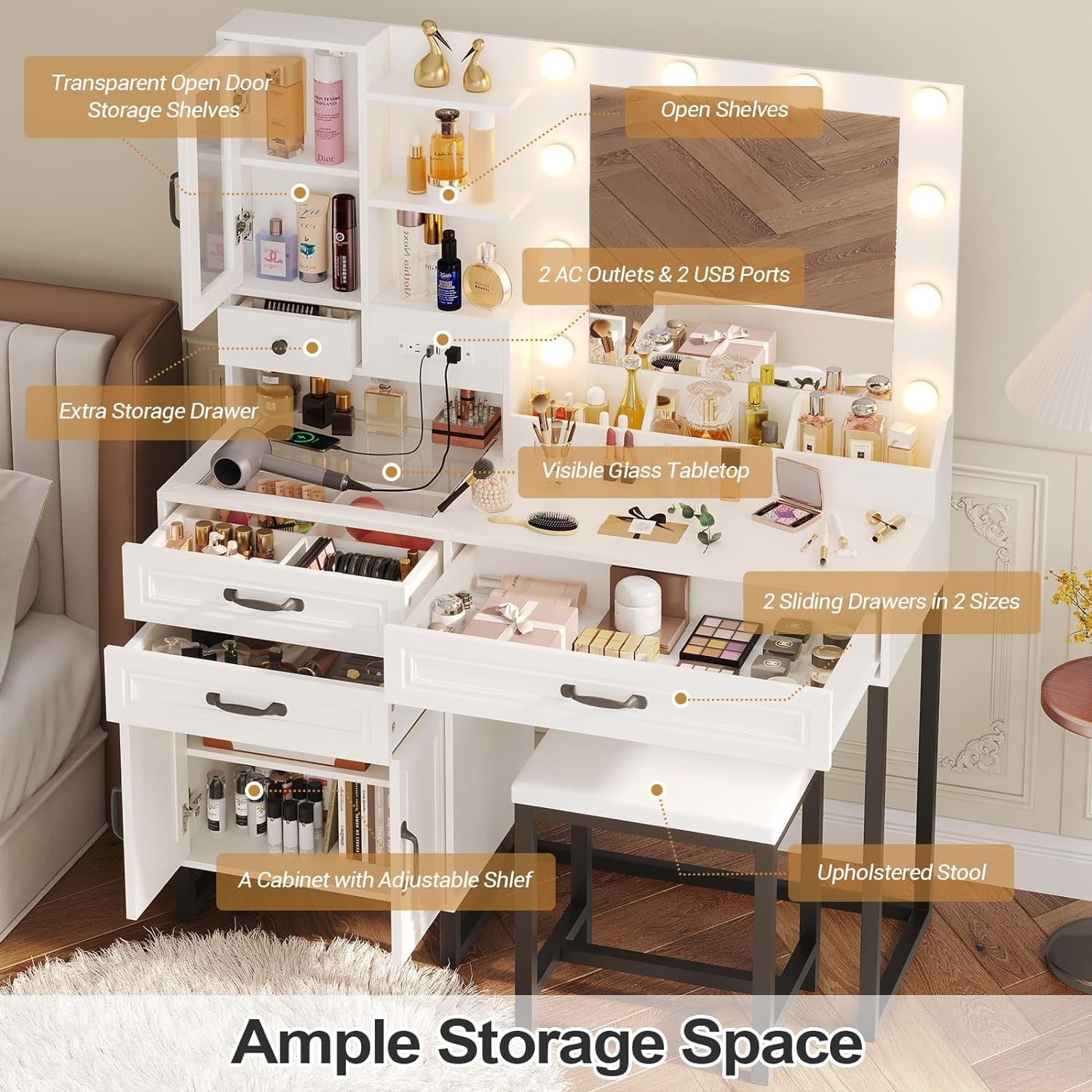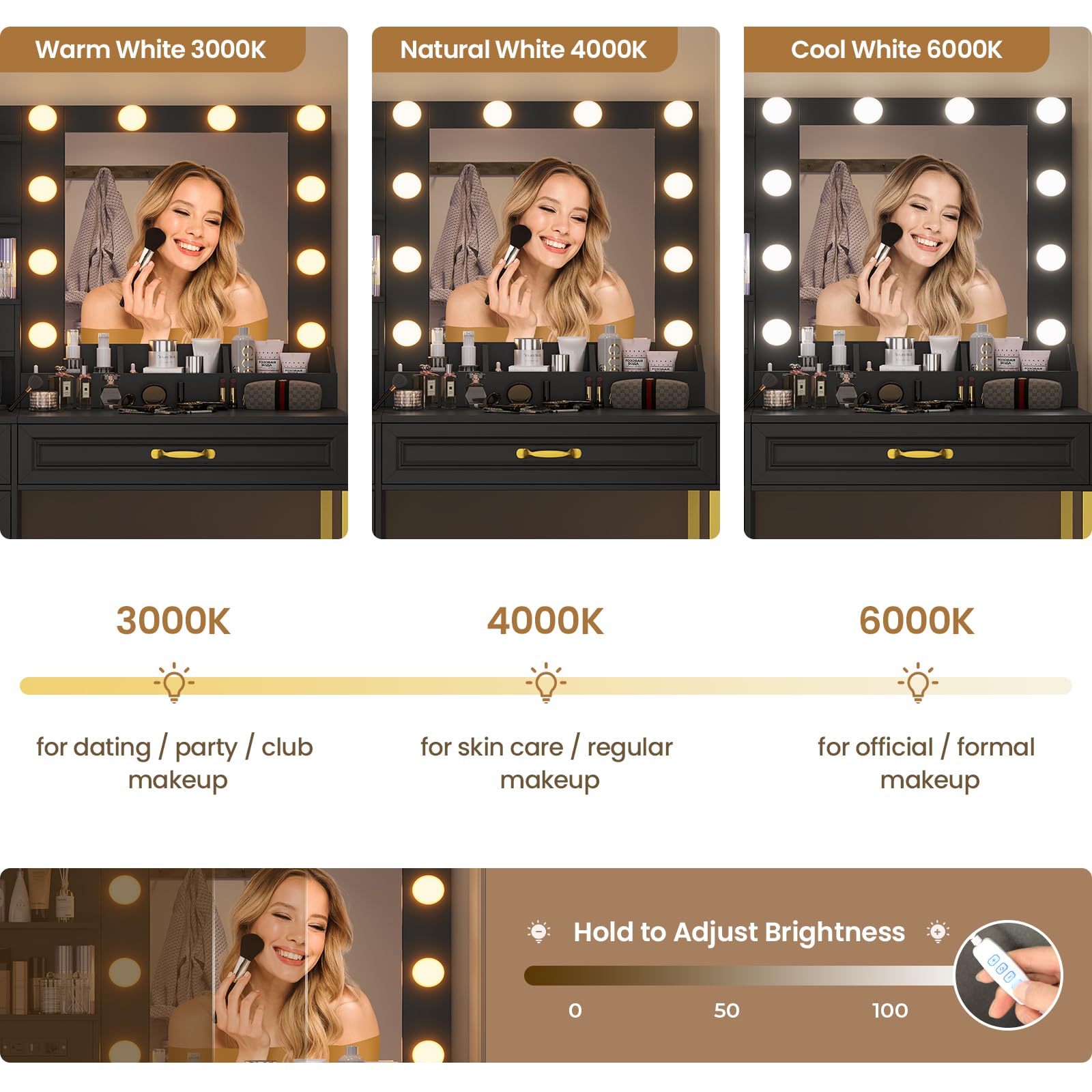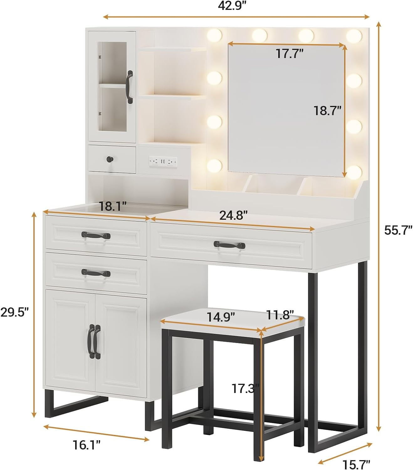 This vanity desk features 10 hollywood-style dimmable light bulbs that have 3 light settings so you can always find the right light to perfect different makeups.Hollywood lights around your mirror, giving you that perfect glow for makeup, selfies, and everything in between. A HUGE mirror so you can check out your outfit and makeup from every angle. No more squinting into tiny mirrors!
