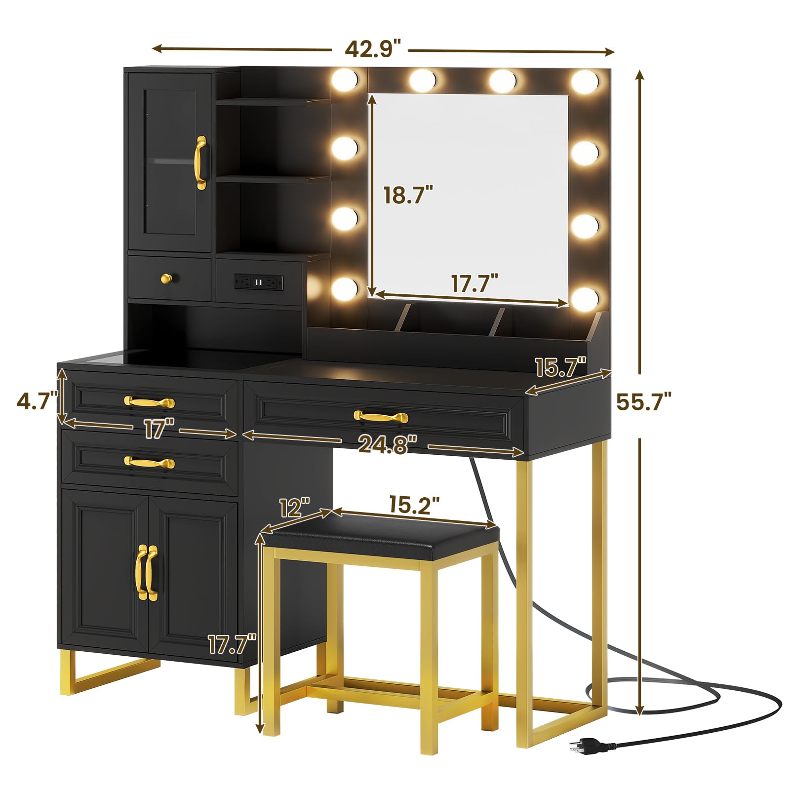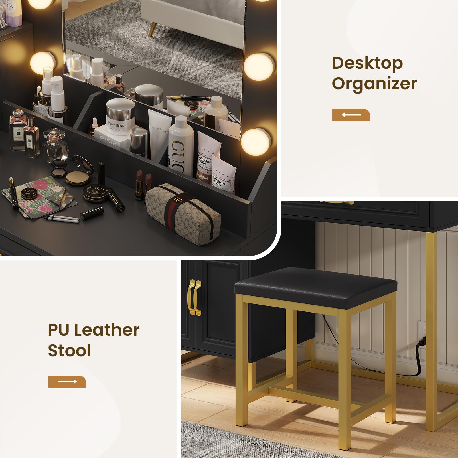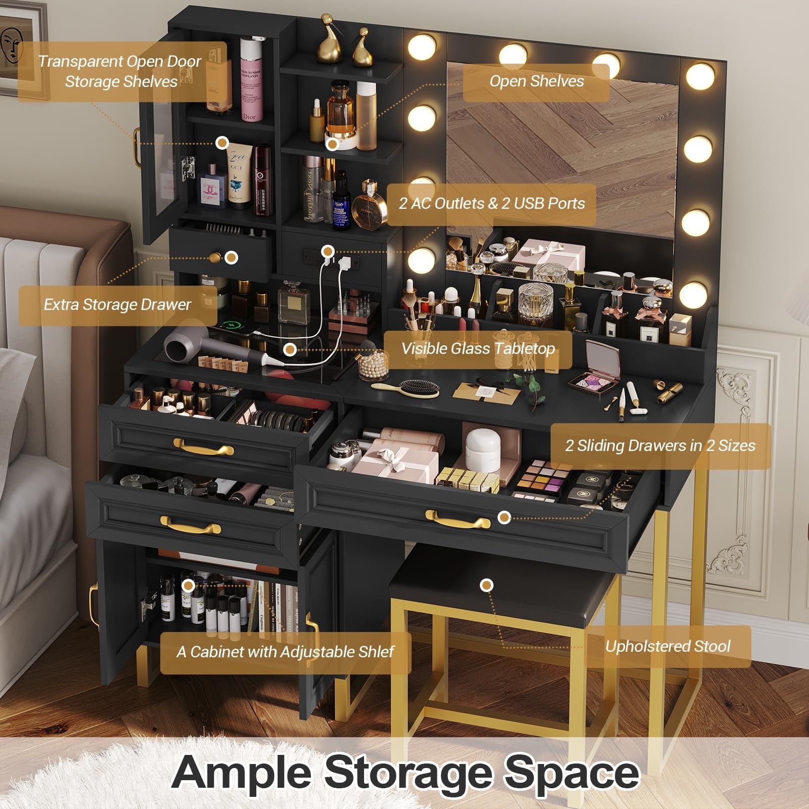 This black and gold vanity comes equipped with a built-in vertical power outlet, strategically placed for easy access. 2 USB ports and 2 AC outlets caters to your hairdryer, straightener, or any beauty tool.This modern vanity is made of P2 Grade MDF board and quality steel, which is eco-friendly, sturdy and stable.