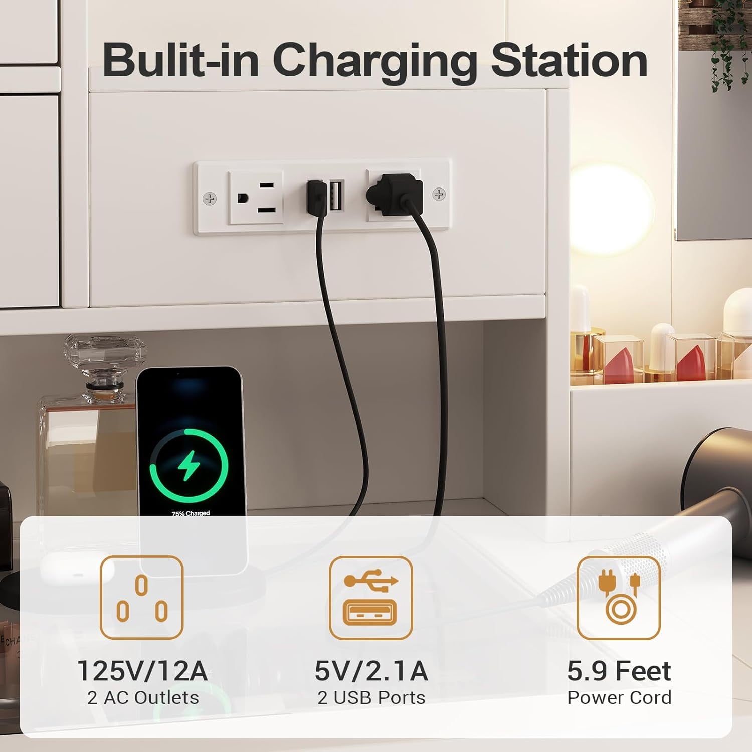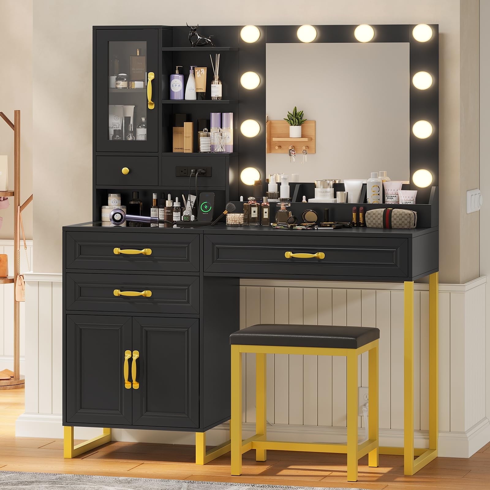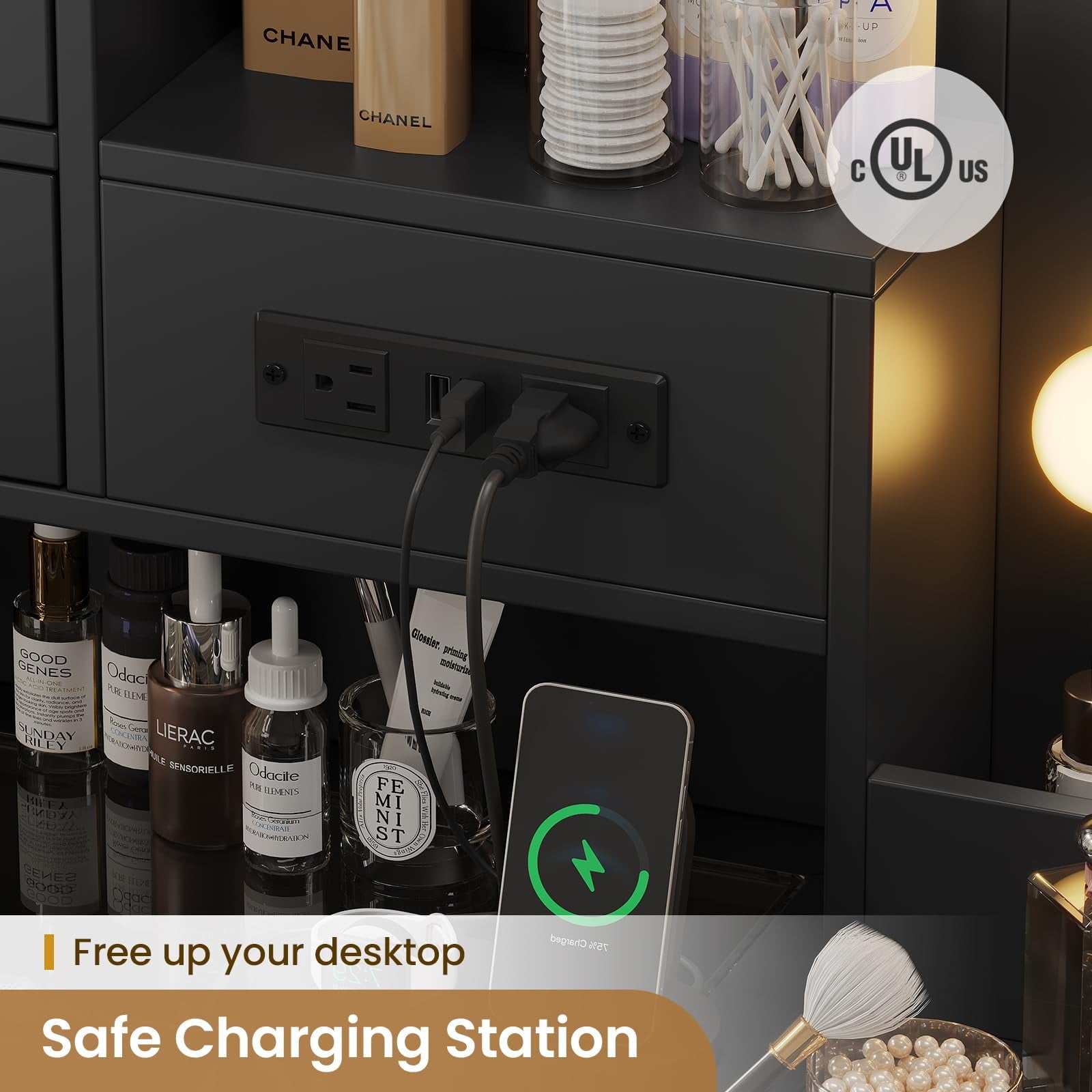 This black and gold vanity comes equipped with a built-in vertical power outlet, strategically placed for easy access. 2 USB ports and 2 AC outlets caters to your hairdryer, straightener, or any beauty tool.This modern vanity is made of P2 Grade MDF board and quality steel, which is eco-friendly, sturdy and stable.