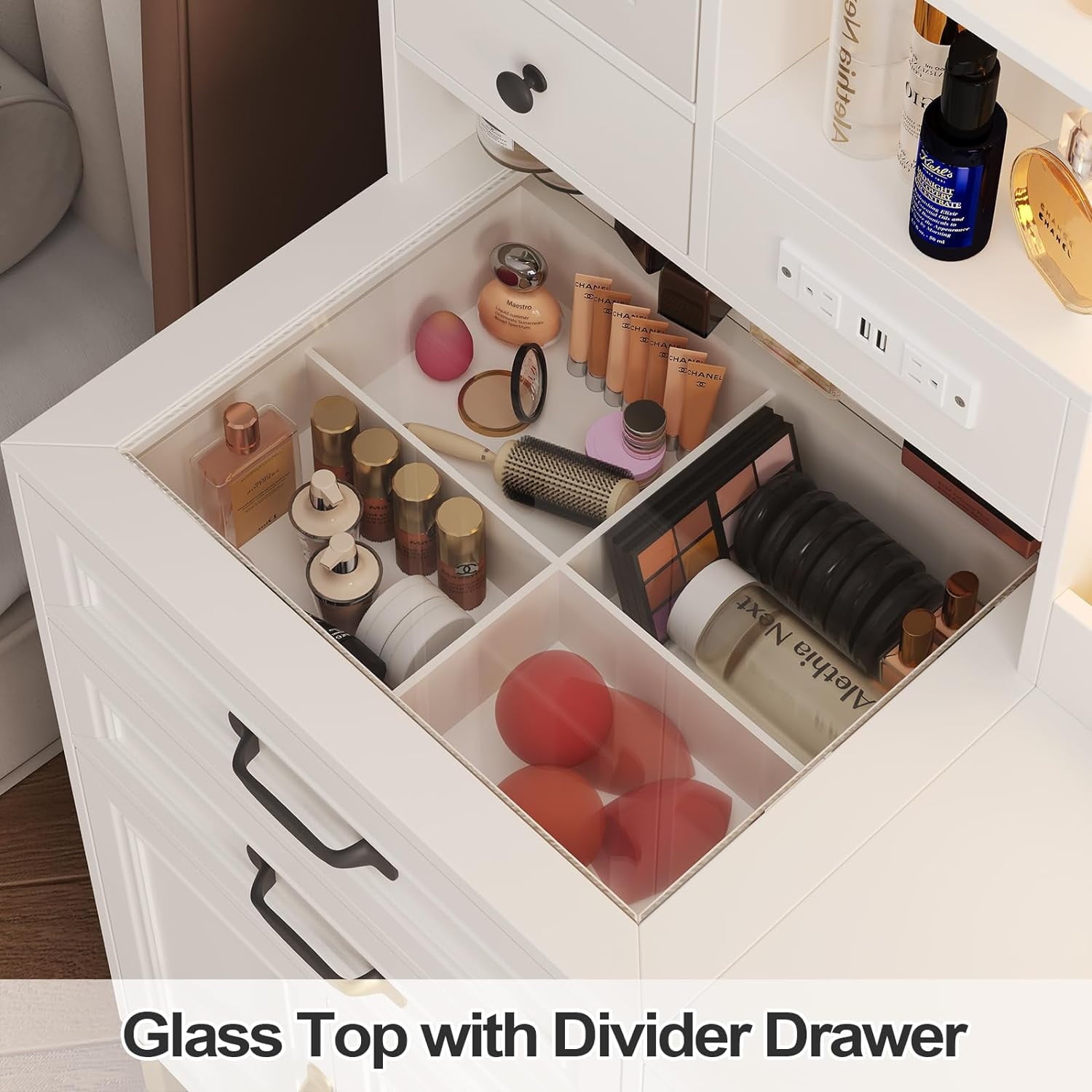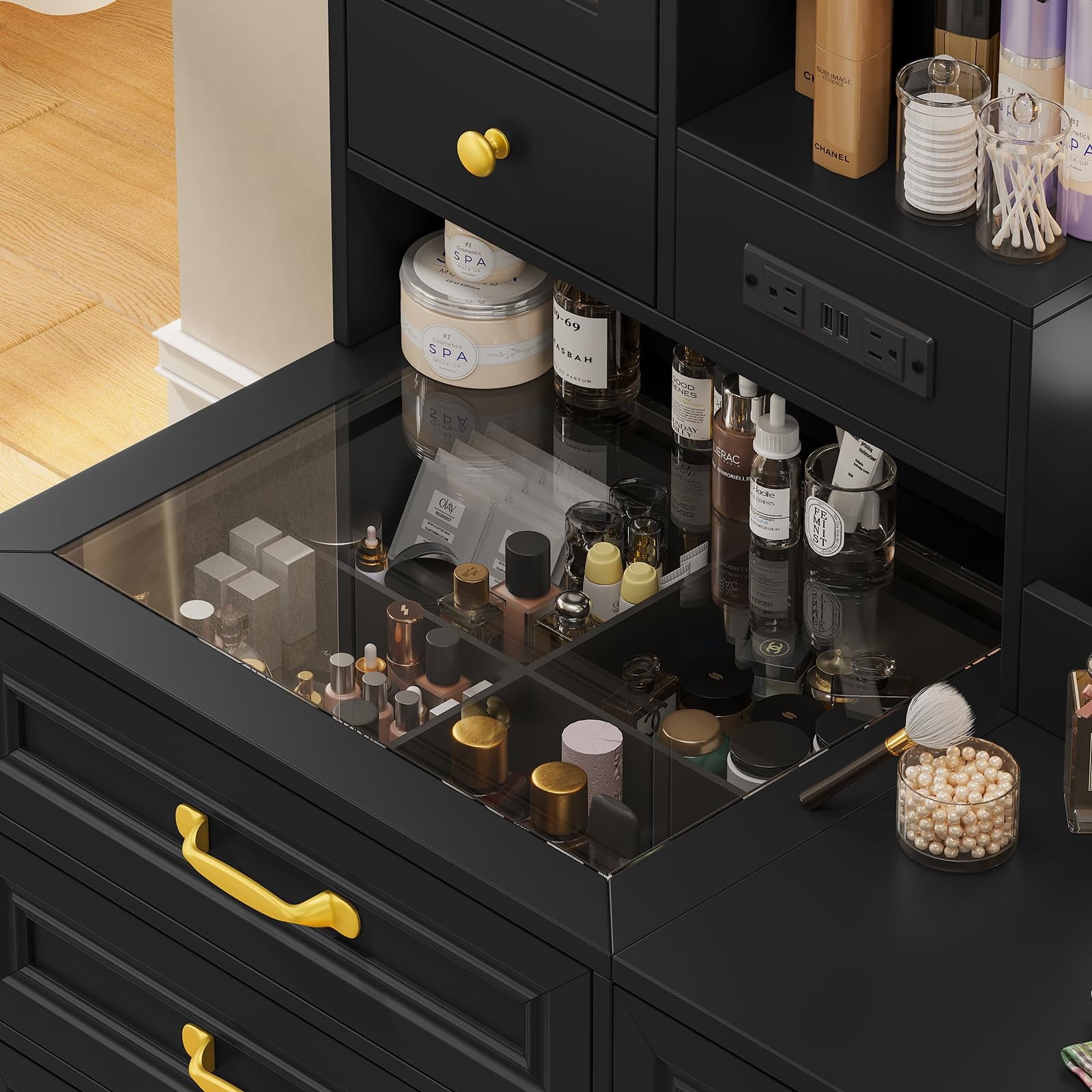 This vanity set has 4 spacious drawers, 1 glass front cabinet, 1 double door cabinet, 3 open shelves and 3 desktop organizer. From makeup and brushes to hair accessories and skincare products, everything has its place. This vanity features a clear glass top, revealing what’s inside the lower drawer. Easy to find and take what you need.