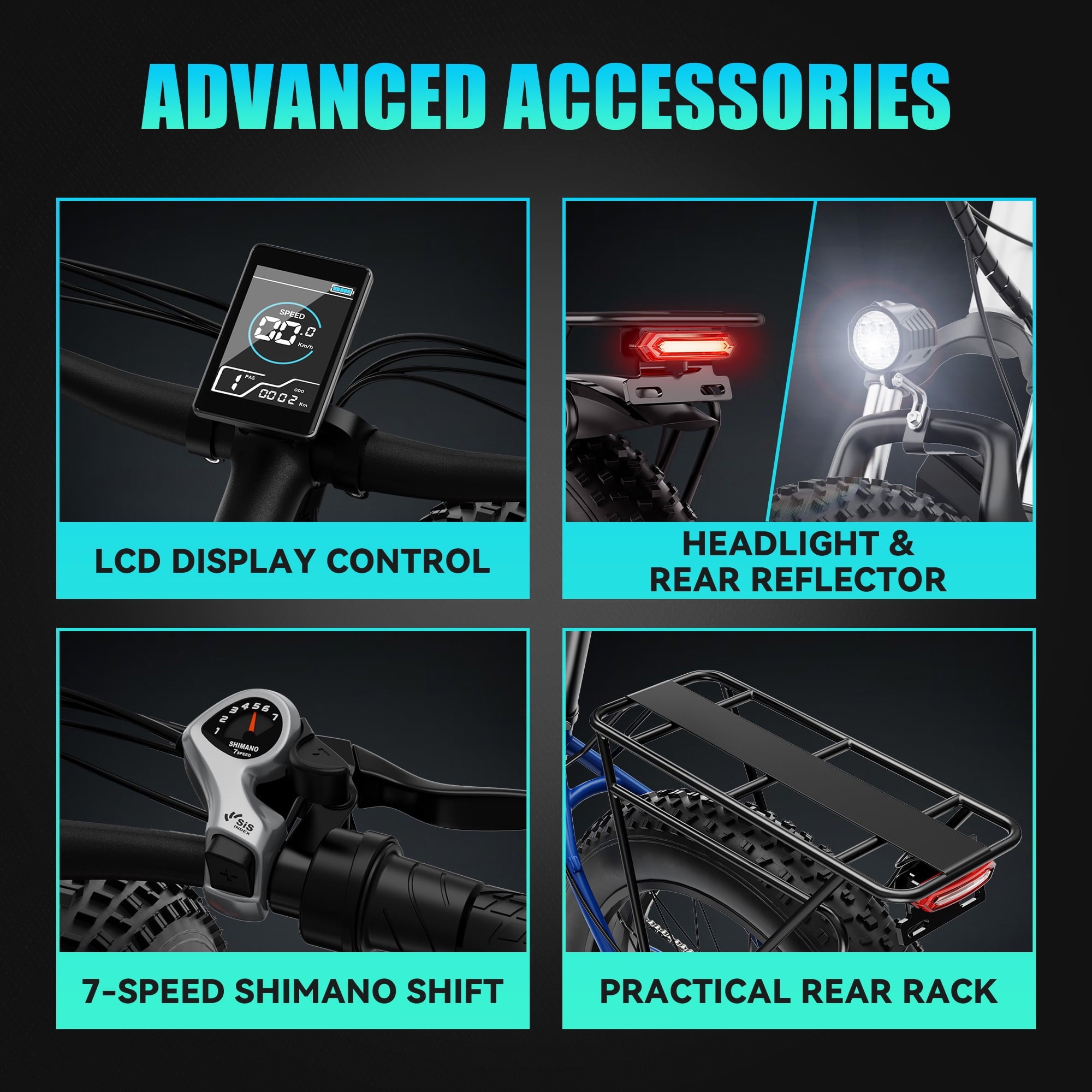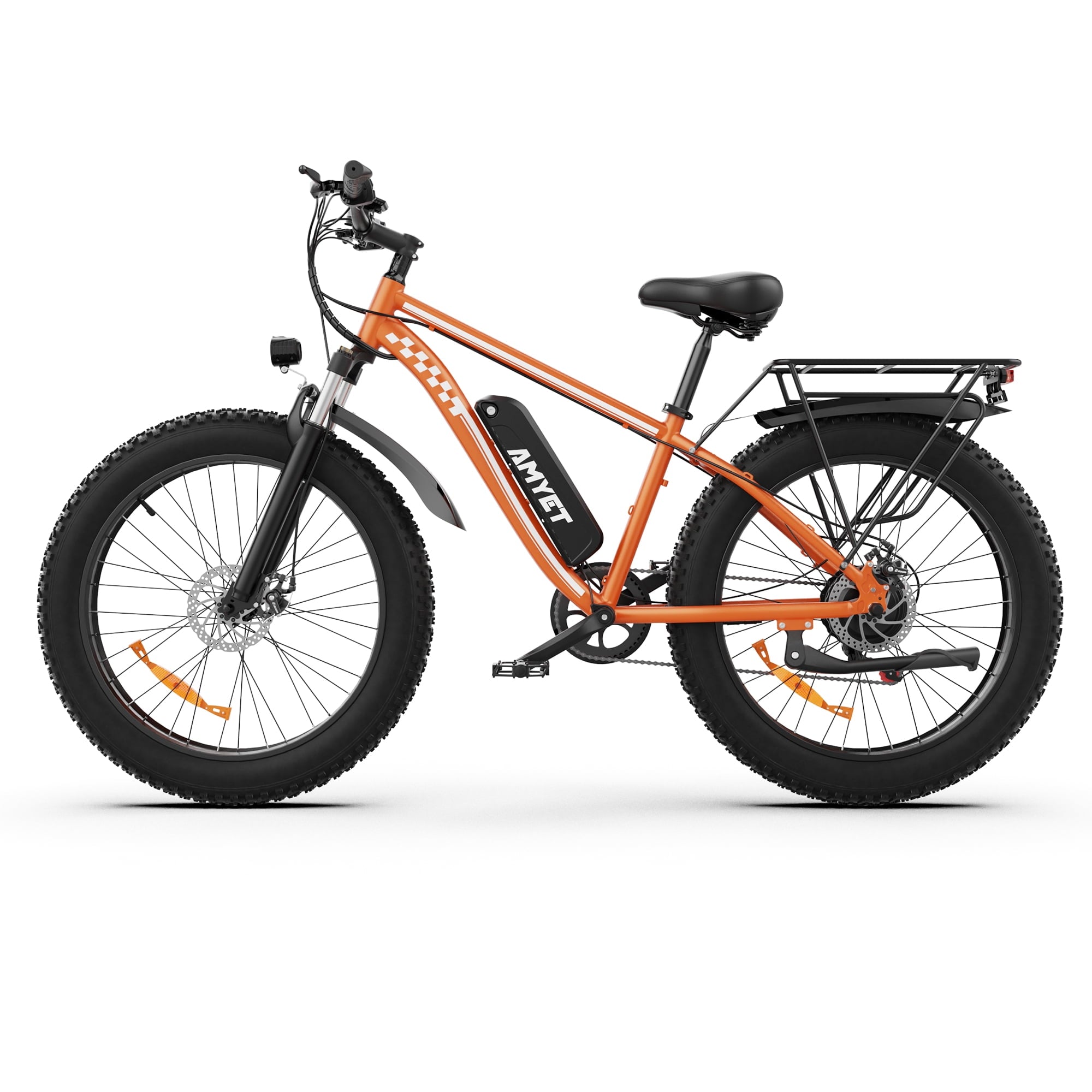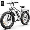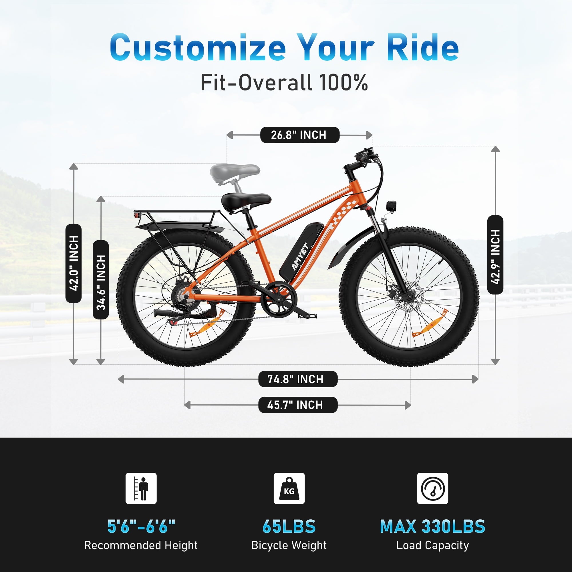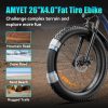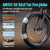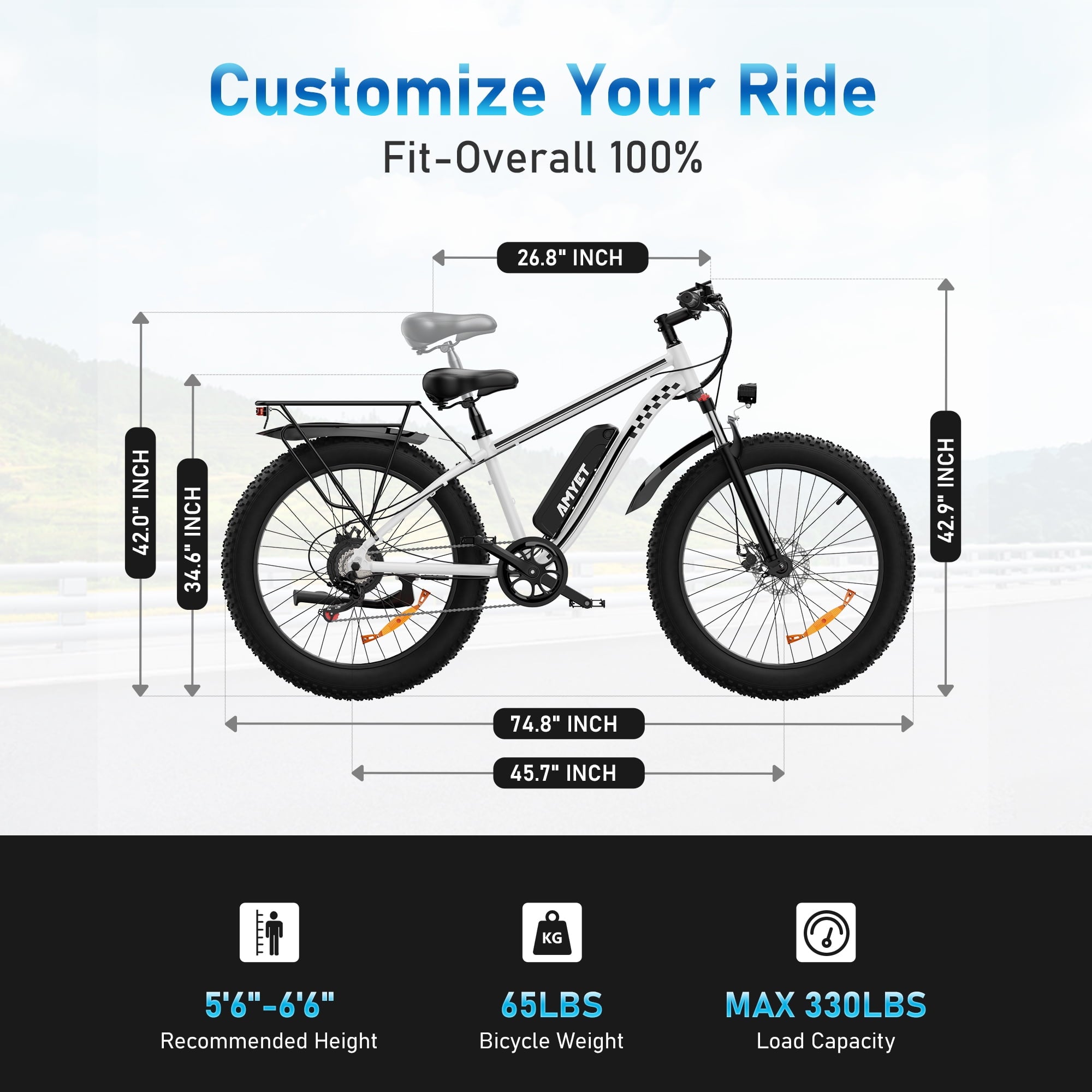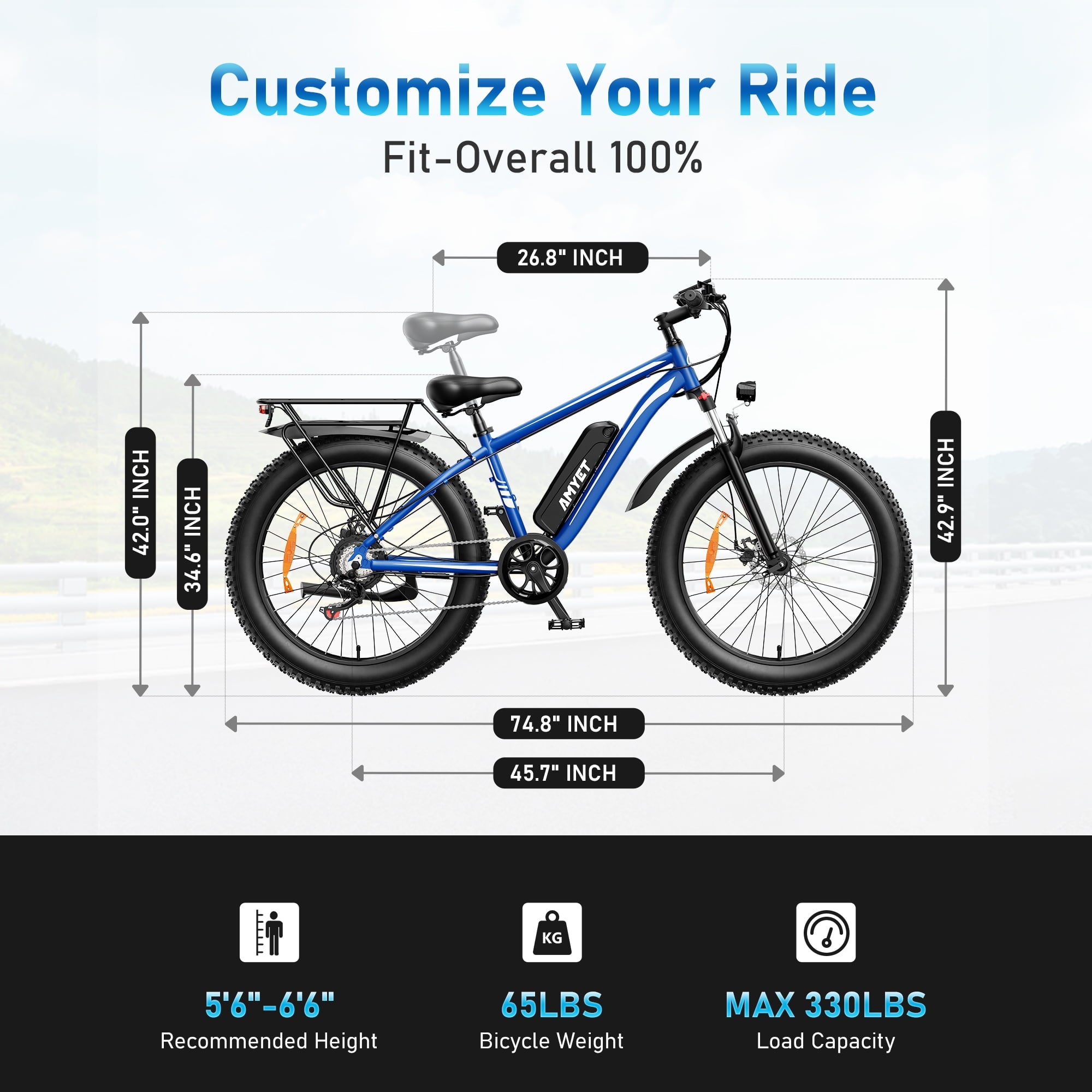 Ready to take on any off-road adventure? The AMYET EB26 fat tire electric mountain bike for adults is your ticket to fun, whether you’re exploring rugged trails or tackling challenging terrains. Powered by a 1000W brushless motor (Peak 1500W), this e bike zooms up to 28-32MPH(Depends on rider weight). With 80NM torque, hills and steep paths are no match for you! The 26″ x 4″ fat tires ebike give you unbeatable traction on snow, sand, and everything in between. The 48V 15Ah battery gives you up to 38 miles on a full charge in pure electric mode and up to 65 miles in PAS mode. The dual shock suspension keeps your ride smooth and comfy. Plus, with Shimano 7-speed gears and a 330 lbs load capacity, this adult ebike’s ready for all kinds of riders and all kinds of off-road adventures.