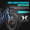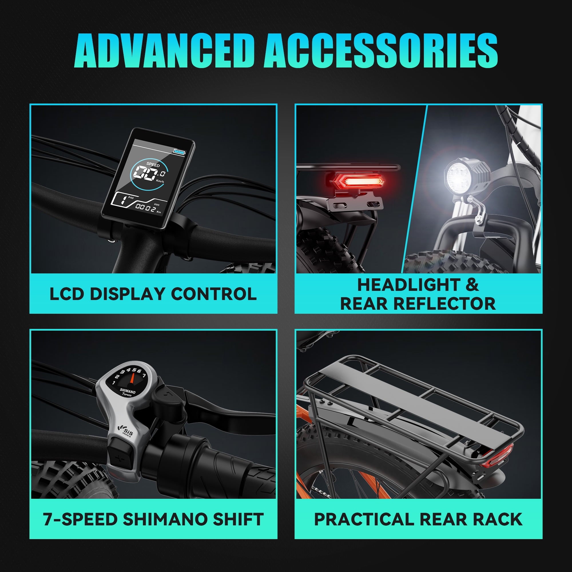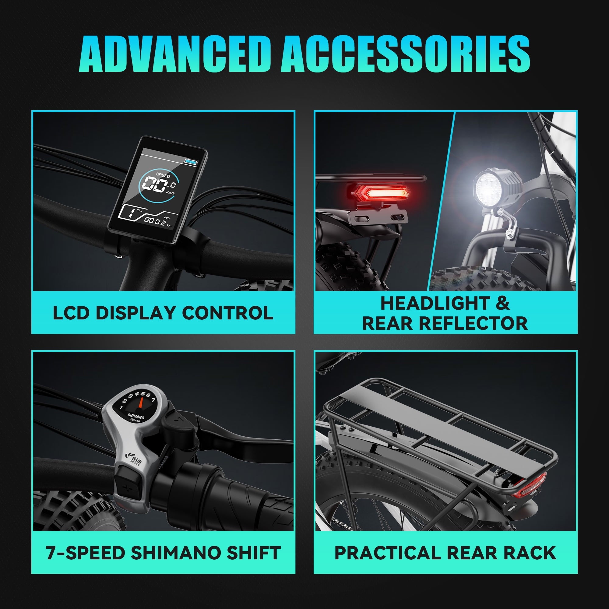 - Fat Tires (26″ x 4″) e Bike: Excellent traction and stability on snow, sand, muddy path, and rugged mountain.
