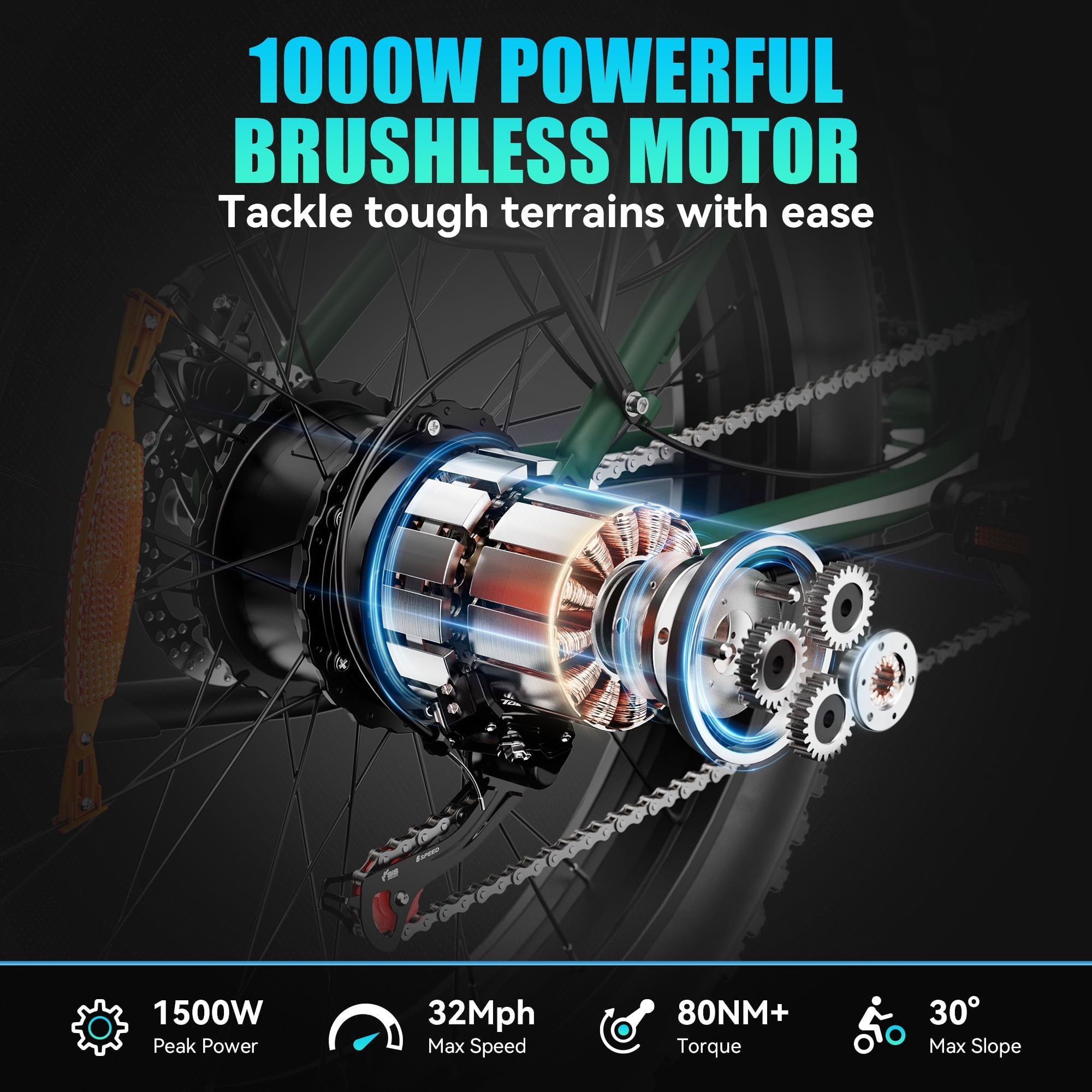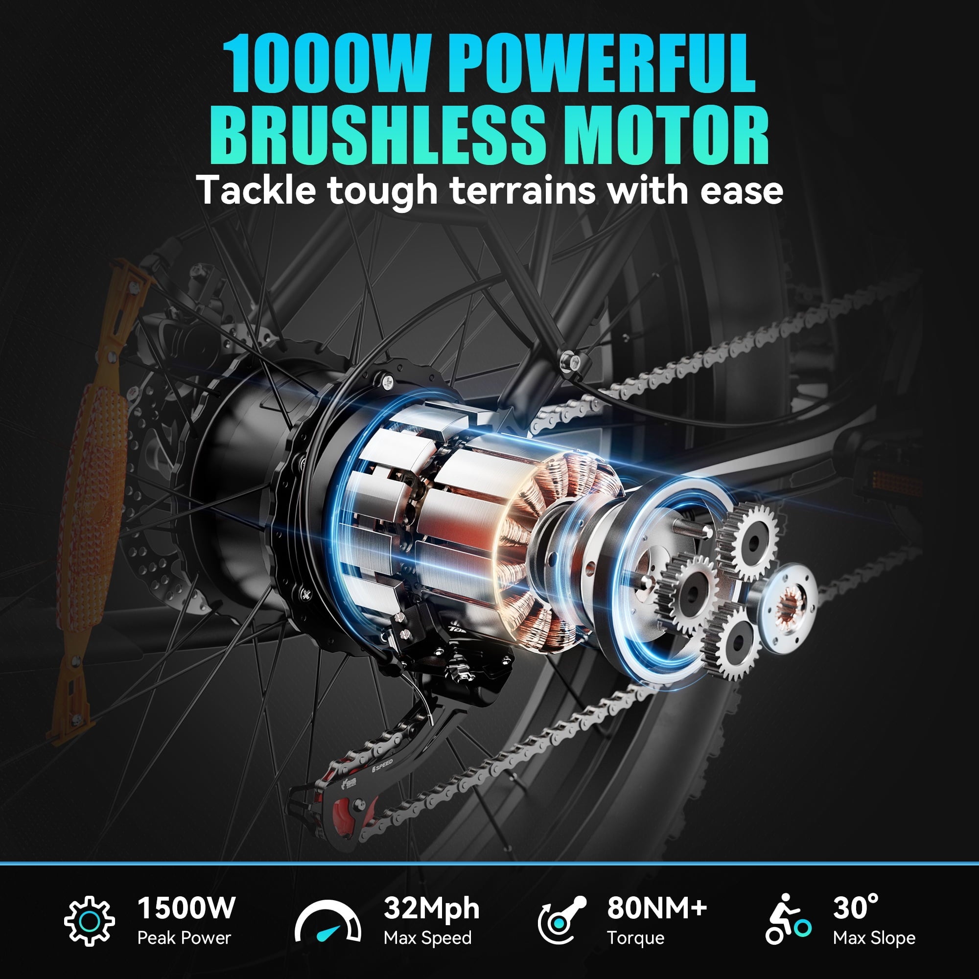 - Peak 1500W Brushless Motor: The AMYET EB26 is equipped with Peak 1500W motors(continuous power 1000W), delivering powerful performance for effortless climbs and off-road adventures, easily reaching 28-32MPH.
