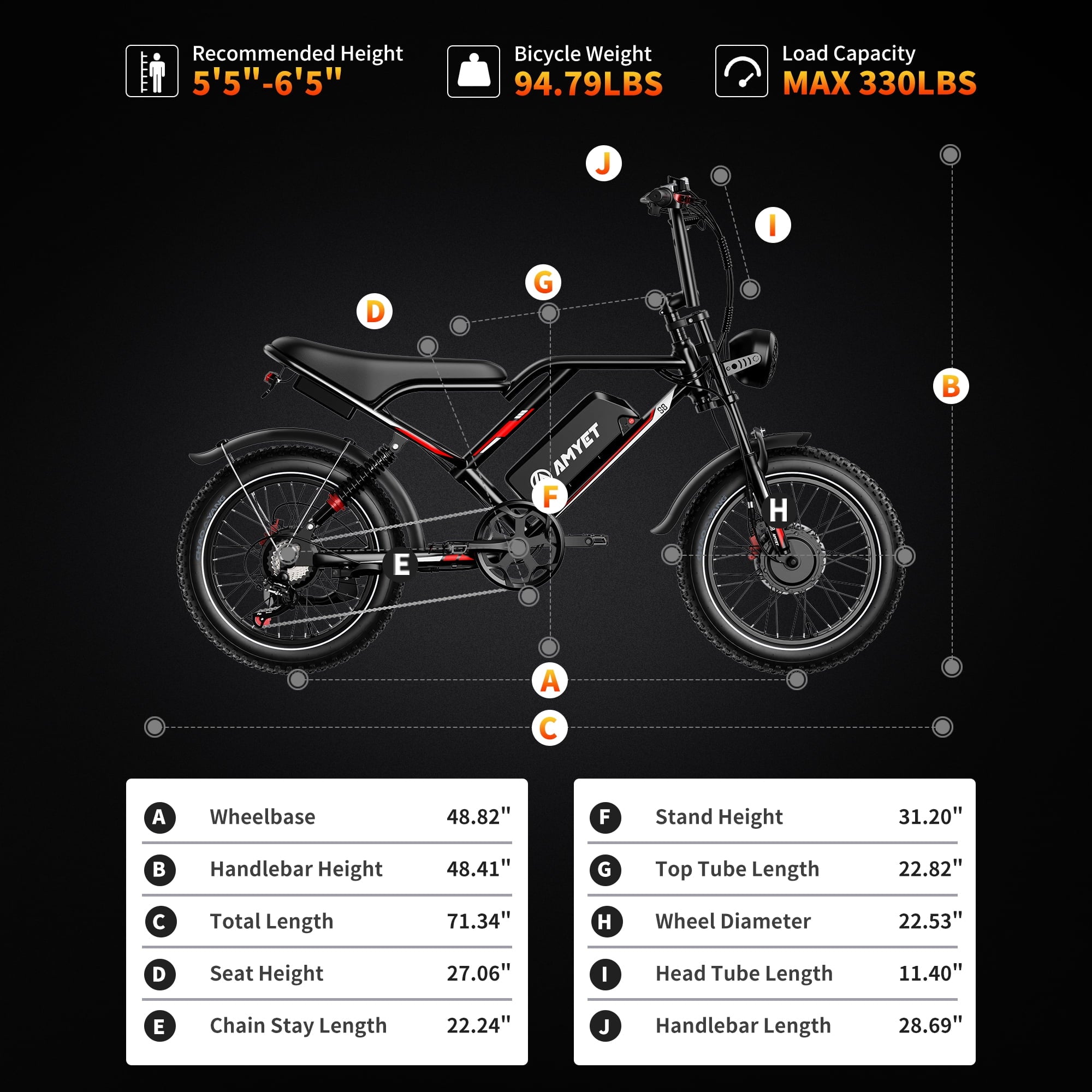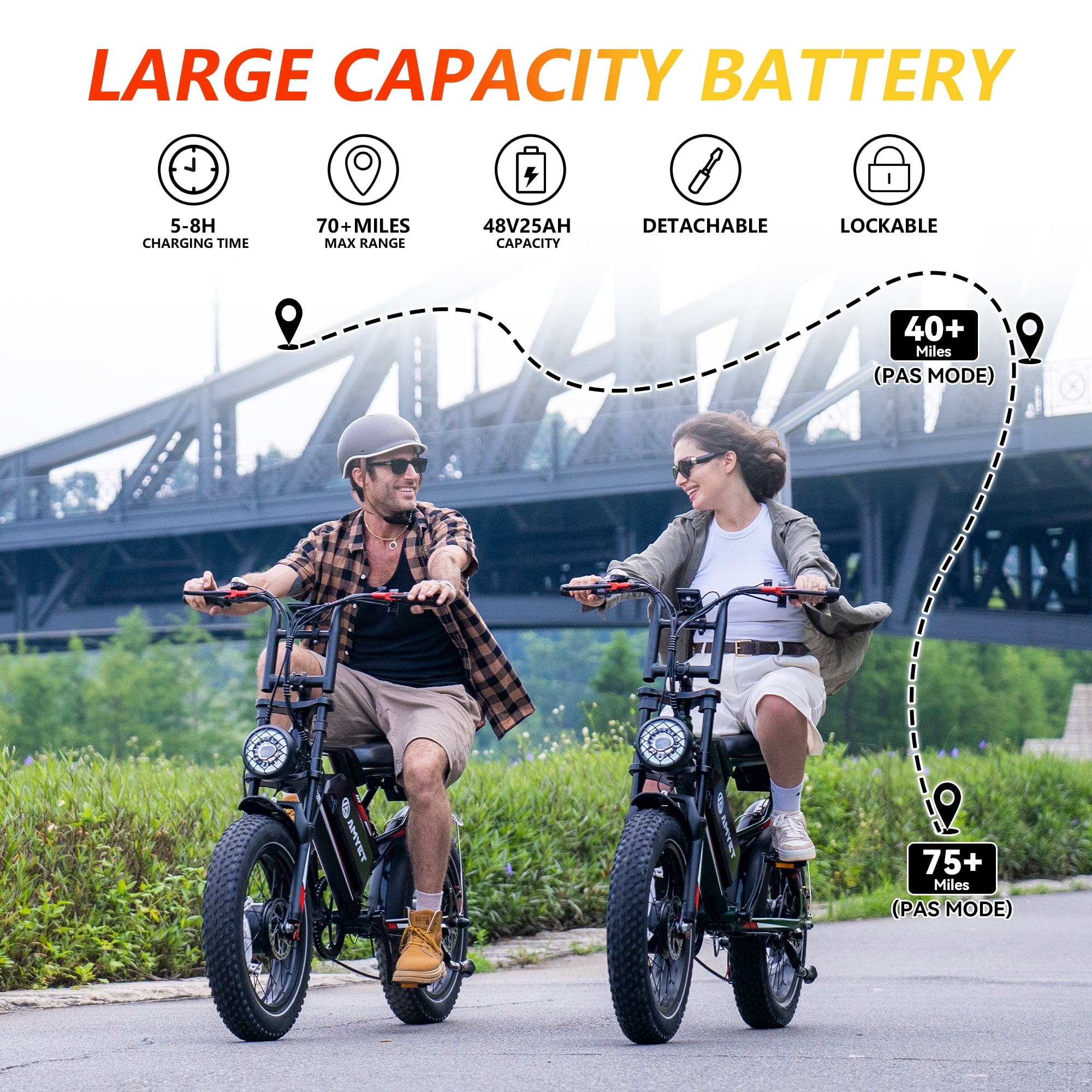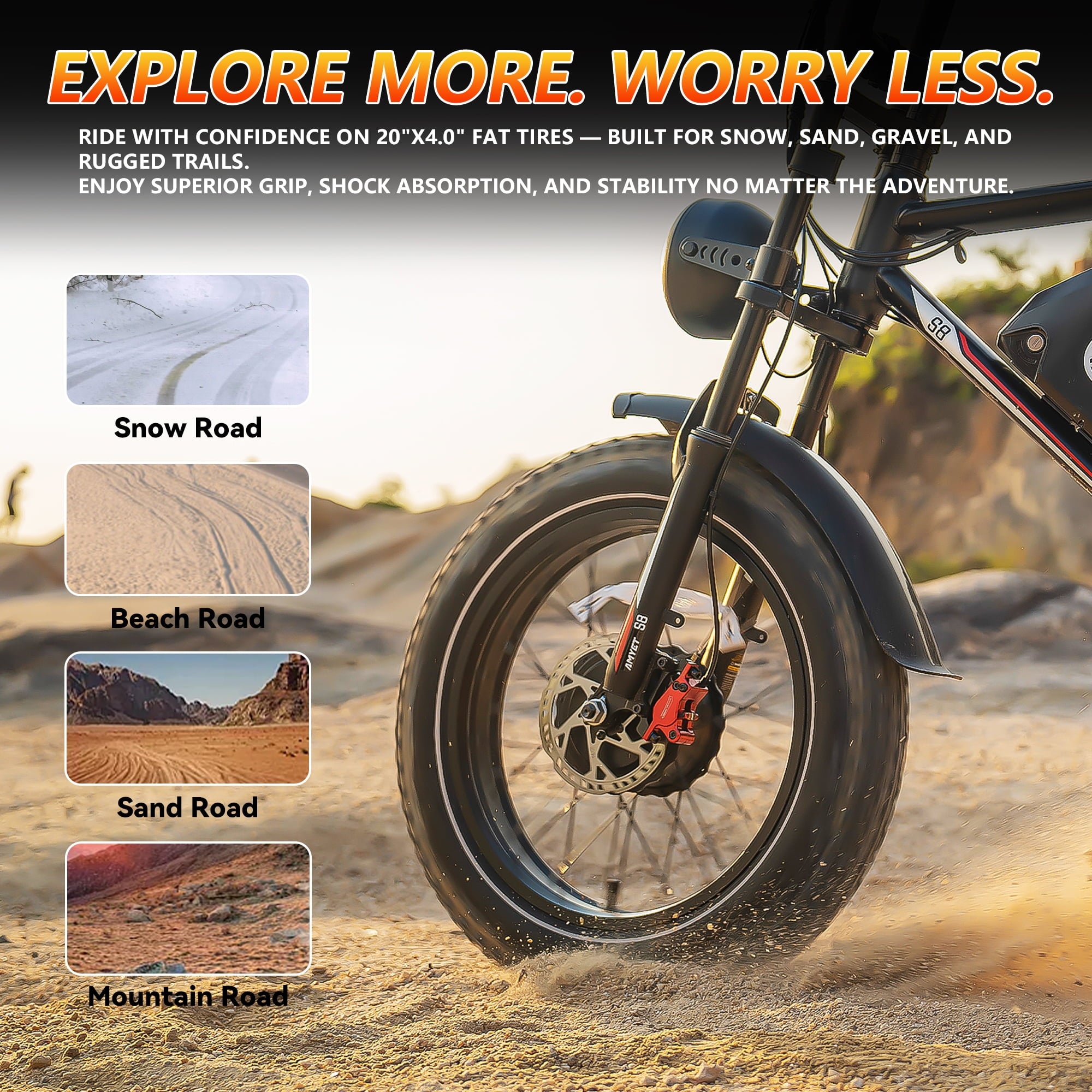 Ready to make a statement and take on any adventure? The AMYET S8 Fat Tire Electric Bike for adult is here to blend retro charm with modern muscle. Powered by Peak 3000W dual motors, this adult ebike gives you effortless acceleration and the power to conquer steep hills and rocky trails with ease. Whether you’re cruising through the city or off-roading on sandy paths, the dual motor electric motorcycle ensures you’re always in control with enhanced traction on all terrains. With a 48V/25Ah battery, the S8 lets you travel up to 75 miles on pure electric power, or 140 miles in pedal-assist mode—long rides without range anxiety, that’s freedom! The 20″ x 4.0″ fat tires provide solid grip, while the hydraulic disc brakes deliver strong stopping power. Add in a dual suspension system for a smooth, comfortable ride, and you’re all set for any terrain. Ready to turn your weekend adventure into an unforgettable experience? The S8 electric mountain bikes your perfect companion.