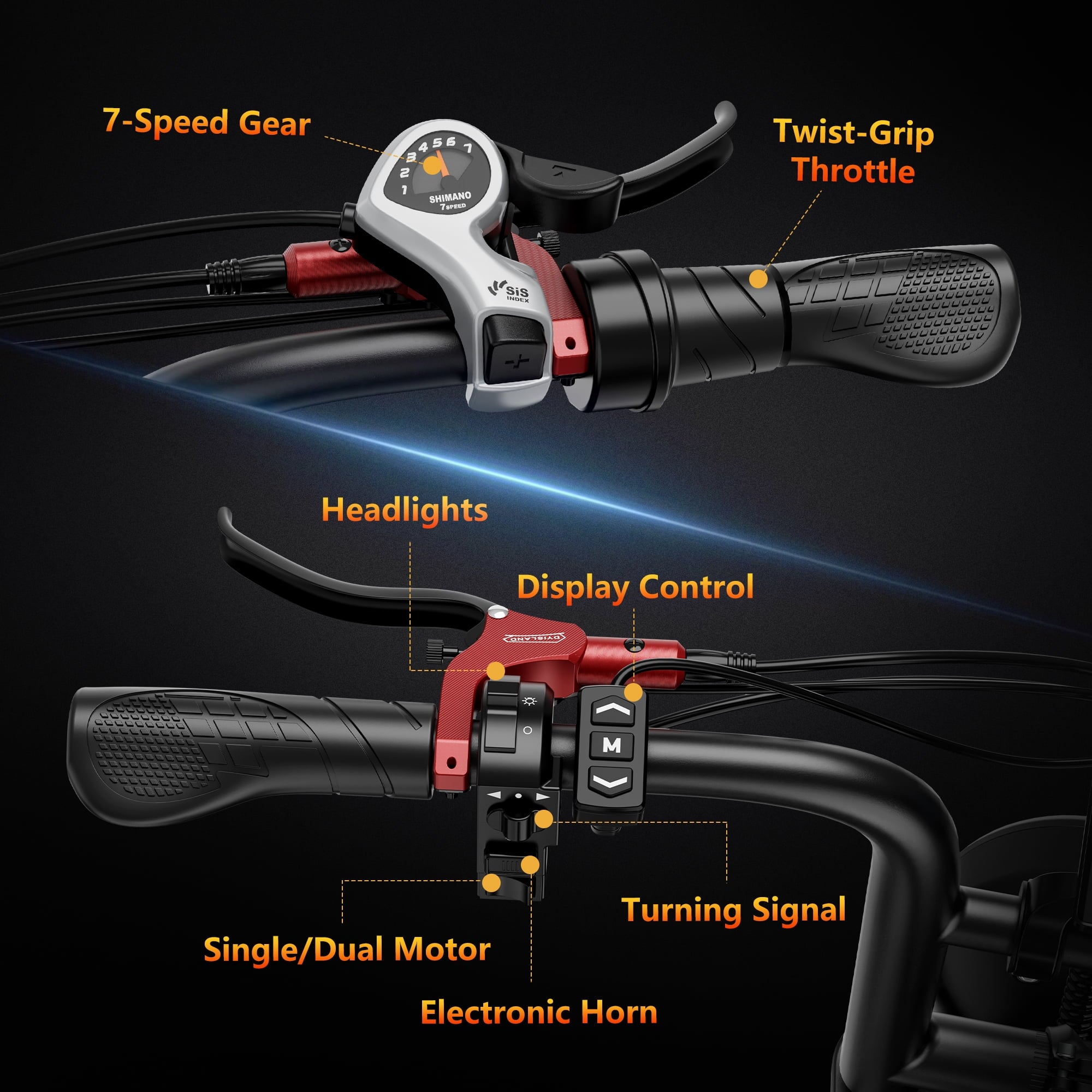 - Peak 3000W Motors: The AMYET S8 is equipped with dual 1000W motors (Peak 3000W), delivering powerful performance for effortless climbs and off-road adventures. You could choose the way of single or dual motor, depending on your ride needs.