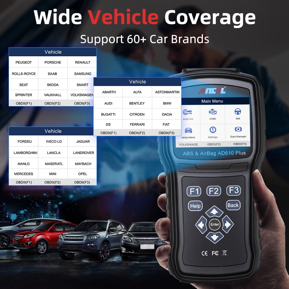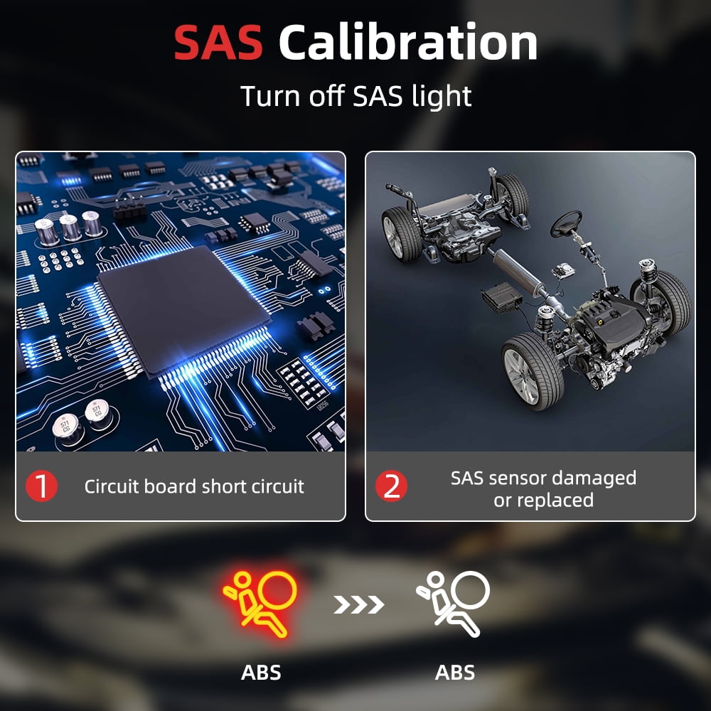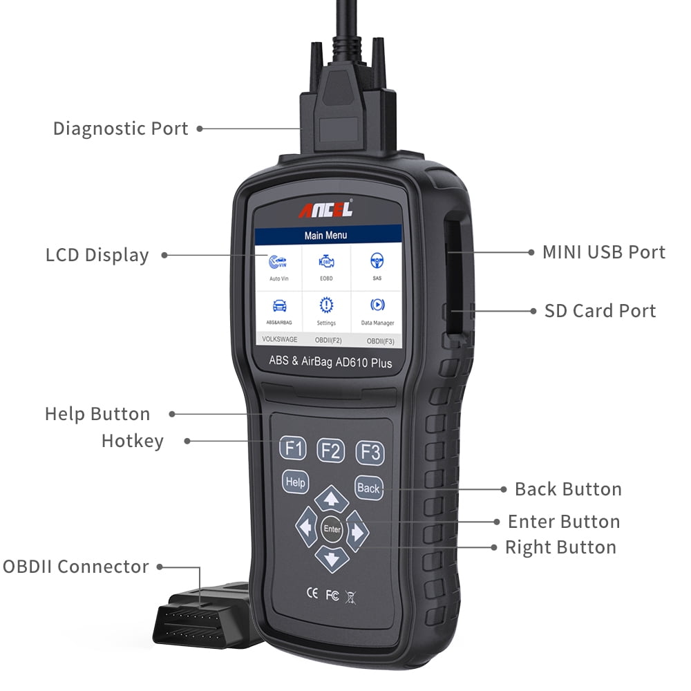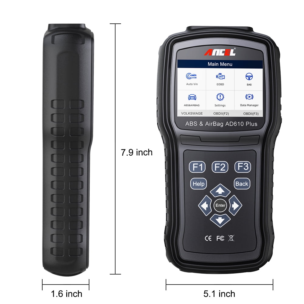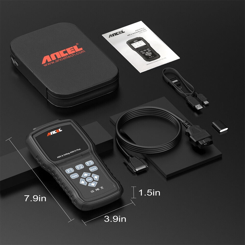 ANCEL AD610 is a professional scanner for systems of ABS, SAS, SRS and engine.  Supports 3 frequently asked functions, such as ABS reset, read and repair ABS system, bleed test for removing air from the internal brake fluid chambers.  Reset steering wheel angle sensor for SAS system.  Read and clear warning lights for SRS(airbag) and engine system.