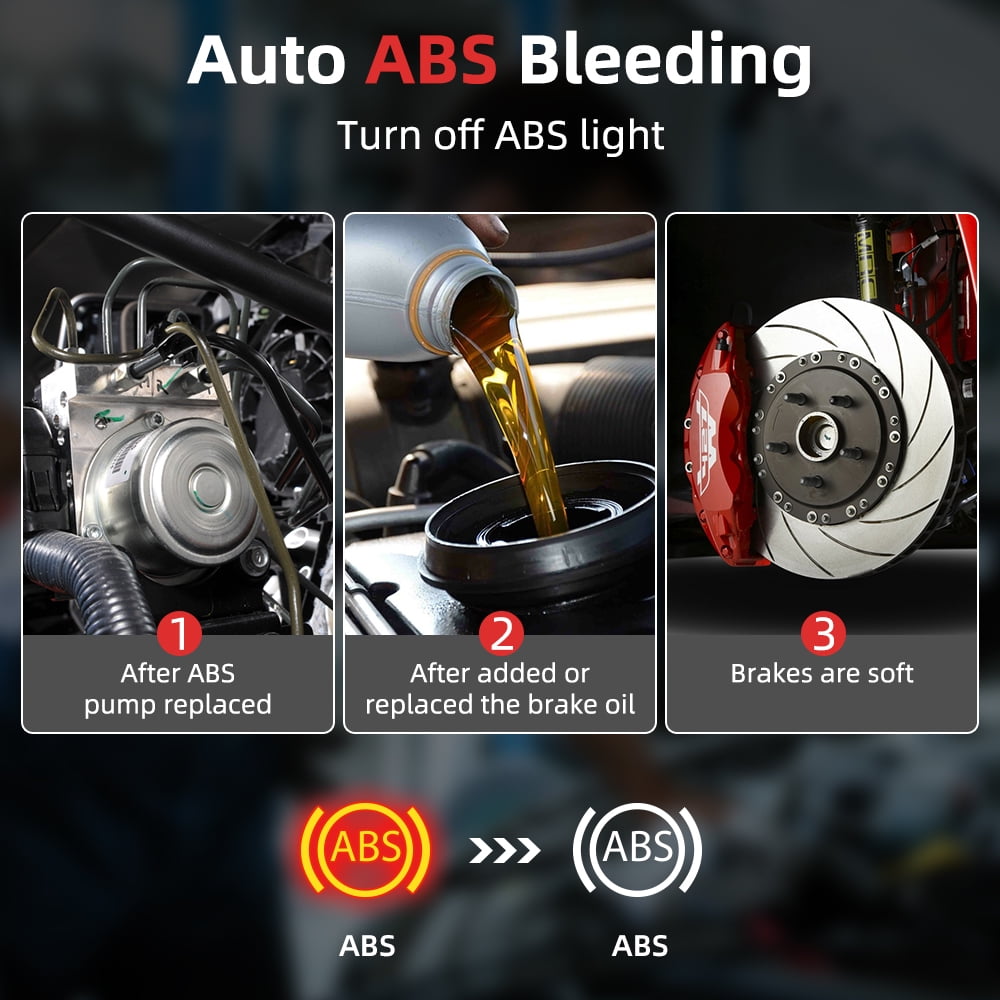 3. Test ABS (Anti-lock Braking System), Reads and clear codes, turns off ABS warning indicator and ABS Service Reset