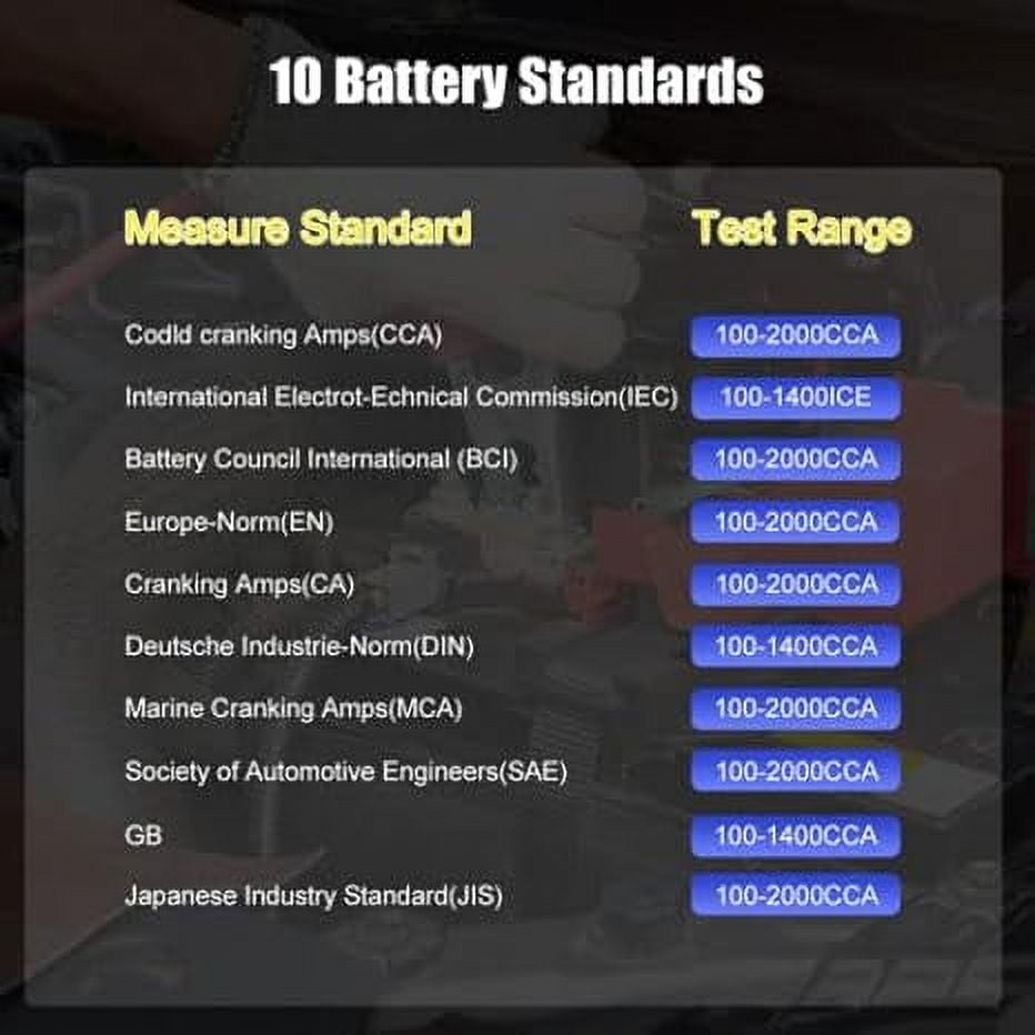 ANCEL BST100 battery load tester is capable of testing all 12V 100-2000CCA batteries, including ordinary lead acid battery, AGM flat plate battery, AGM spiral battery, Gel battery and etc. It provides a comprehensive analysis of the battery health to help you clear about the status of your battery before it runs out. The test results are based on CCA,IEC,EN,DIN,JIS,GB,SAE,MCA,BCI,CA standards.