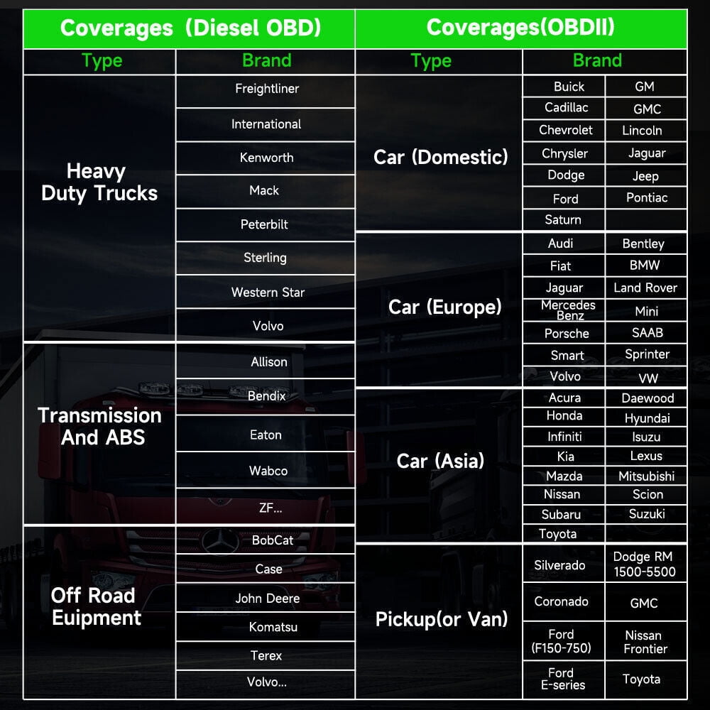 This Bluetooth diagnostic device support diesel OBD full system diagnostics for diesel trucks/pickups, including Engine, ABS, Transmission, Tire Pressure, Body Controller, Instrument Cluster, Brakes, Communication Unit, Aftertreatment, SART Module, etc. As long as your truck complies with the agreement, you can diagnose the system and cover a wide range of models.