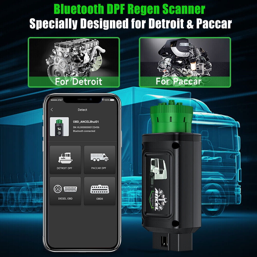 - ♻️DPF Regen Directly Anywhere: The HD110 modern semi-truck scan tool ’s DPF Regeneration Clears Clogged Filters in Minutes! Stop paying for costly trips to the shop. Perform on-demand DPF regen directly from your cab-anytime, anywhere. Keep your truck running strong with fewer breakdowns and better fuel efficiency. Compatible with all major engines (Detroit, Paccar).