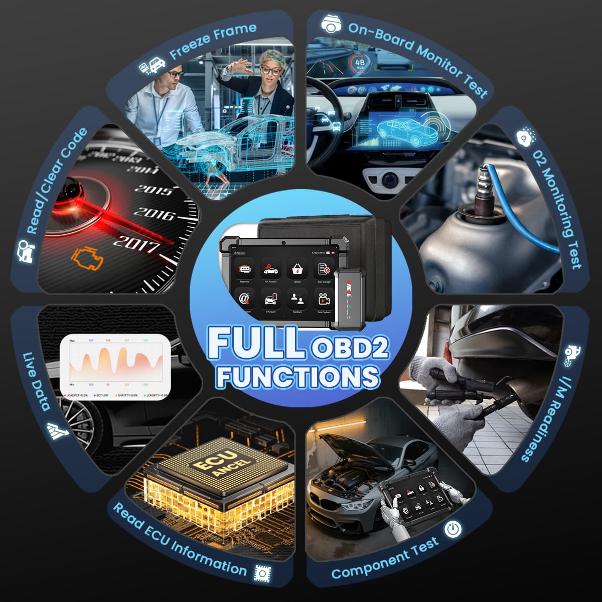 ANCEL X7 10.1-inch tablet obd2 scanner is capable of reading and clearing trouble codes of all major systems, including Engine, Airbag/SRS, Transmission, ABS, SAS, Air Conditioning, ACC, Audio, Headlight, Center Lock, ESP, Suspension failures, etc.By automatically scanning every available electronic system in the car with one click Auto VIN, X7 OBD scan tool can help you identify the faults and problems of each system.