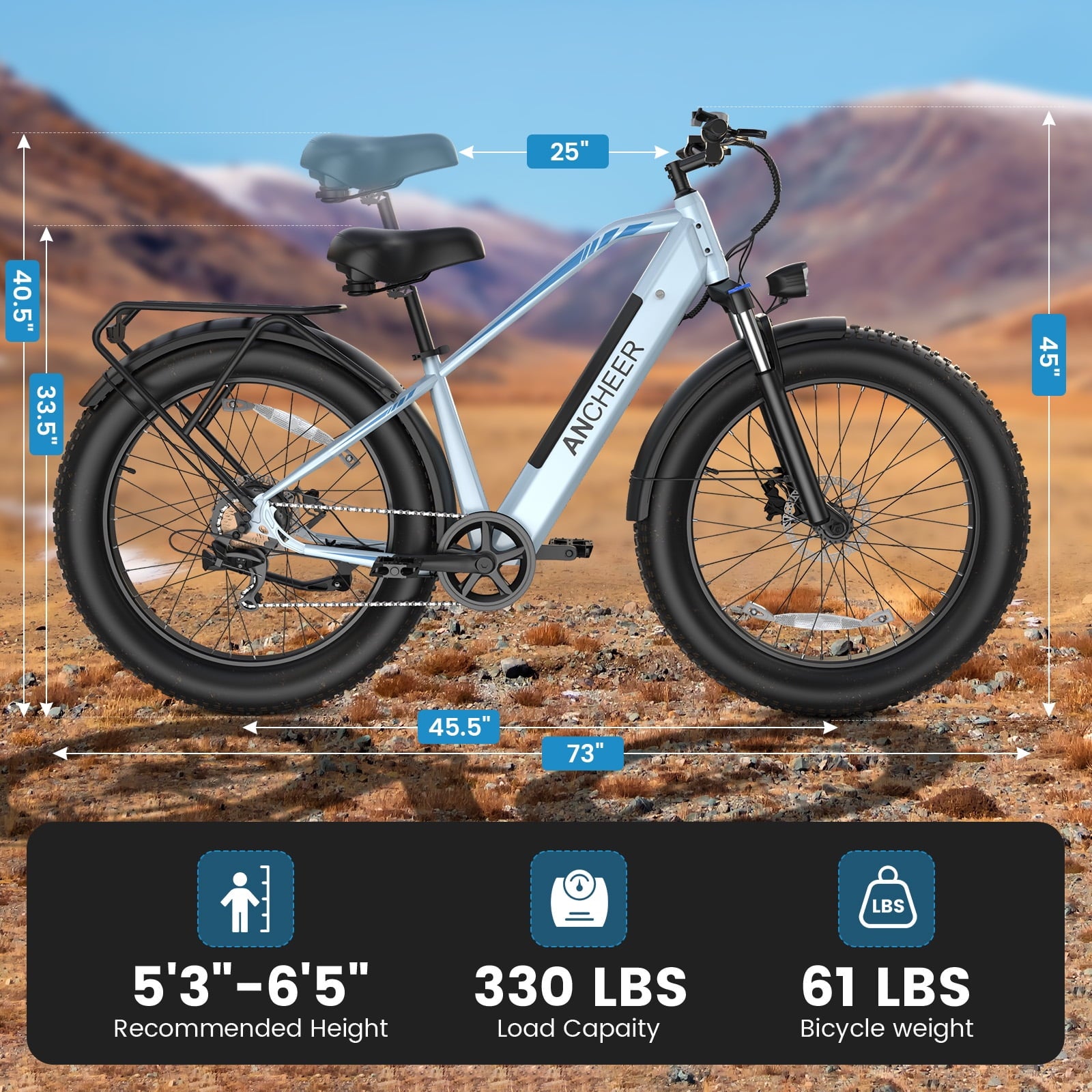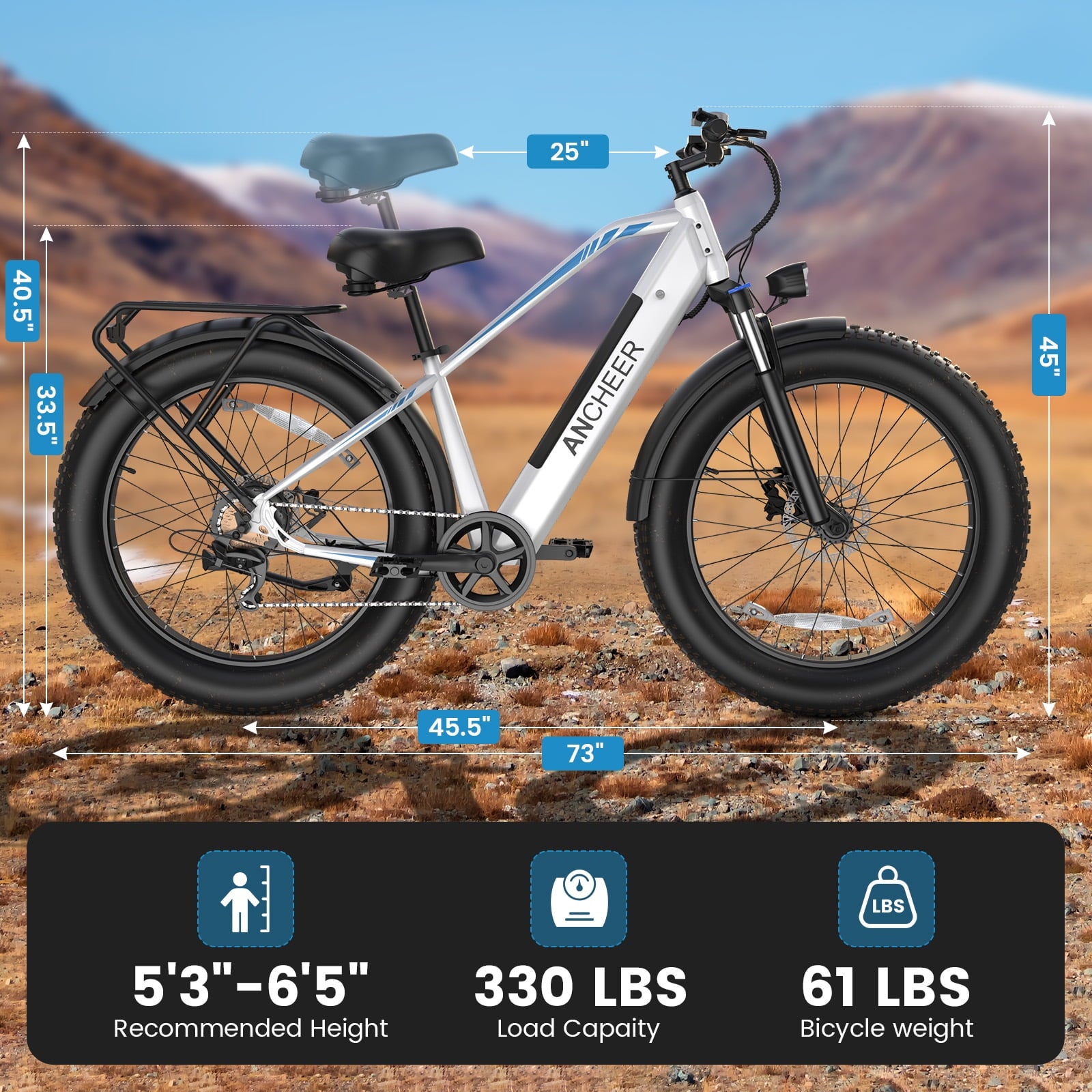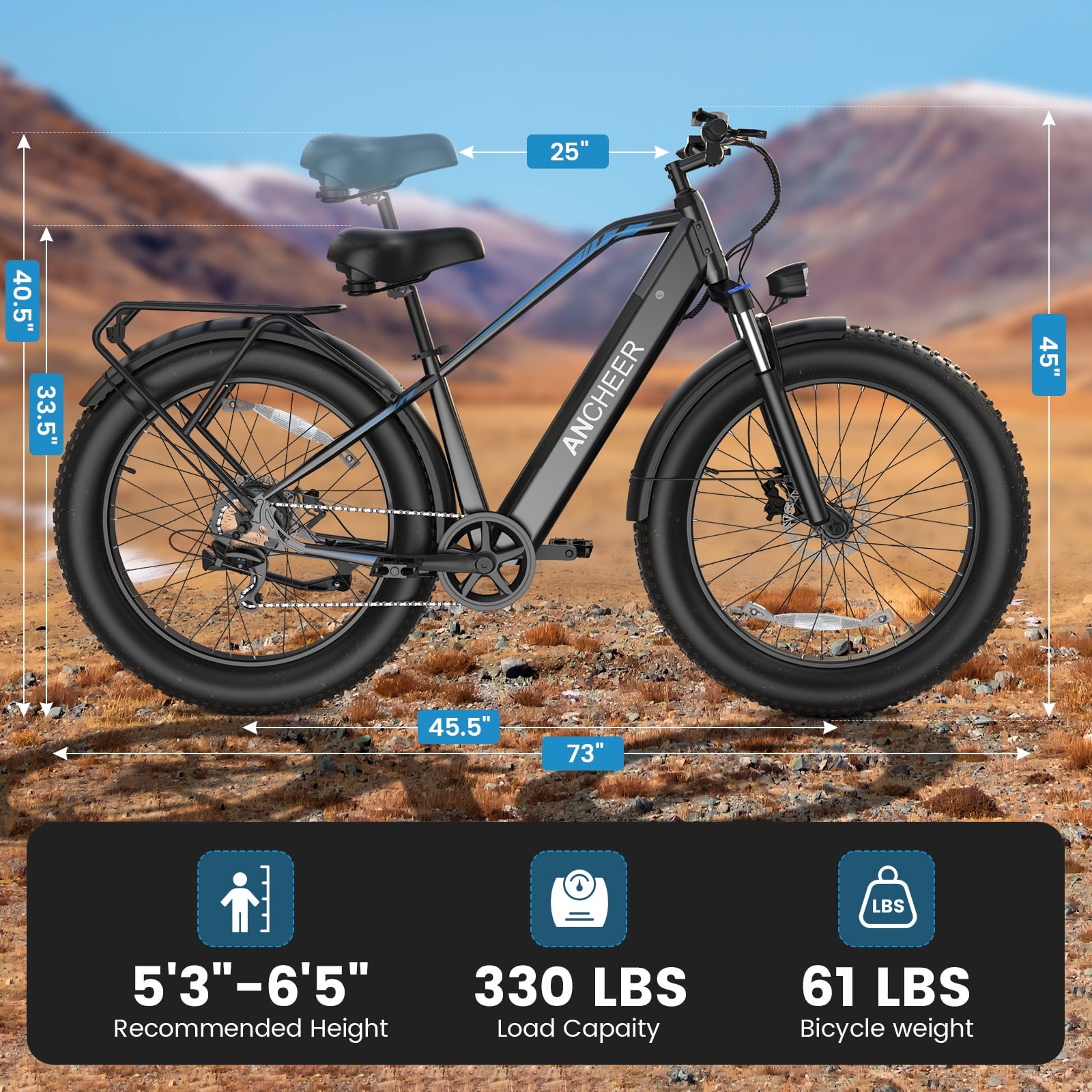 【RELIABLE CUSTOMER SUPPORT】Ancheer fat tire electric bicycle is suitable for 5.3-6.5ft riders, the max load is 330lbs. It is 90% pre-assembled.