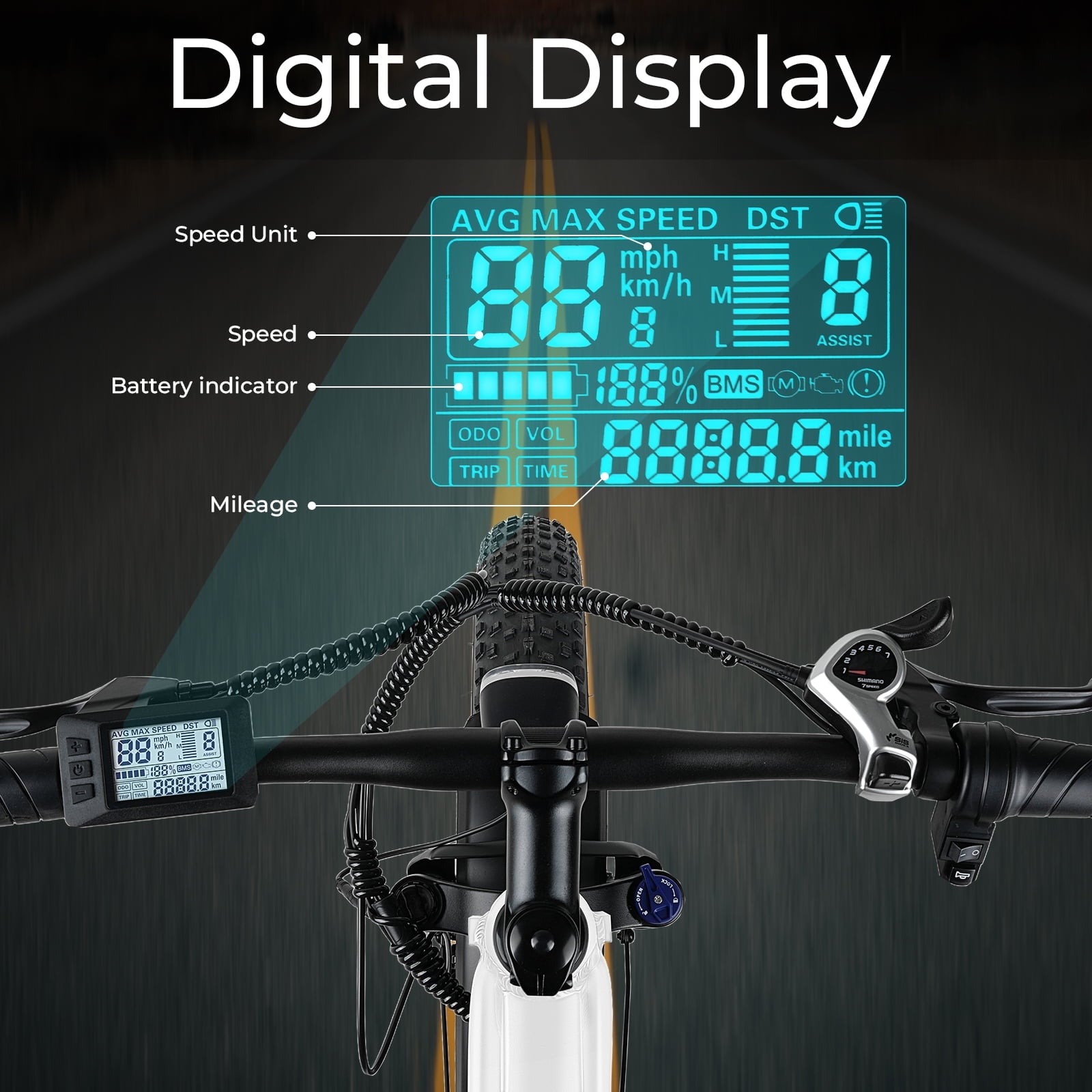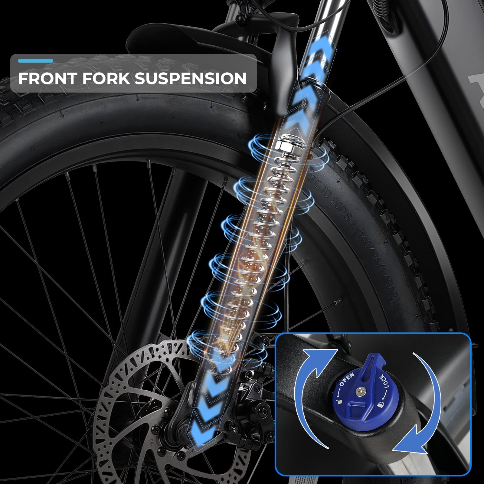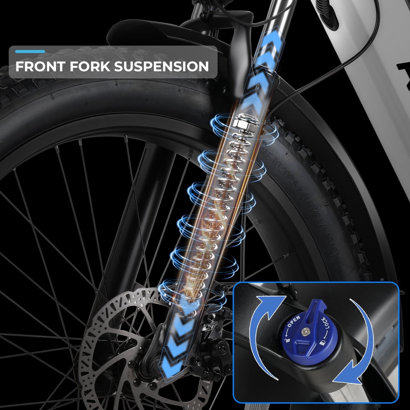 Fat tire design makes riding more stable.Easily handle all terrains.Refective threads on tires increase visibility.The lockable front fork suspension can reduce road vibrations and impacts,ensuring asmooth and comfortable ride.