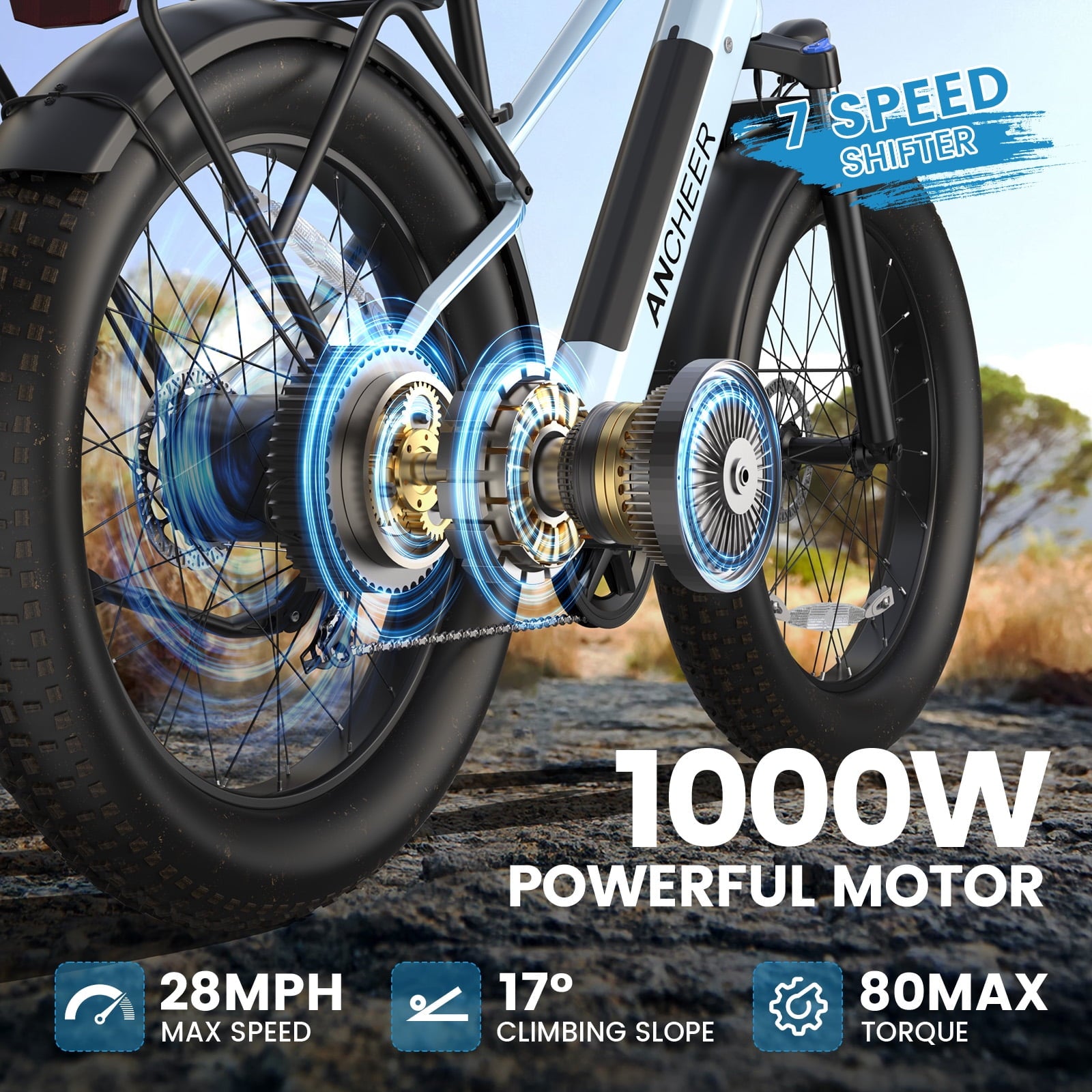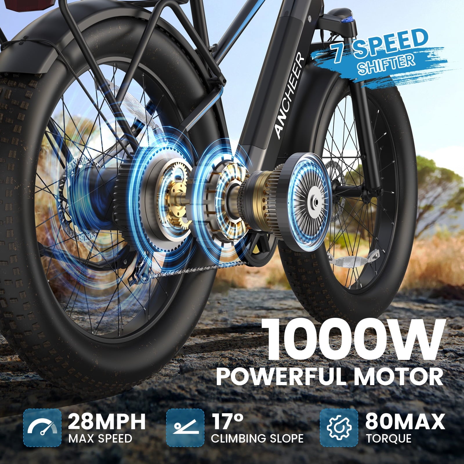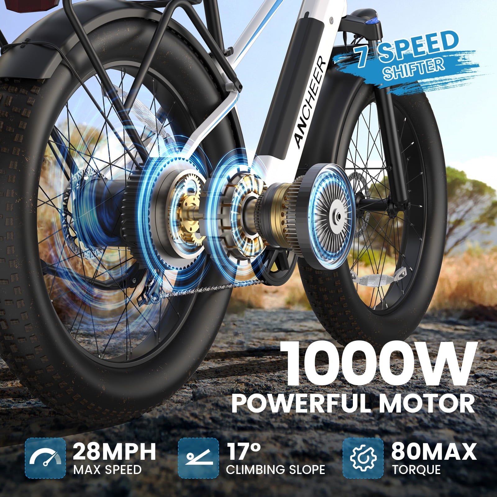 ANCHEER Electric Bike for Adults Peak 1000W Electric Bicycle 48V 15AH Battery Electric Bike 26" x 4.0" Fat Tire Mountain 28MPH 7 Speed Gears Electric Bike, Rear Rack,UL2849