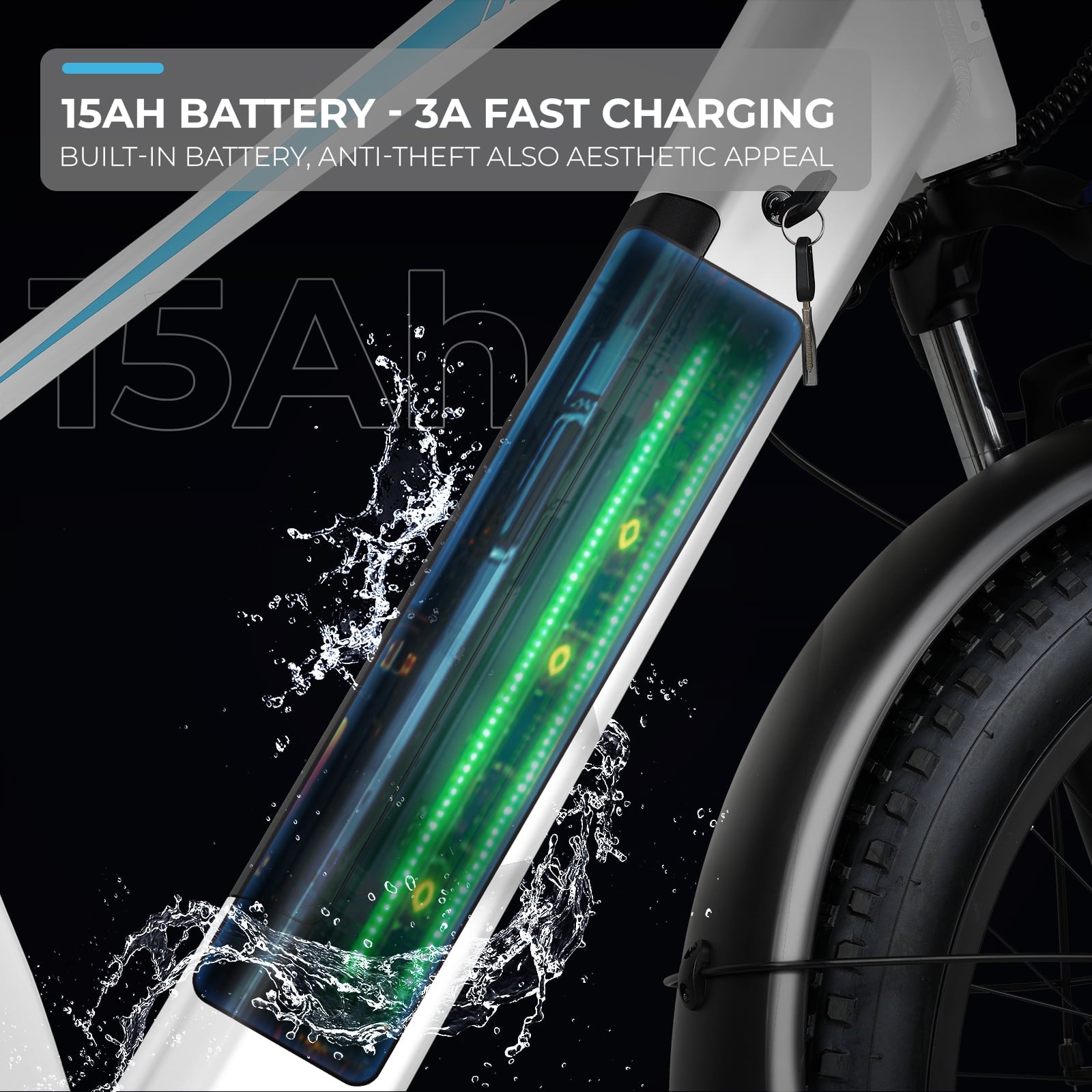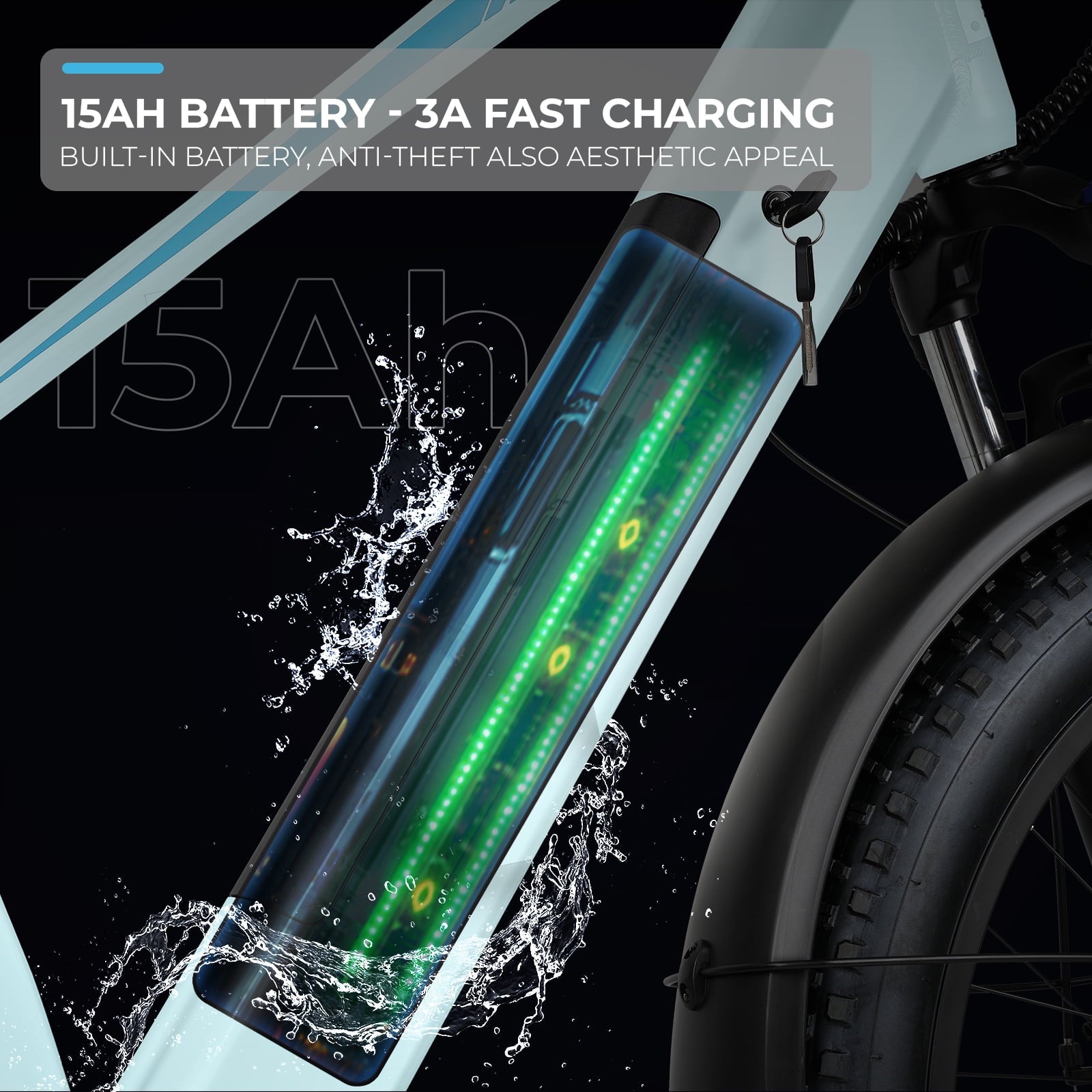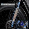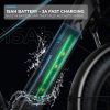 【48V 15AH REMOVABLE BATTERY】 This fat tire electric bike is equipped with a 48V 15AH large capacity li-ion battery, helping riders to get an impressive range of 40-50 miles in pure electric mode and 50-60 miles in PAS mode. Please note that the riding range will vary depending on your riding style, weight and road conditions. The battery is IPX5 waterproof and BMS protected, and can be charged on/ off the ebike, the charging time is about 5 hours.