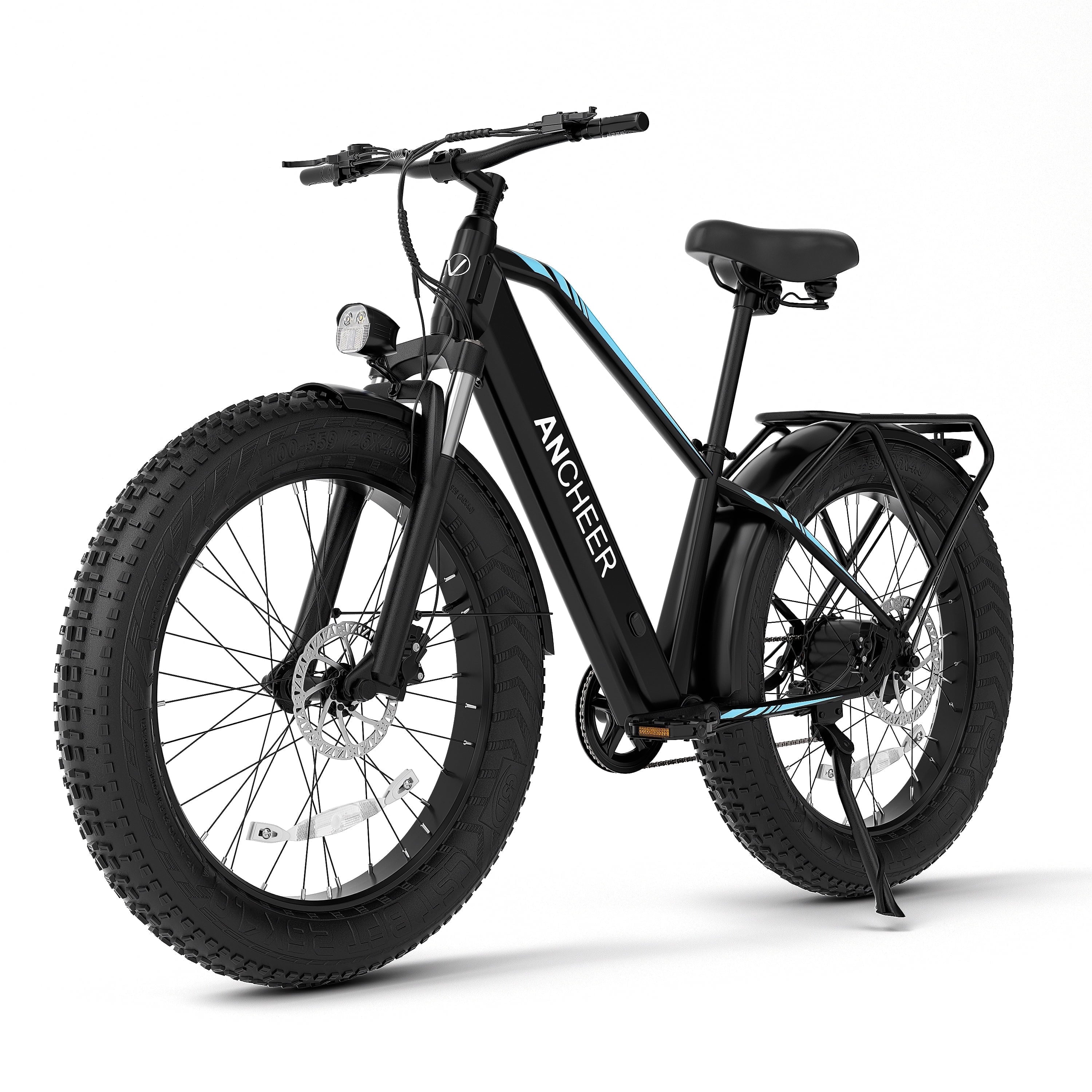 【1000W PEAK MOTOR & FAT TIRES】 Ancheer electric bike adopts a 750W(1000W peak) strong motor, with a torque of 65NM and a top speed of 28mph. Equipped with 26’’X4.0 anti-skidding fat tires, this electric bike for adults is designed to easily handle all terrains such as beach, snow, sand, mountain and gravel roads. It can provide excellent grip and stability to ensure a smooth ride.