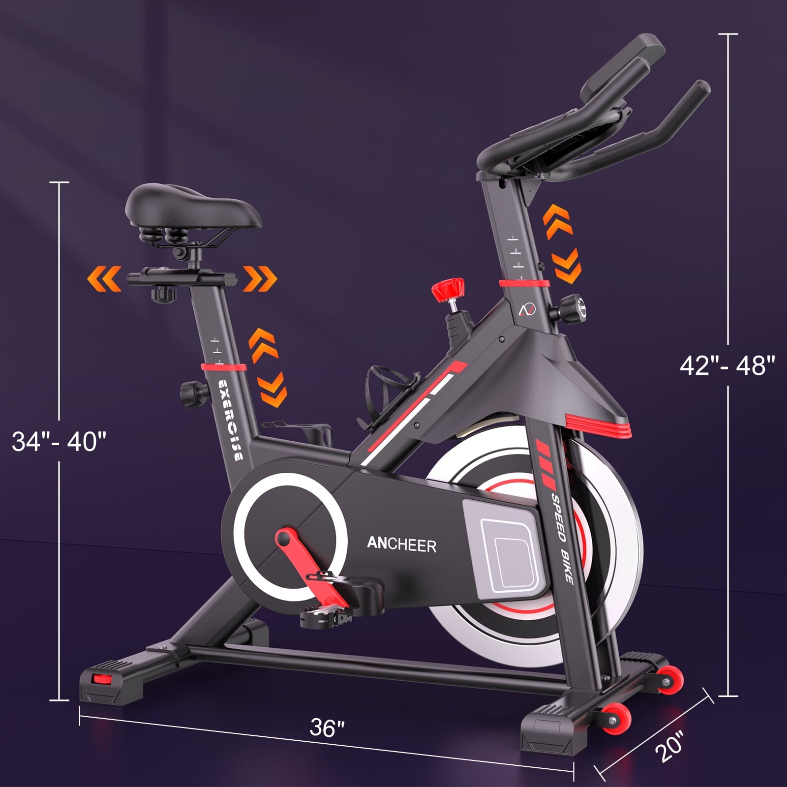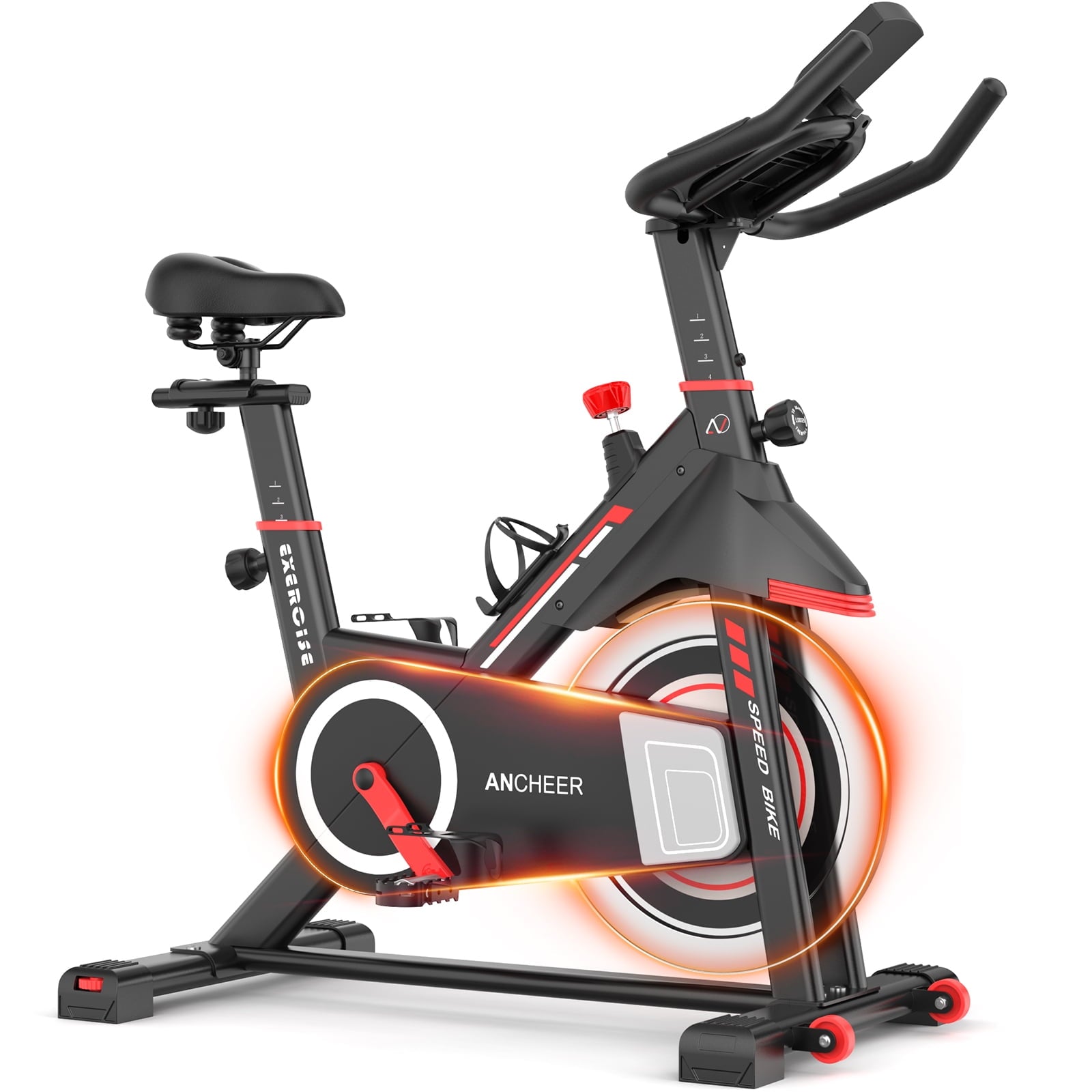 - [Product Service] ANCHEER exercise bike comes with a tablet holder, water bottle holder and caged pedals. Extended reach from saddle to handlebar enables space for all sizes of riders. The featured transport wheels allow you to move your stationary bike from indoor to outdoor. The handlebars have a light spongy coating that protects the bars, making them slightly more comfortable when you are riding. Multi-point handlebar grips provide you different cycling ways.