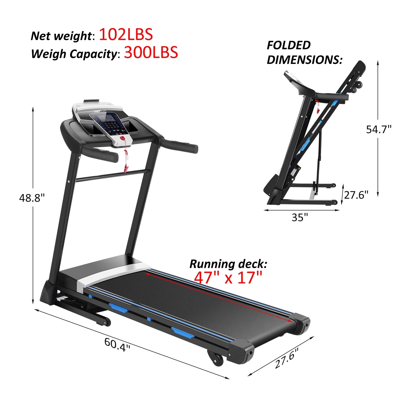 • ⦁Treadmill Running Belt Width: 47*17 inches