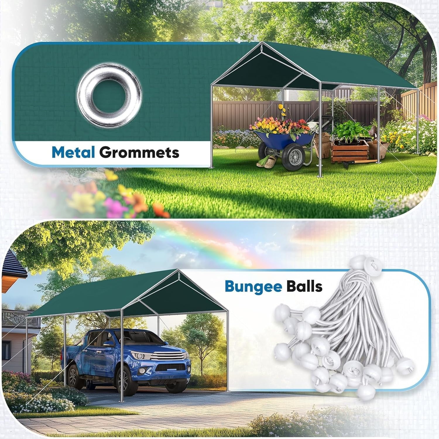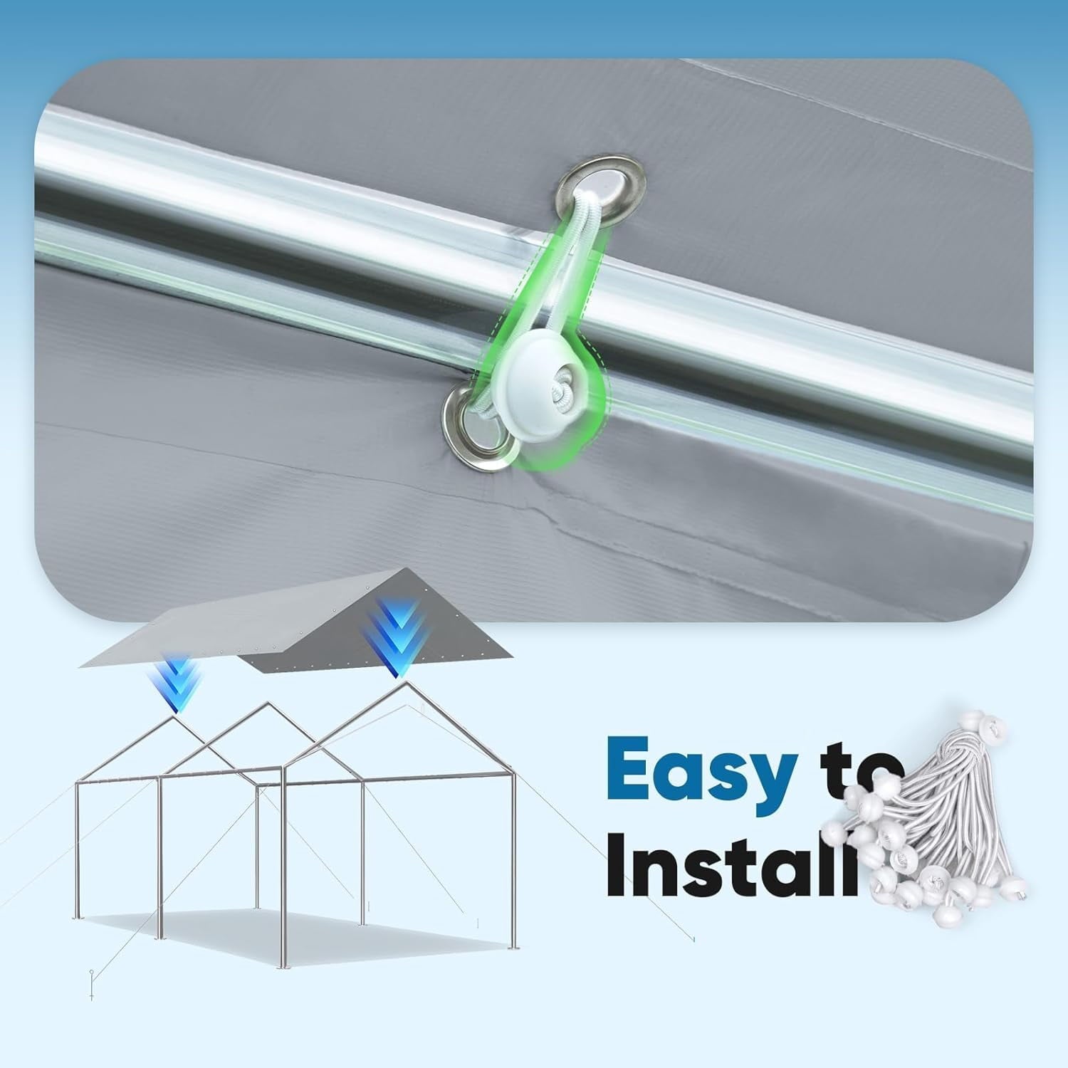 • 【Easy Set up】There are metal eyelets on the edge of tarp and comes with bungee balls to easily attach it to the canopy frame