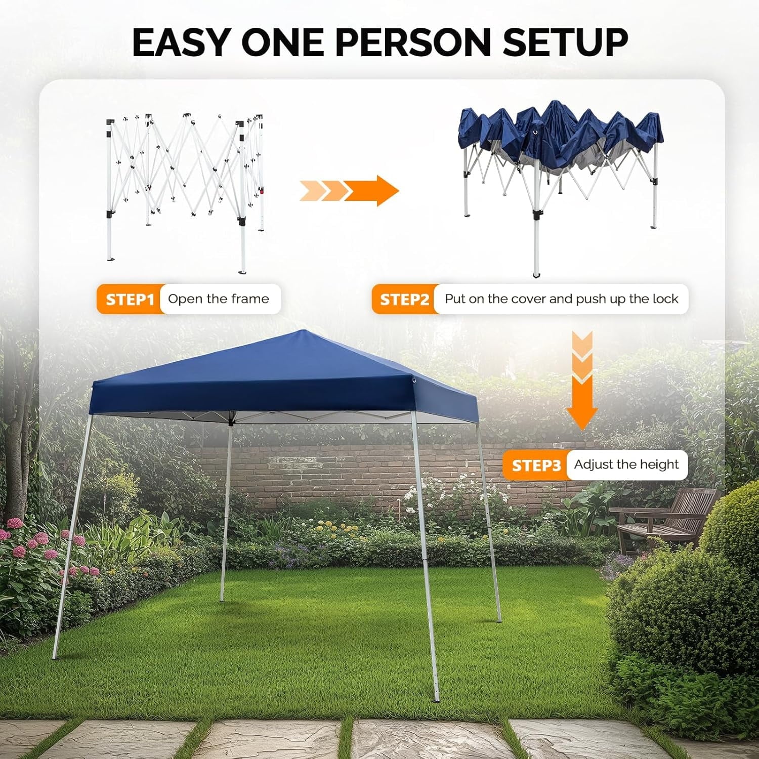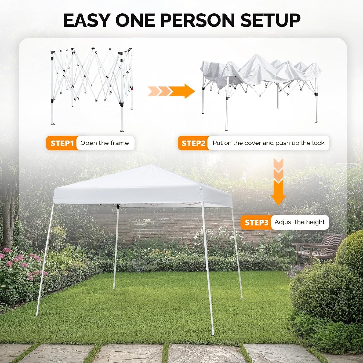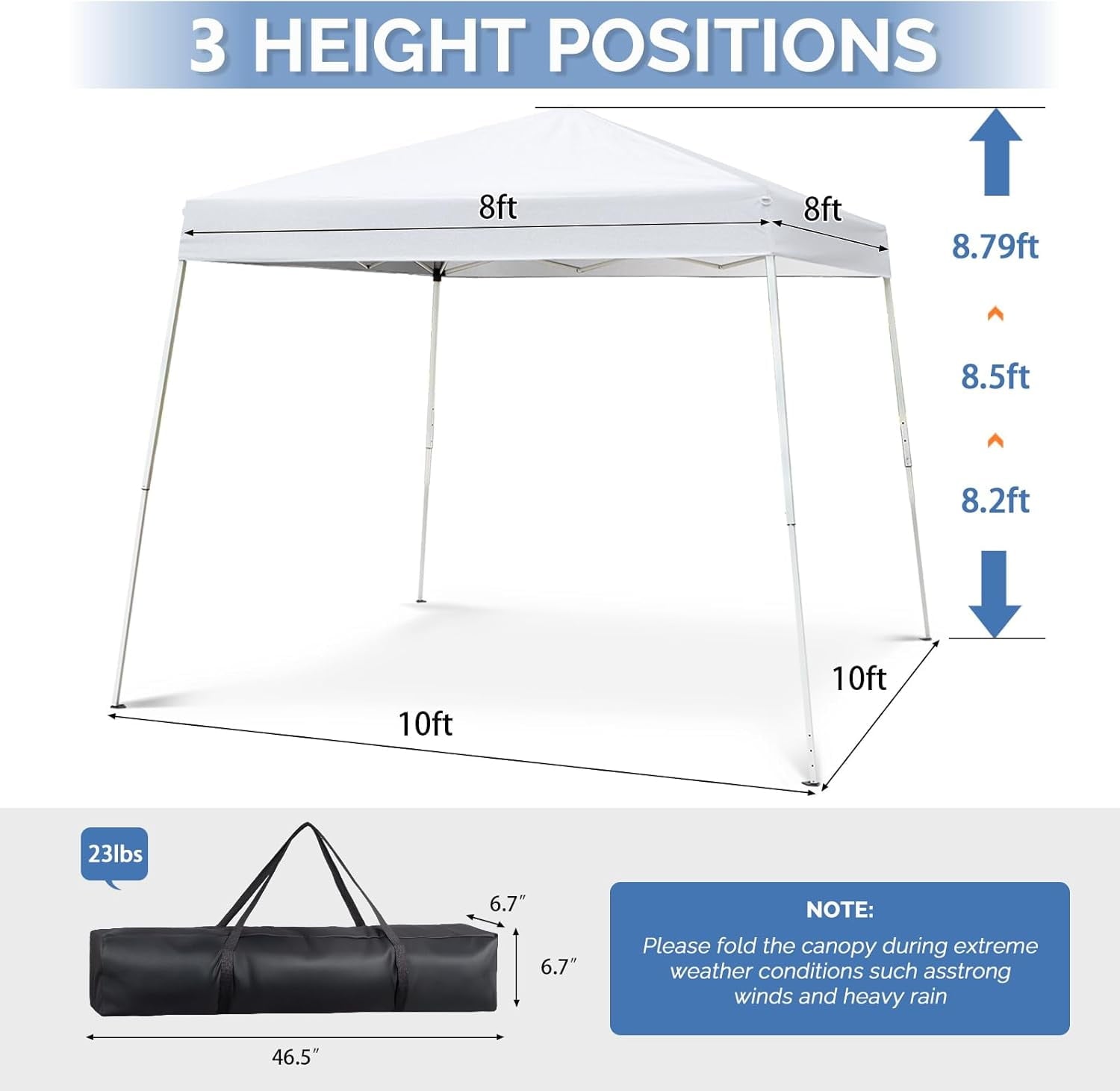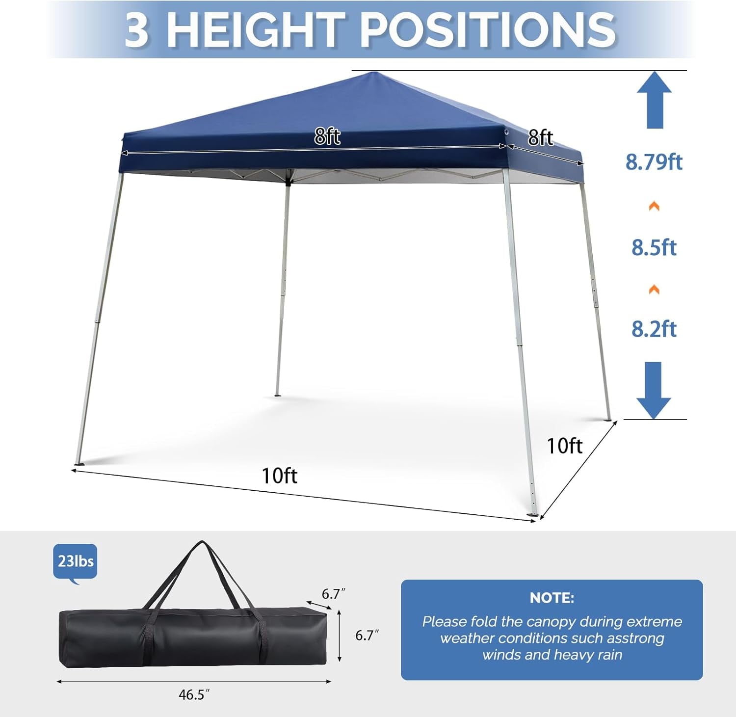 ADJUSTABLE HEIGHT – The pop up canopy tent works great for family outdoor events, market stall and kids’ sporting events. The easily adjustable height with 3 different positions makes it a versatile tent