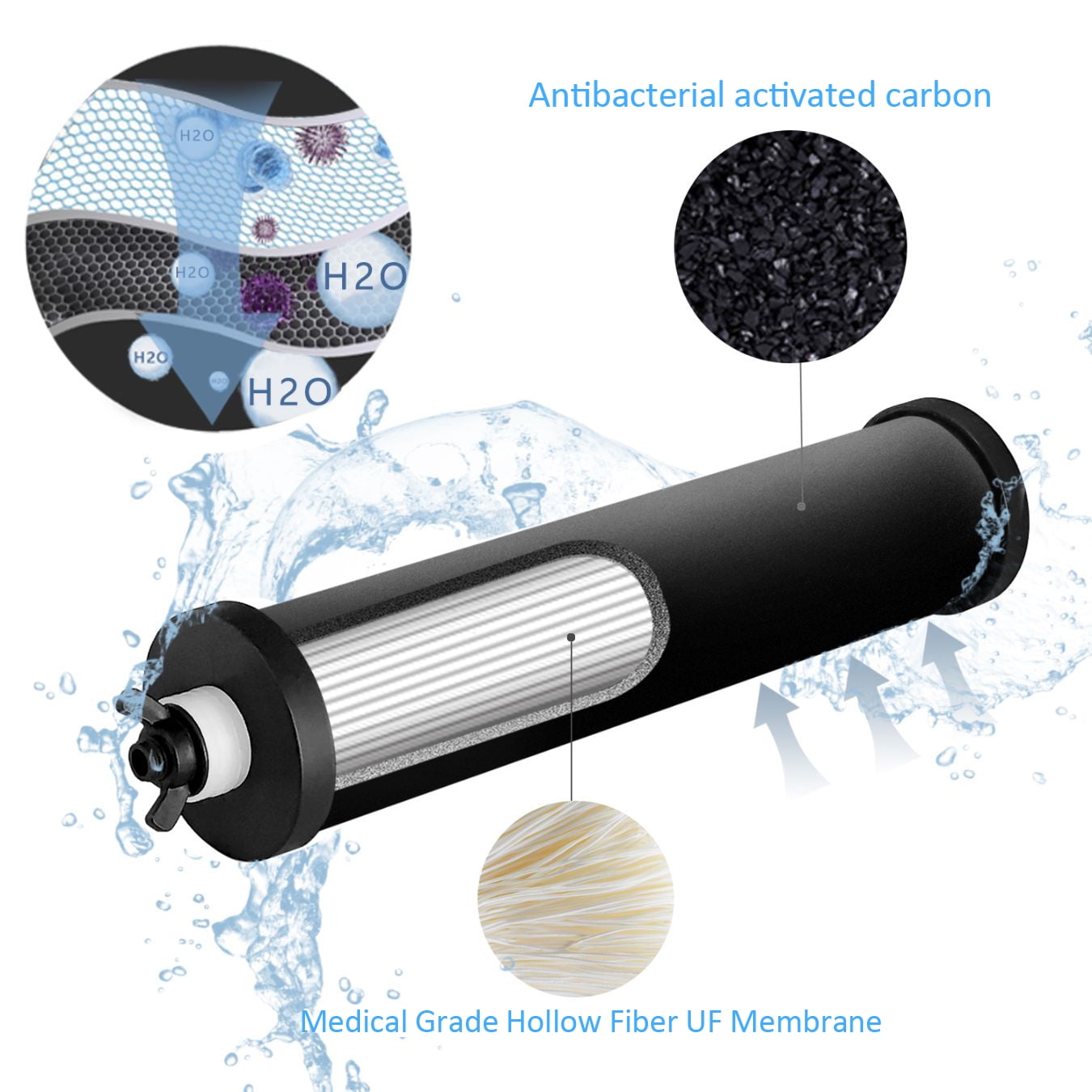 - Filter Material: Hollow fiber UF membrane + Coconut activated carbon