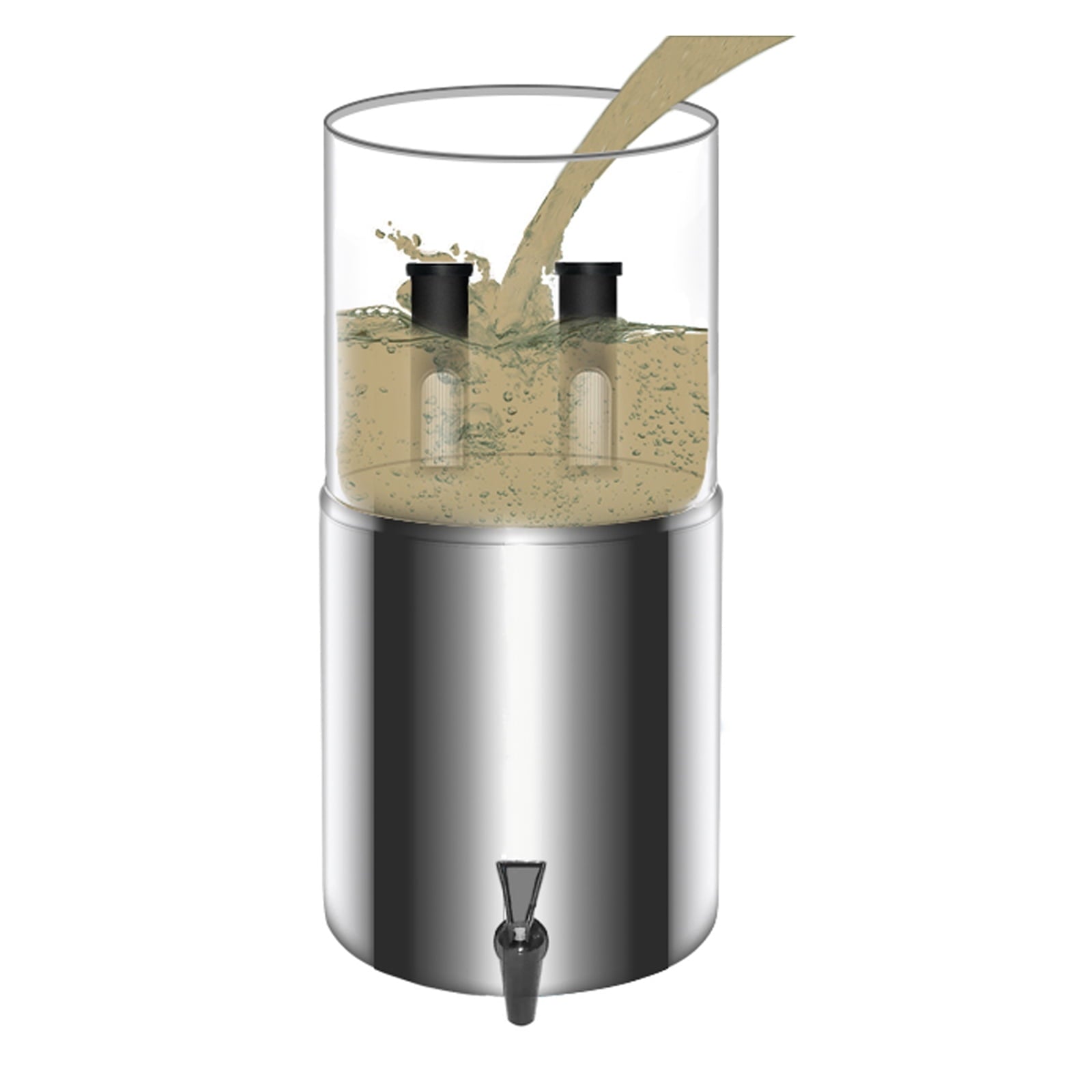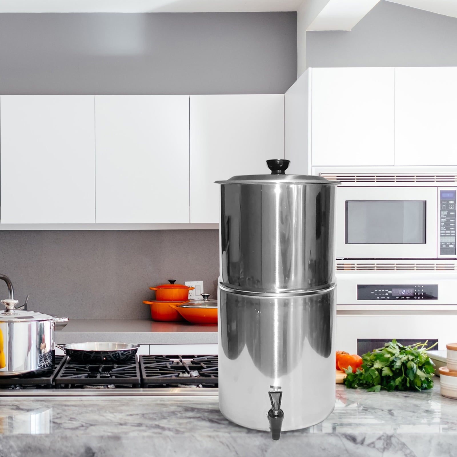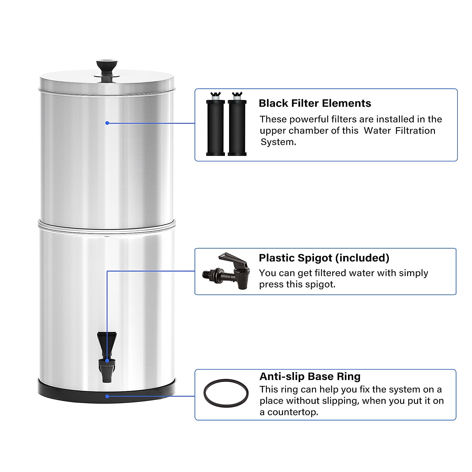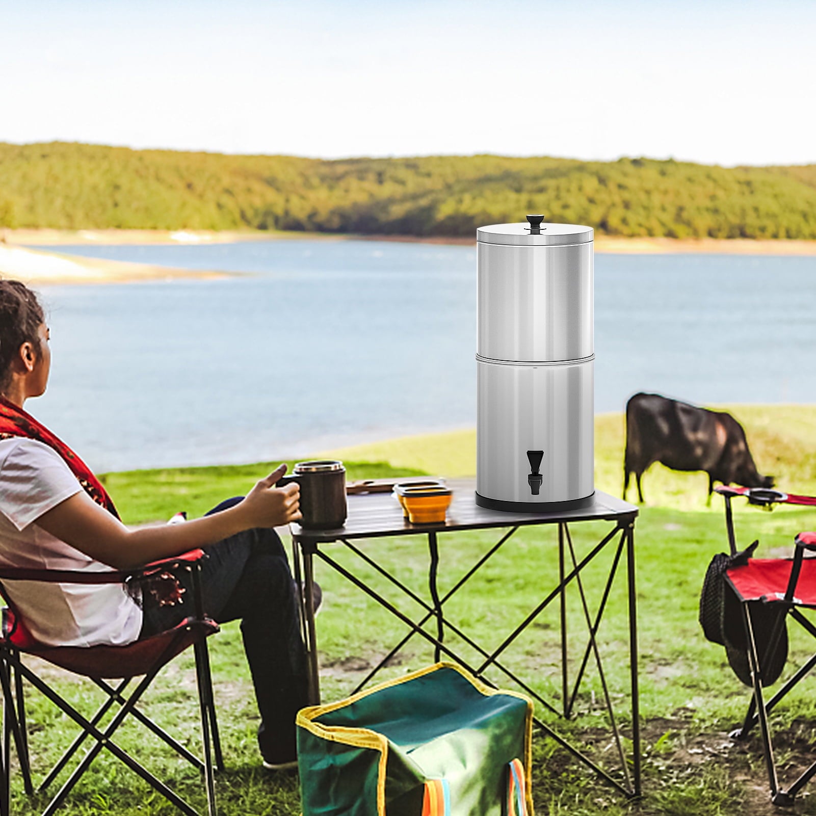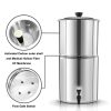 This water filter system with a removable filter can help effectively remove the impurities to provide clean, safe water. It is perfect for outdoor emergency, camping, hiking, backpacking, etc.2.38 gallons large capacity, with fast flow rate up to 4 gallons per hour.Last for up to 6,000 gallons of clean and safe drinking water before needing replacement, super economical.Requires no power to purify raw, untreated water from remote lakes and streams.Removes small particles and impurities, reduces turbidity and improves taste.Constructed from food-grade stainless steel, chemical-free, healthy and reliable.Perfect for home, emergency preparedness, outdoor adventure, camping, hiking, backpacking, etc.