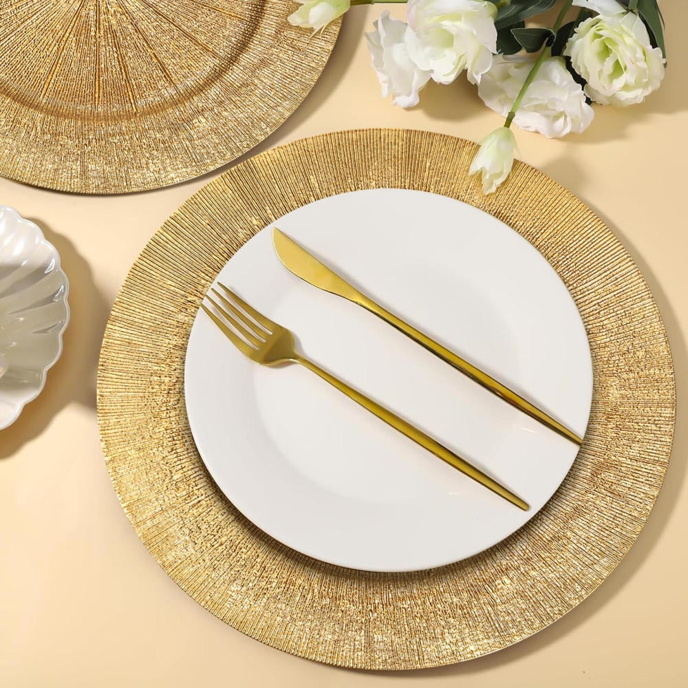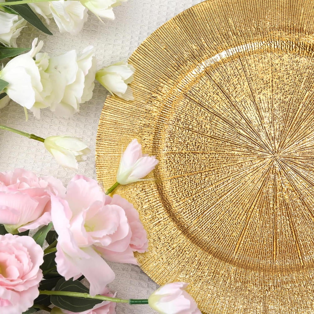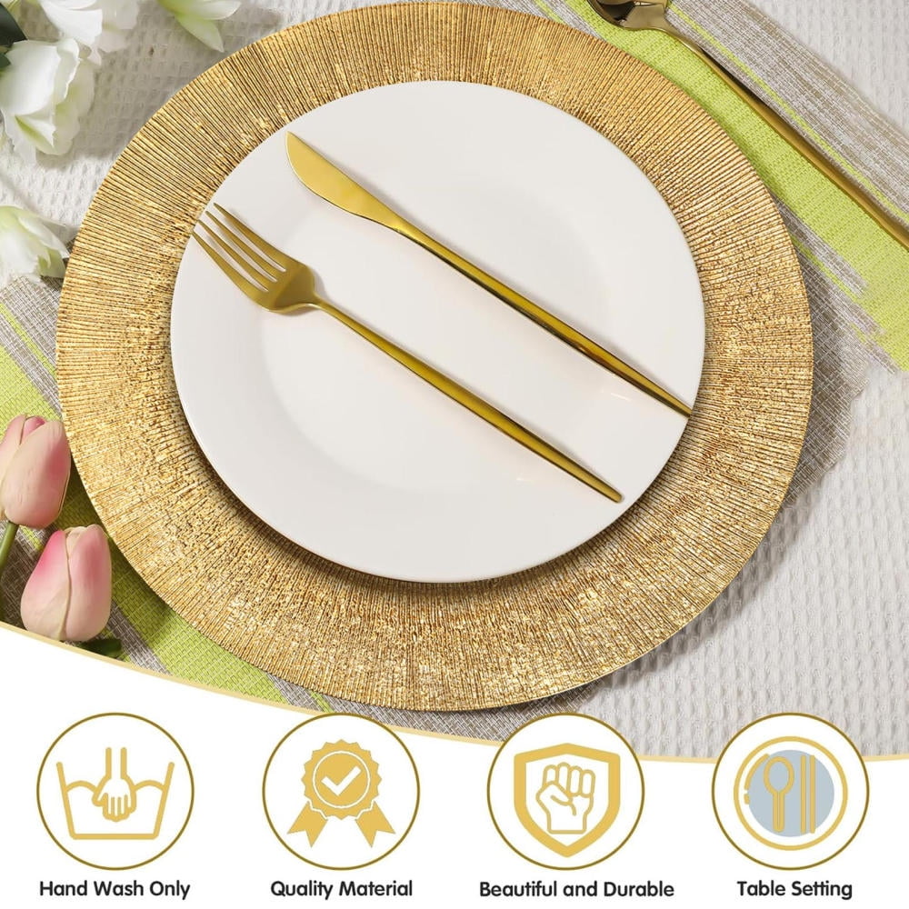 - Sufficient Quantity: Impress your guests with our 100 pieces of gold chargers plates. Perfect for caterers, these textured round dinner plates provide an upscale dining experience. There’s enough to go around, ensuring that event planners and homeowners have a esay experience