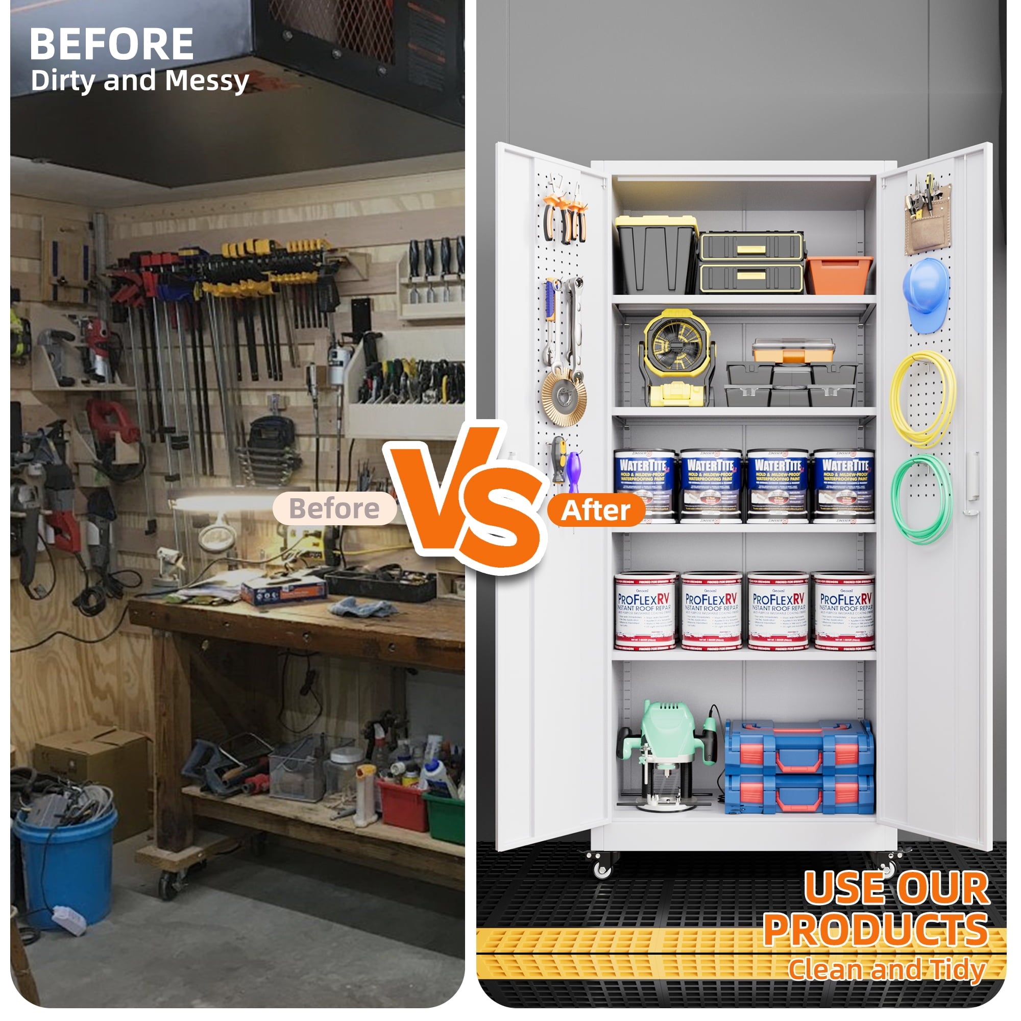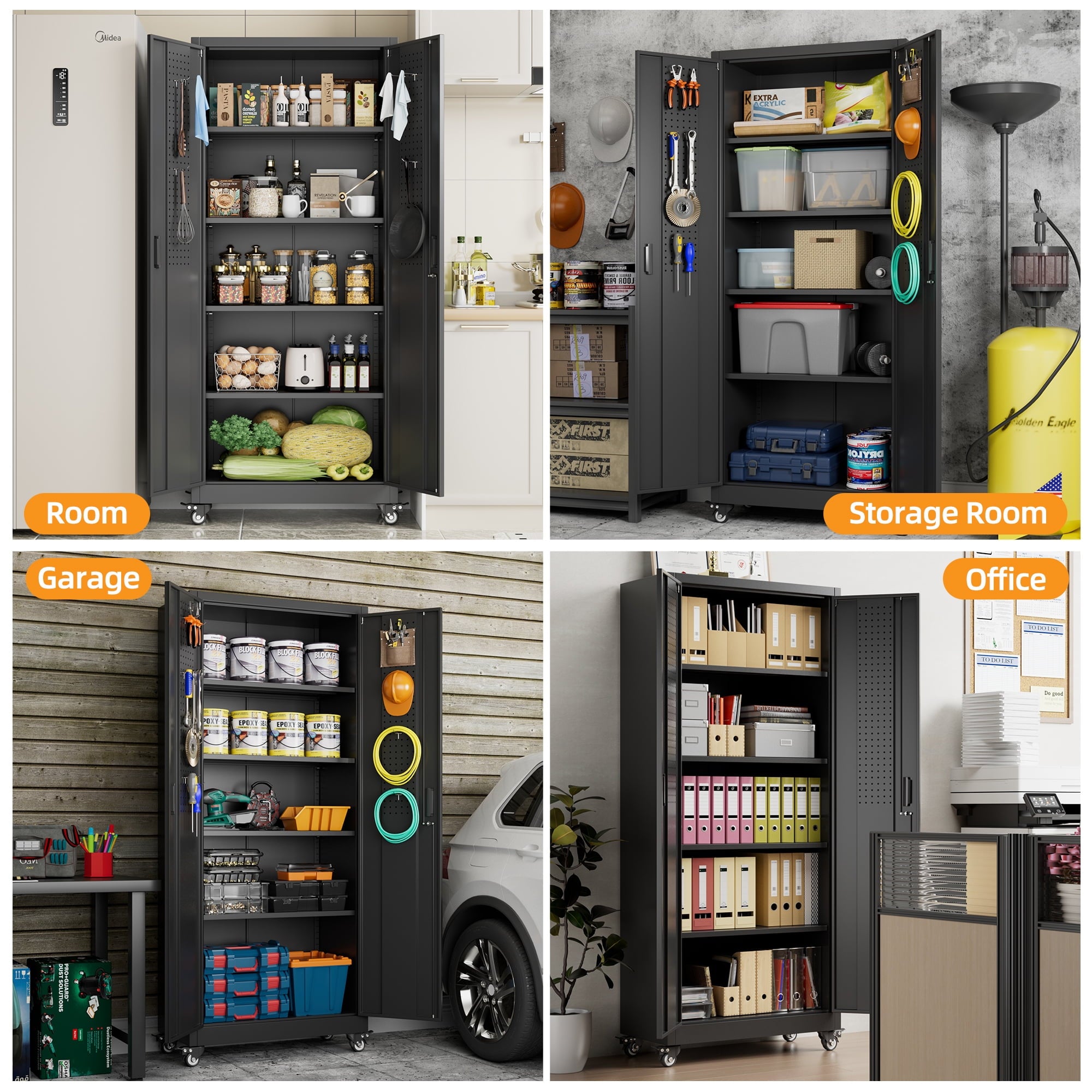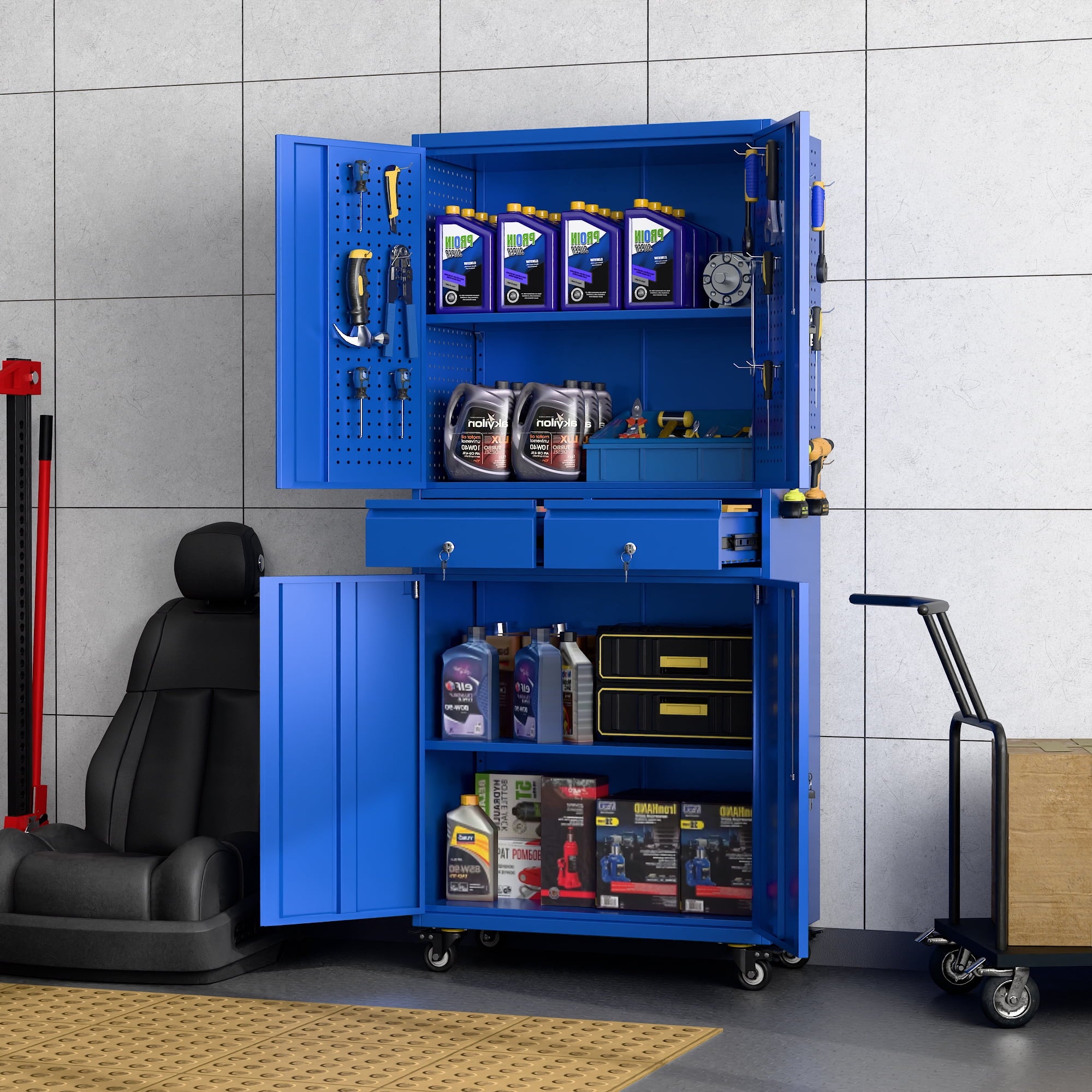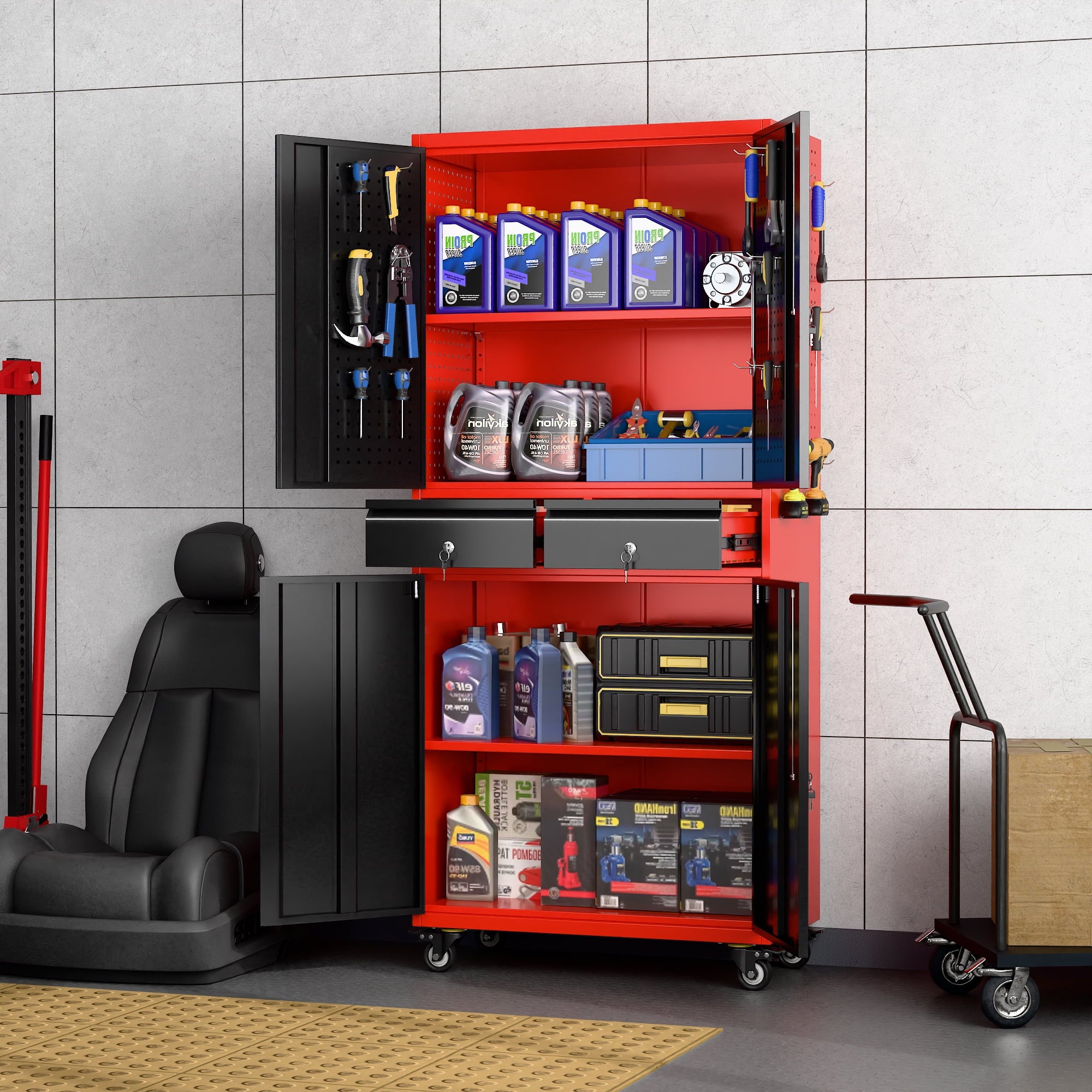 - [Great Garage Storage] Garage Metal storage Cabinet can also be used to store a variety of automotive supplies, such as oil, car wash supplies, tires and so on. These items require special care when stored to avoid leakage or scattering. Garage metal storage cabinet provides a secure storage location to protect the safety and reliability of these items