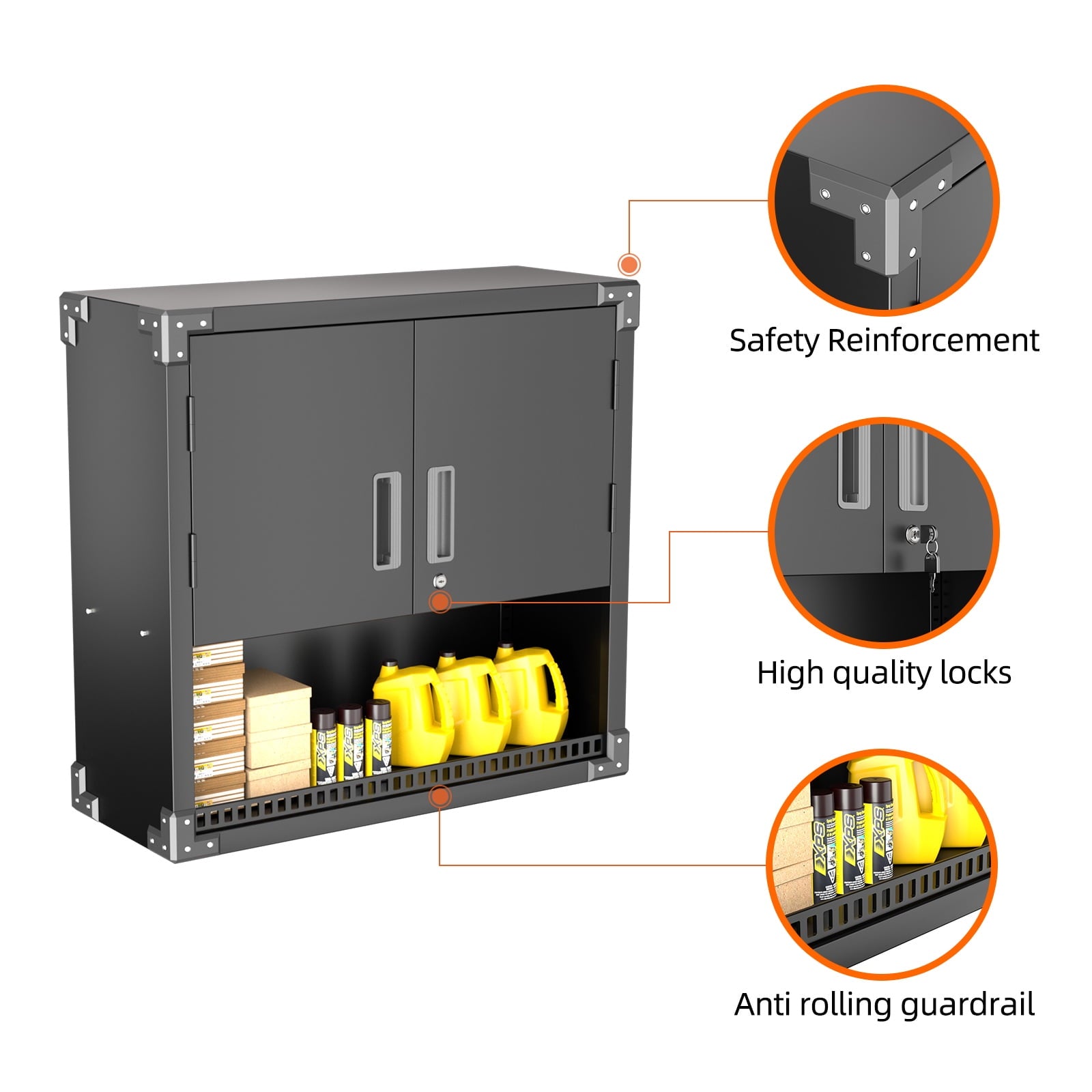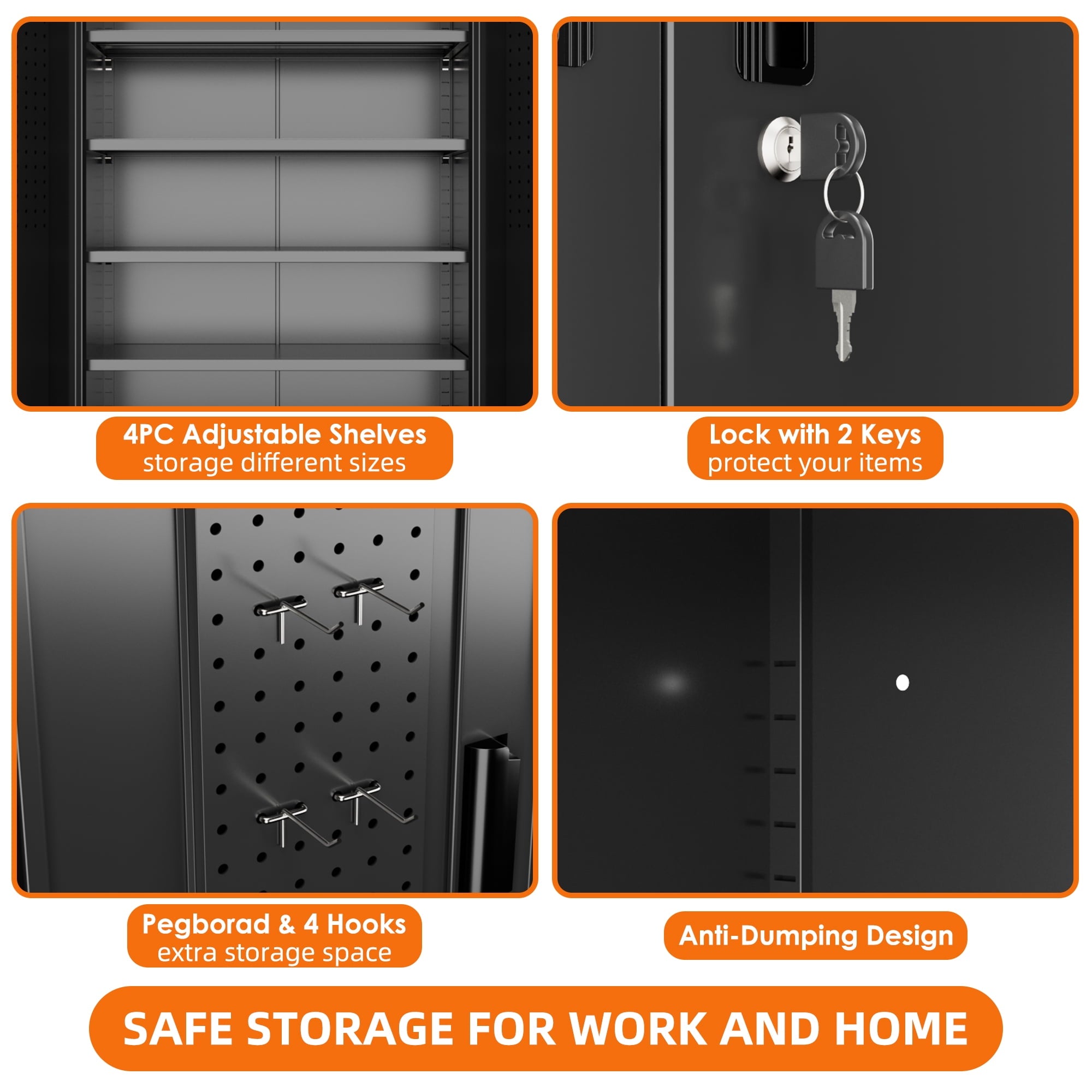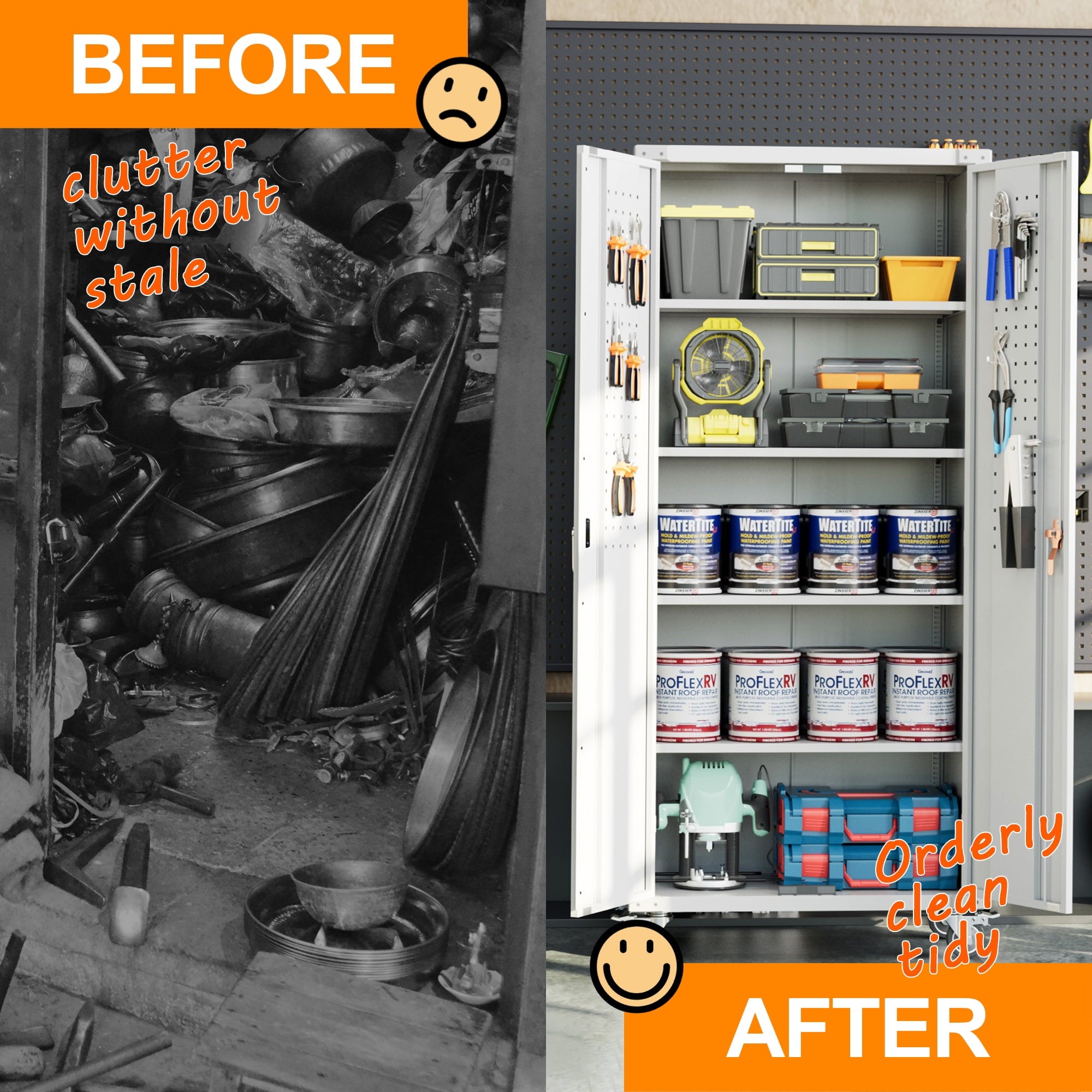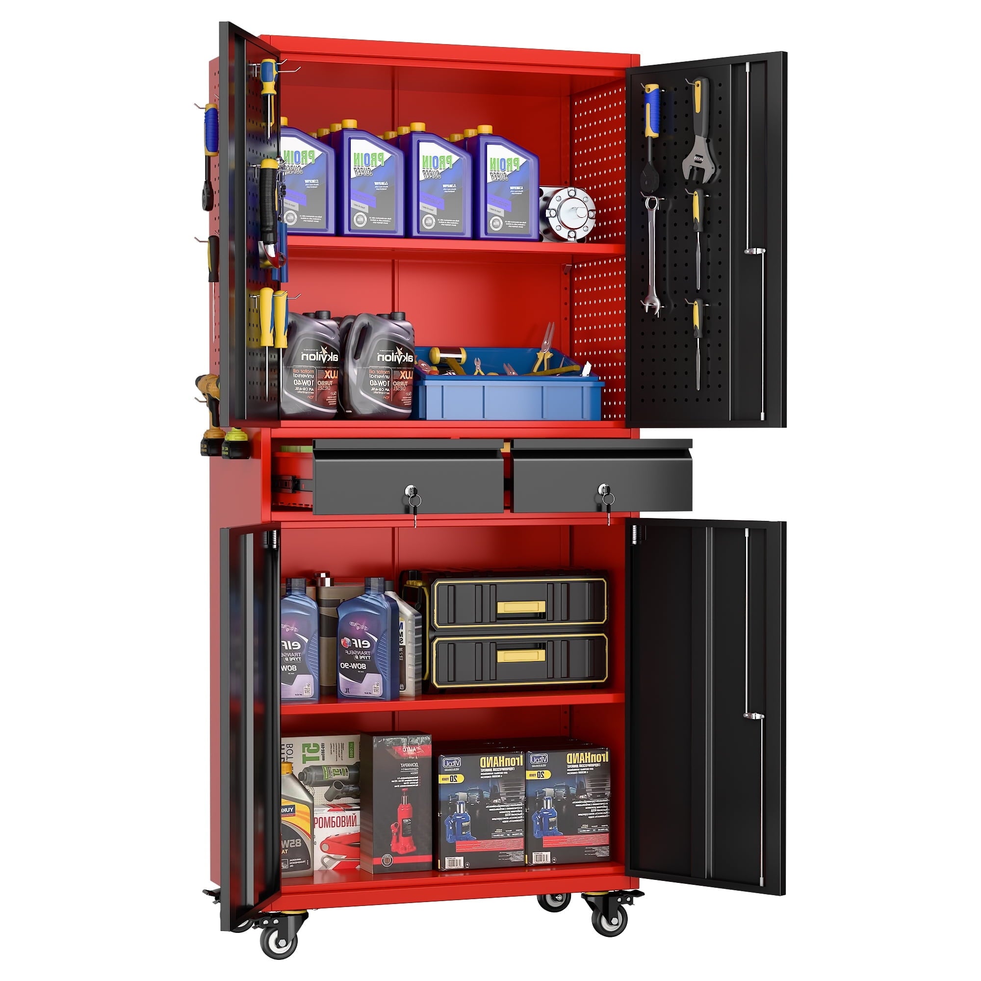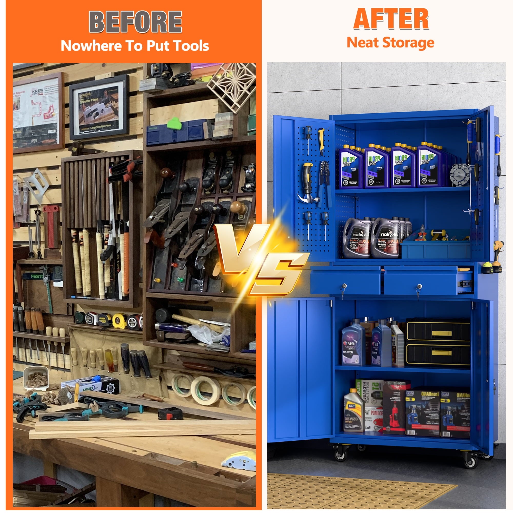 - [Great Garage Storage] Garage Metal storage Cabinet can also be used to store a variety of automotive supplies, such as oil, car wash supplies, tires and so on. These items require special care when stored to avoid leakage or scattering. Garage metal storage cabinet provides a secure storage location to protect the safety and reliability of these items