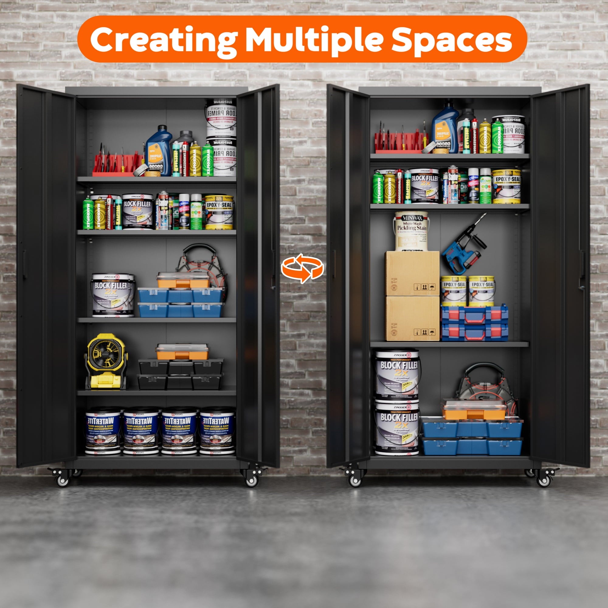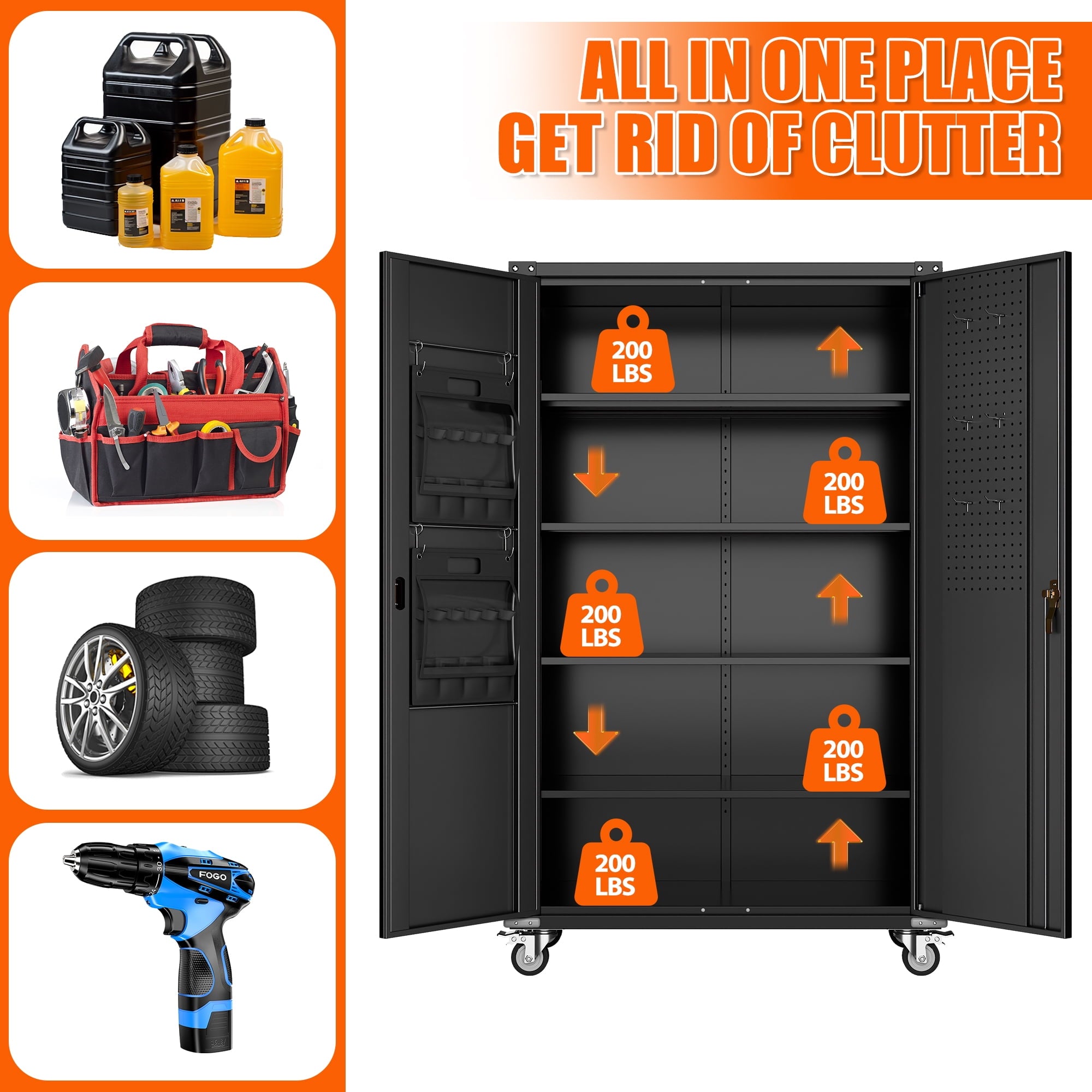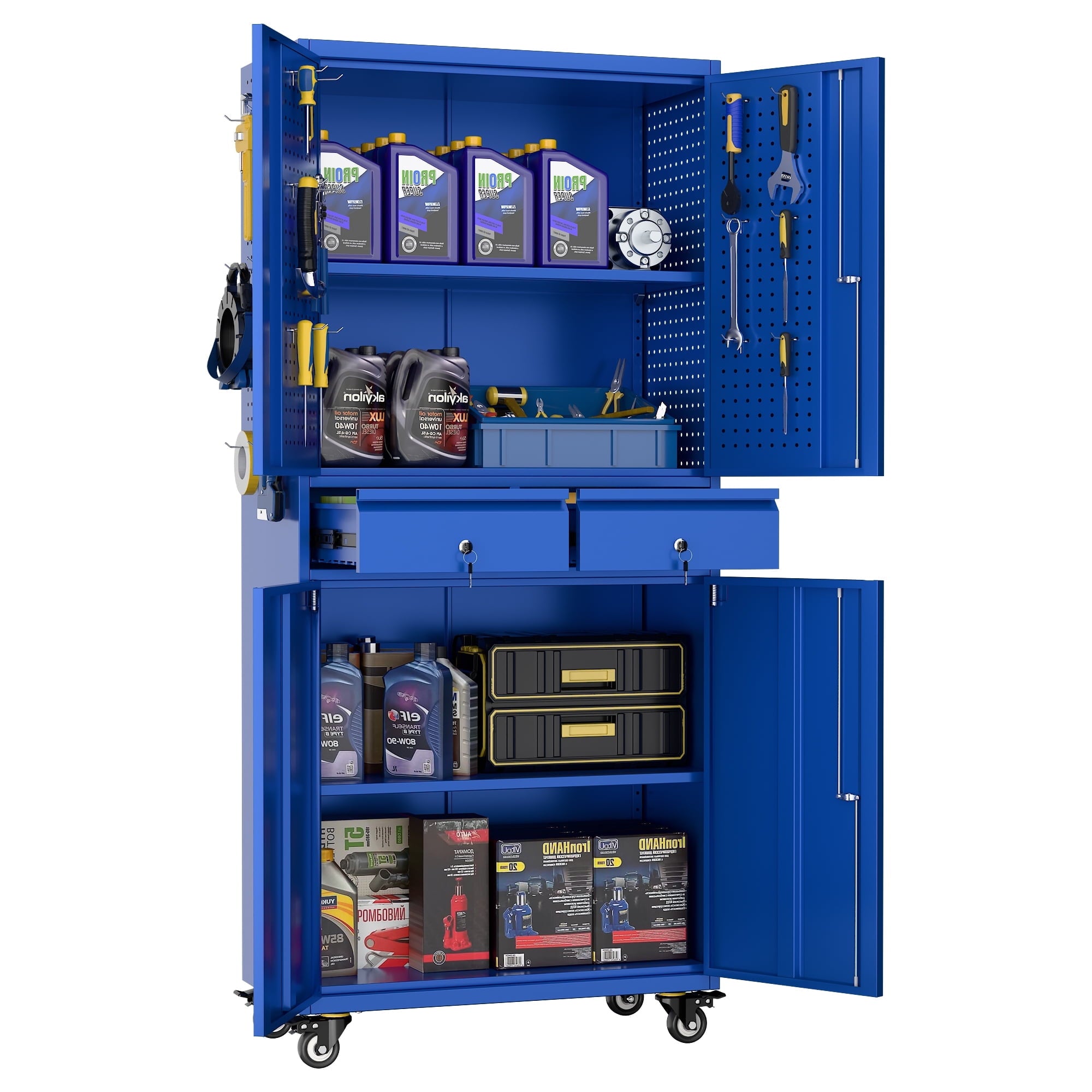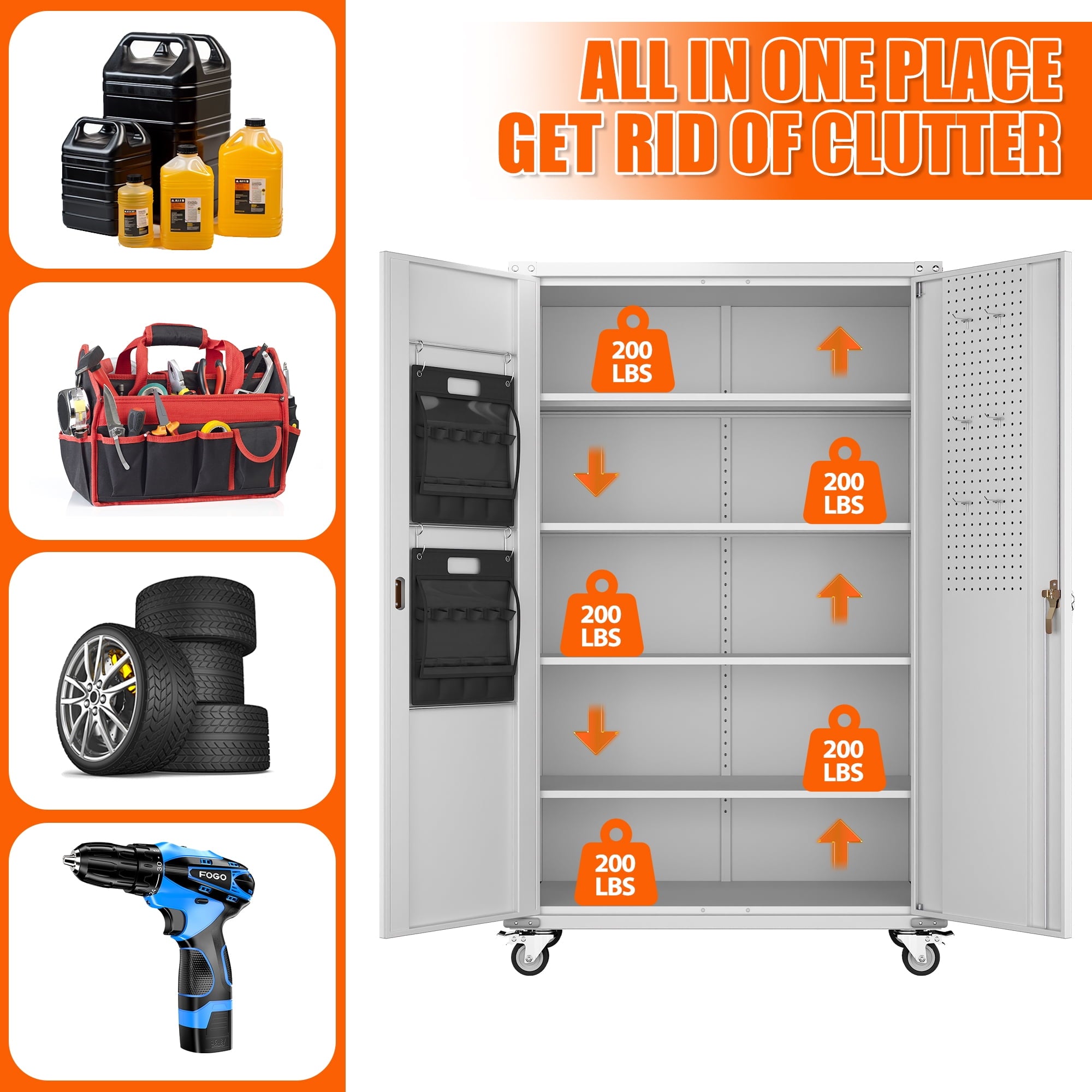 - [Great Garage Storage] Garage Metal storage Cabinet can also be used to store a variety of automotive supplies, such as oil, car wash supplies, tires and so on. These items require special care when stored to avoid leakage or scattering. Garage metal storage cabinet provides a secure storage location to protect the safety and reliability of these items