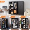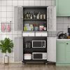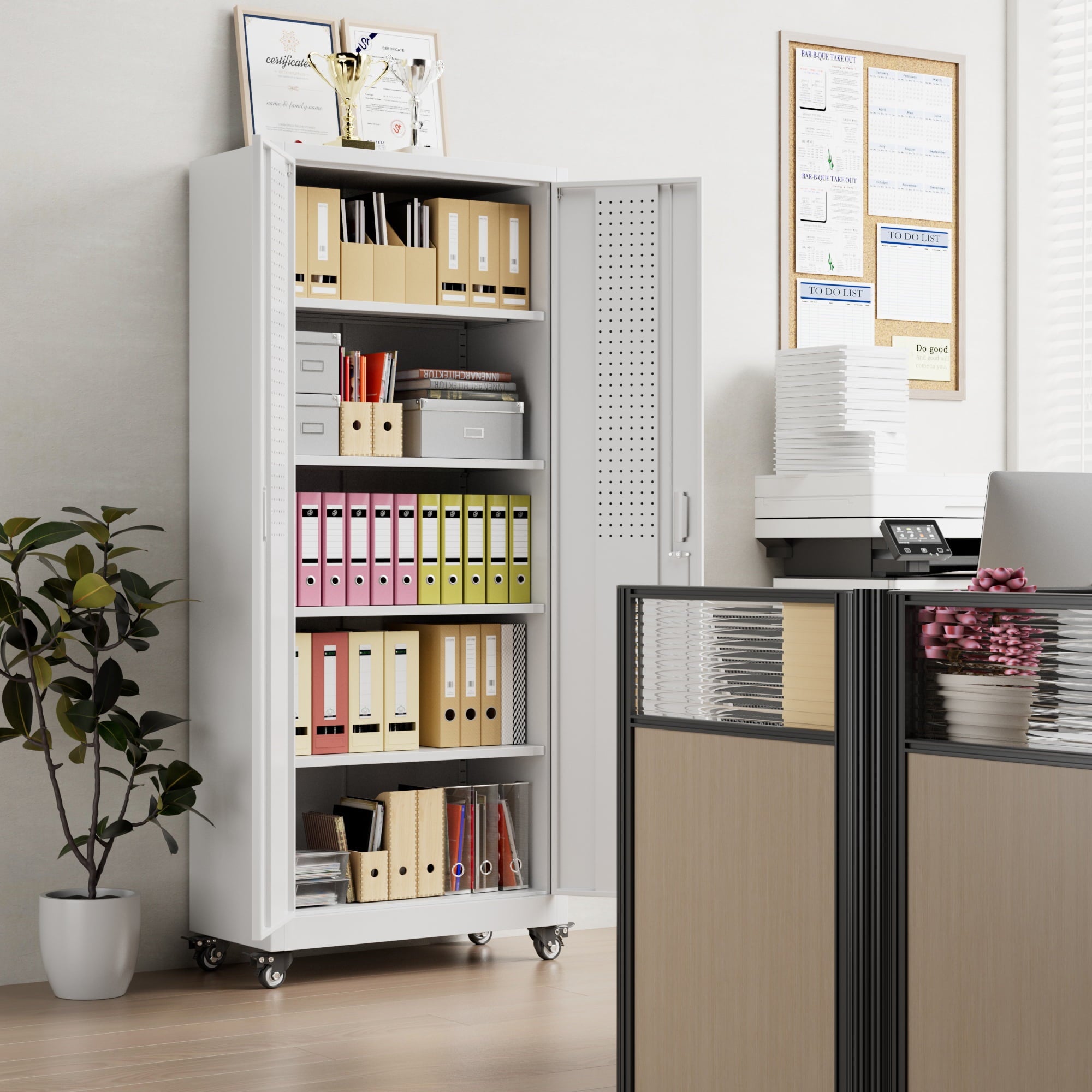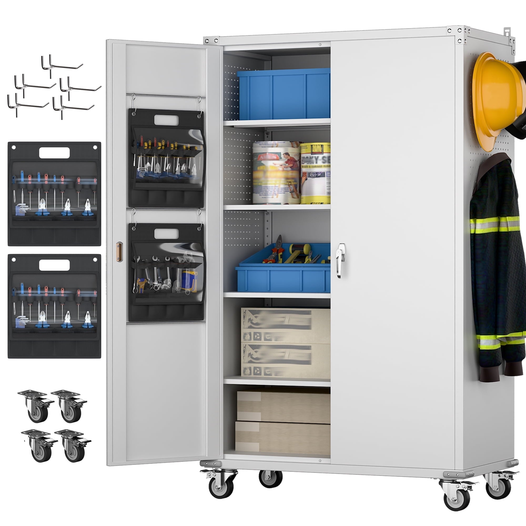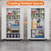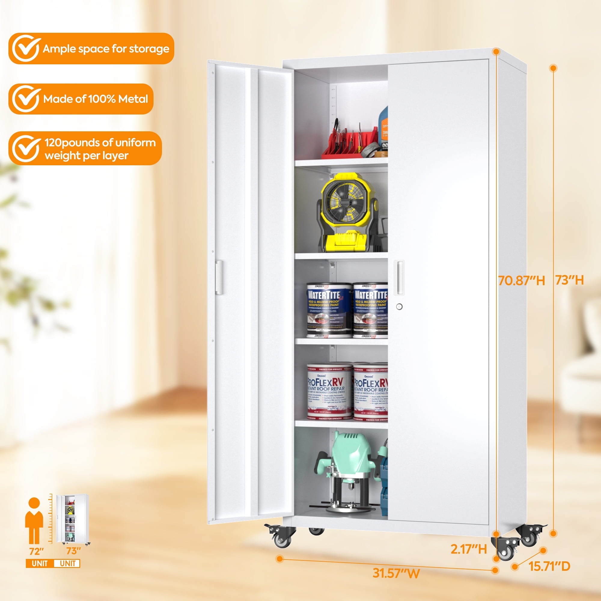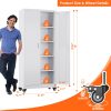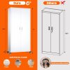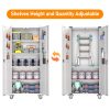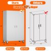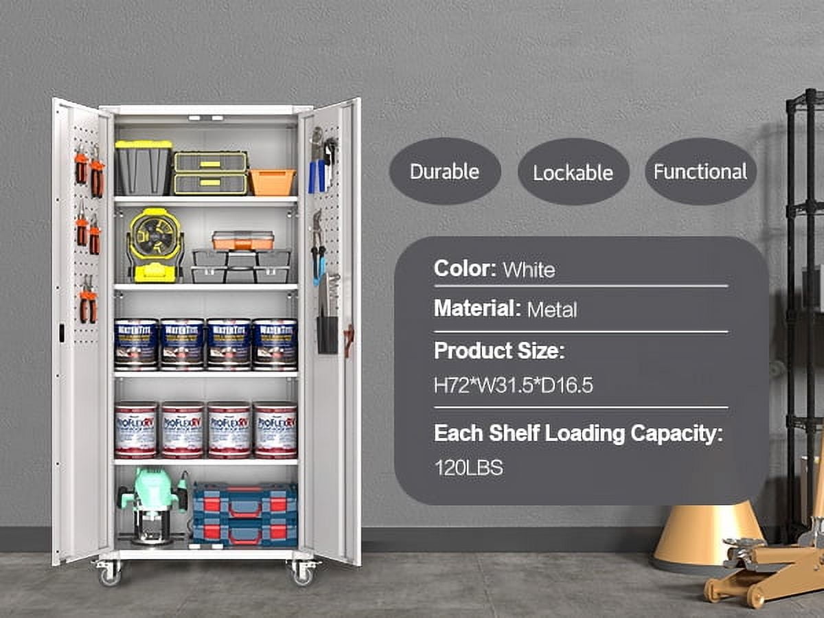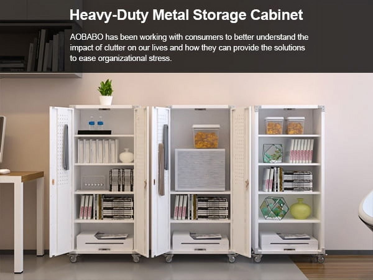 Aobabo 73″ H Metal Storage Cabinet on Wheels for Garage, Locking Metal Storage Cabinet with 4 Shelves, Rolling Tool Storage Cabinet on Wheels, White, Assembly Required.It has five floors, each bearing 120 pounds, and can be used for anything from an office to a garage to a tool room. Both doors and back panels have holes in them for better storage.