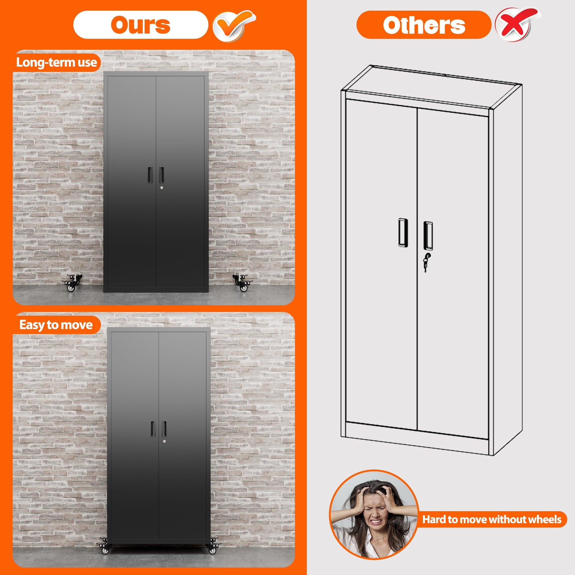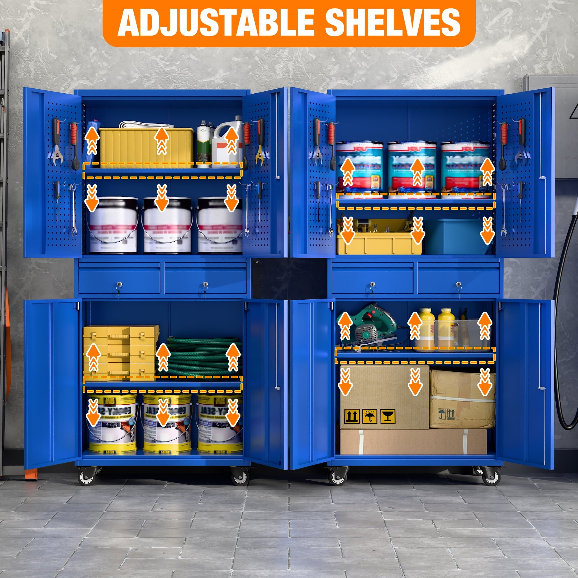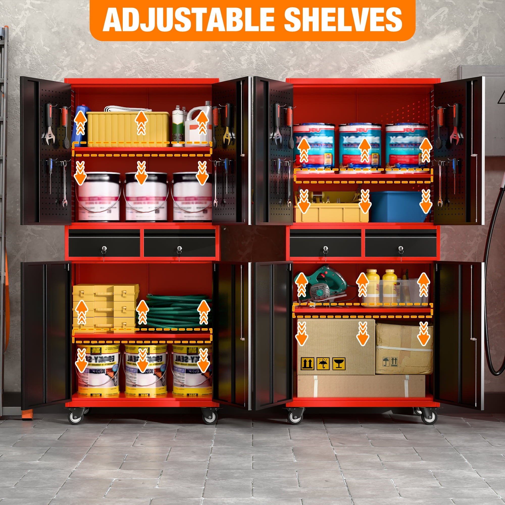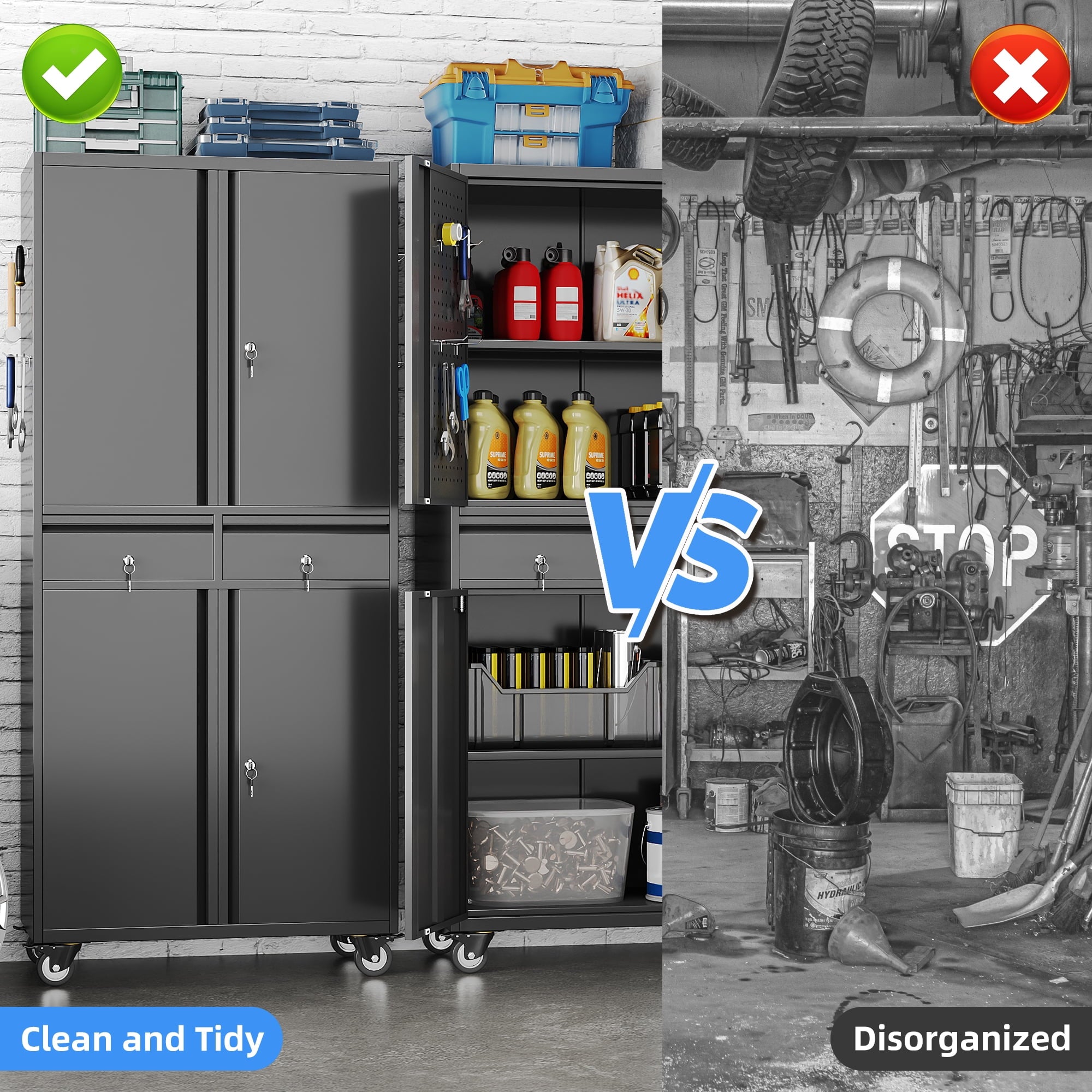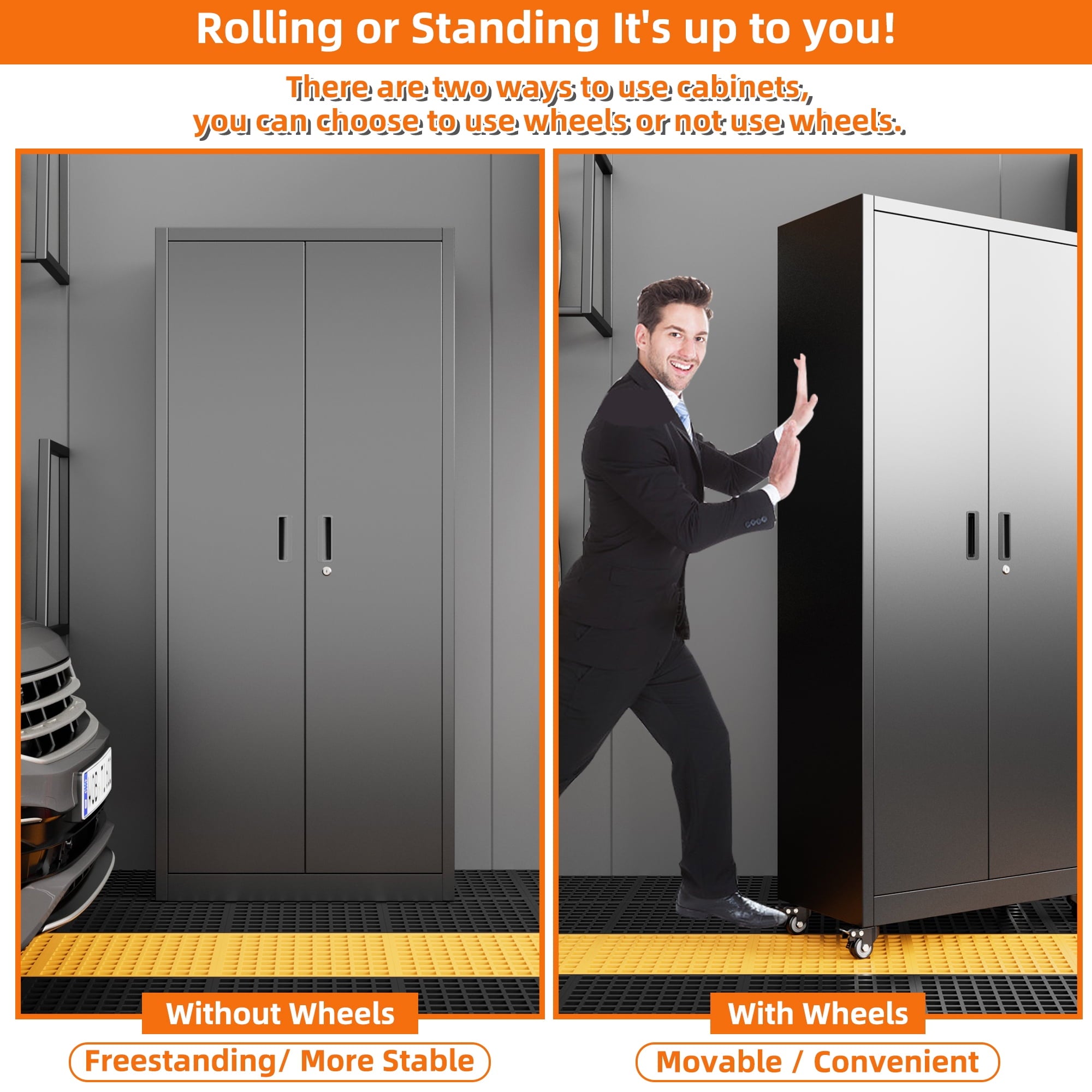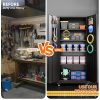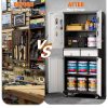 - [Select High-Quality Steel] Garage storage cabinet with wheels is made of cold-rolled steel. The reinforced structural design and high-quality metal materials provide the garage cabinets with good stability and load-bearing capacity.
