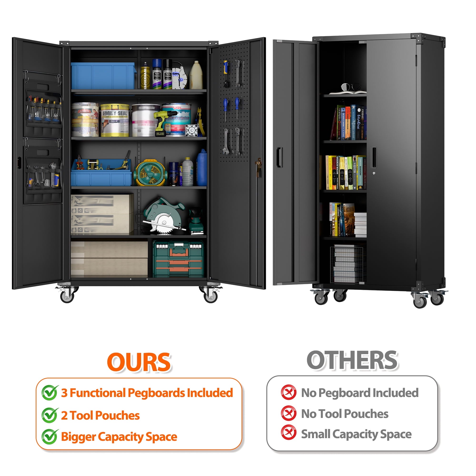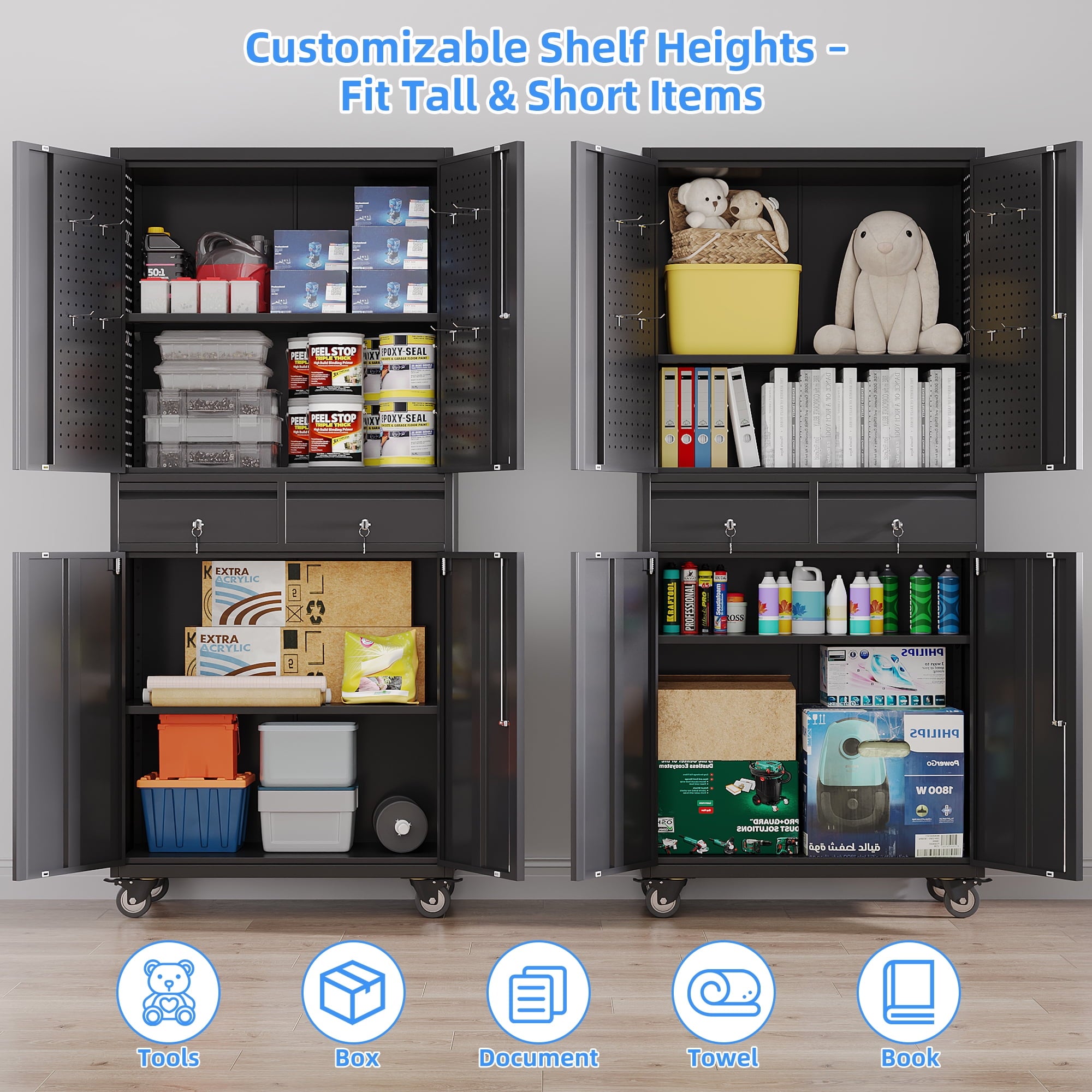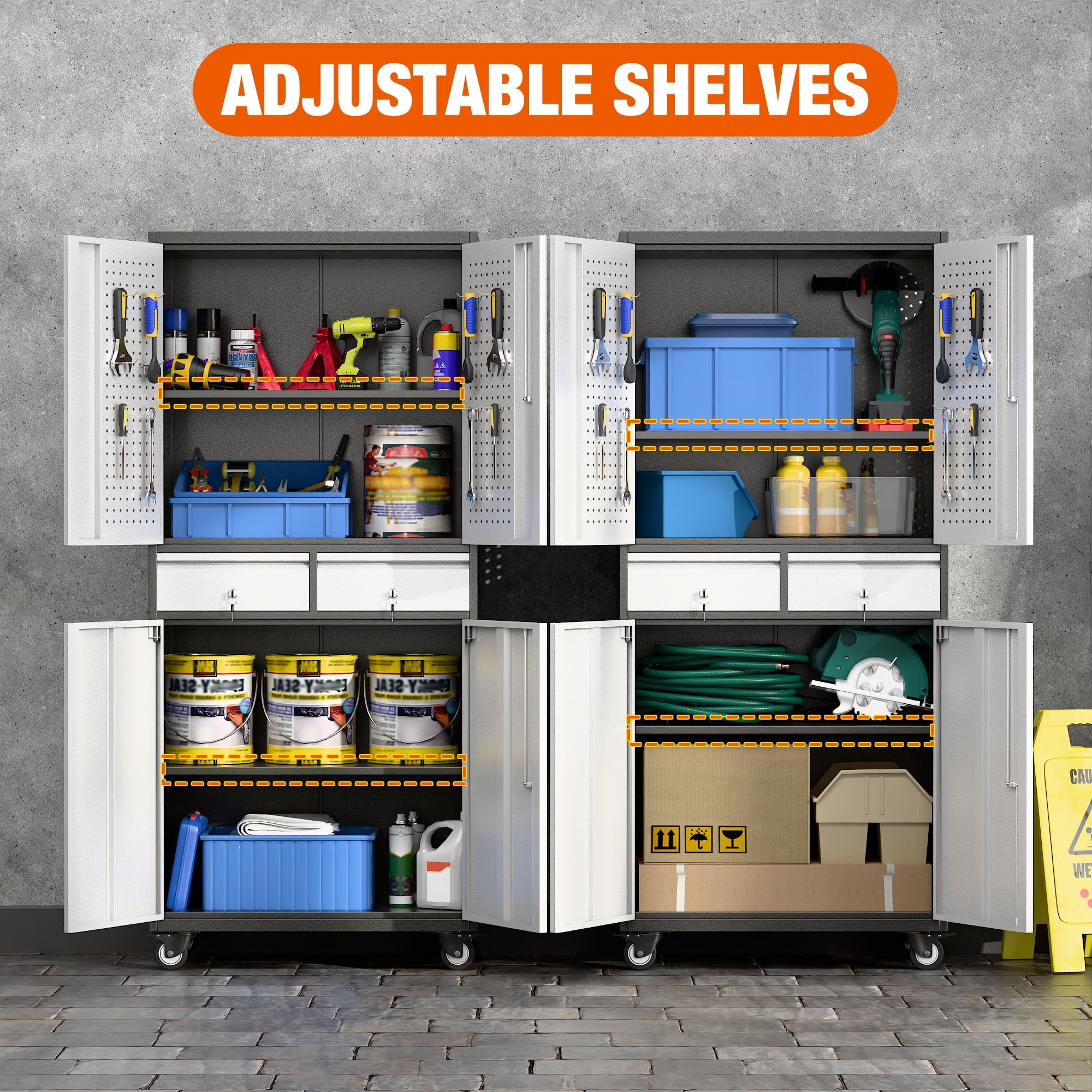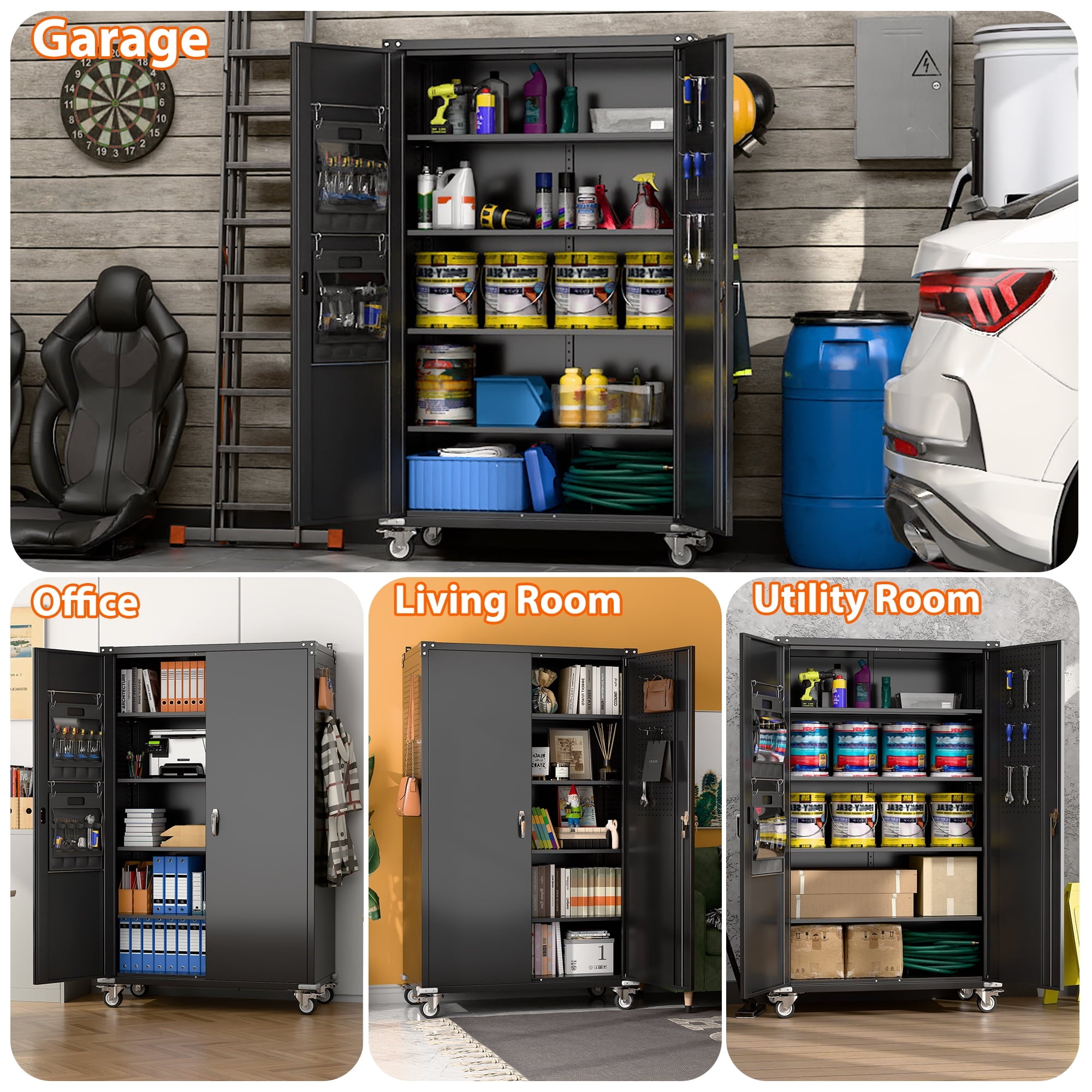 - [Select High-Quality Steel] Garage storage cabinet with wheels is made of cold-rolled steel. The reinforced structural design and high-quality metal materials provide the garage cabinets with good stability and load-bearing capacity.