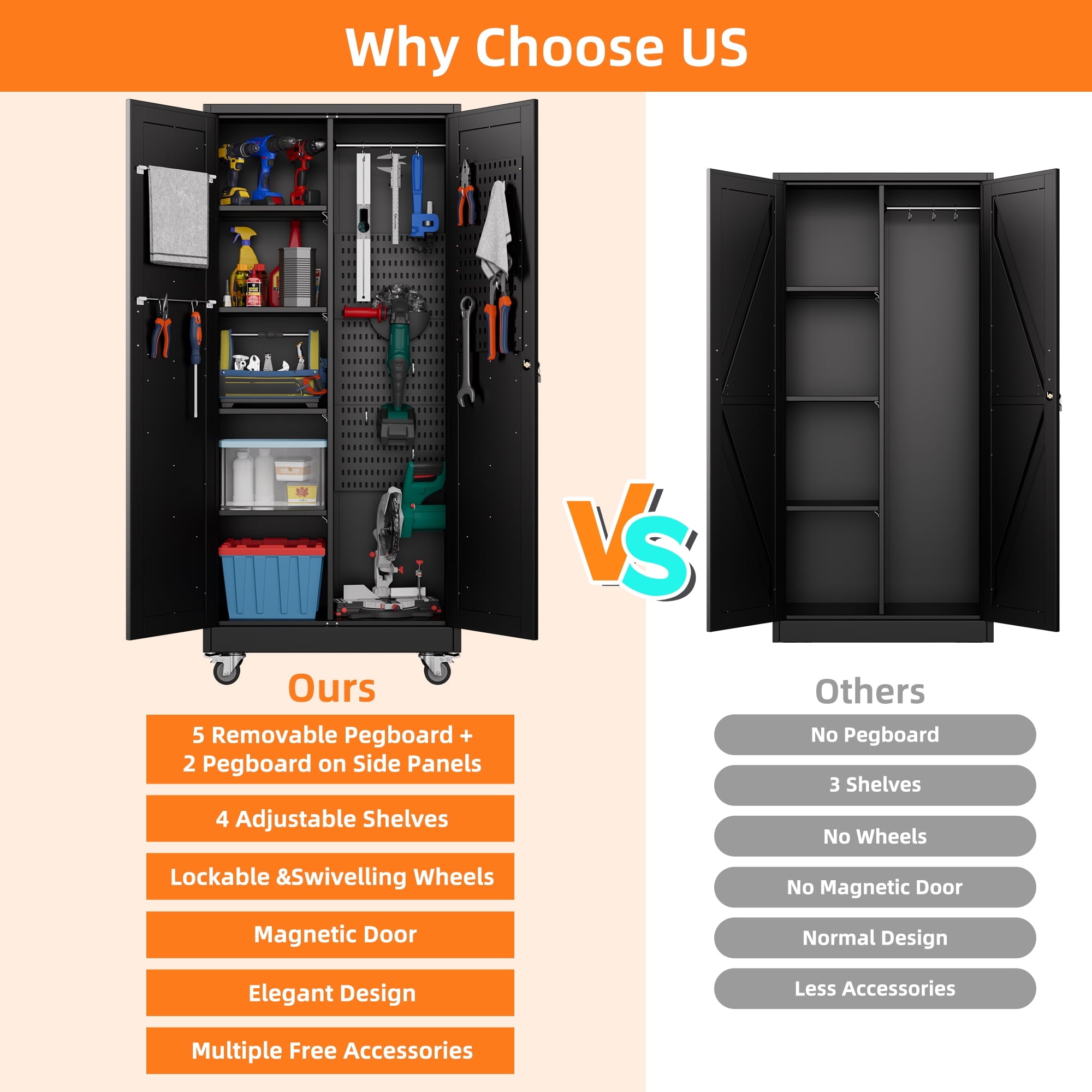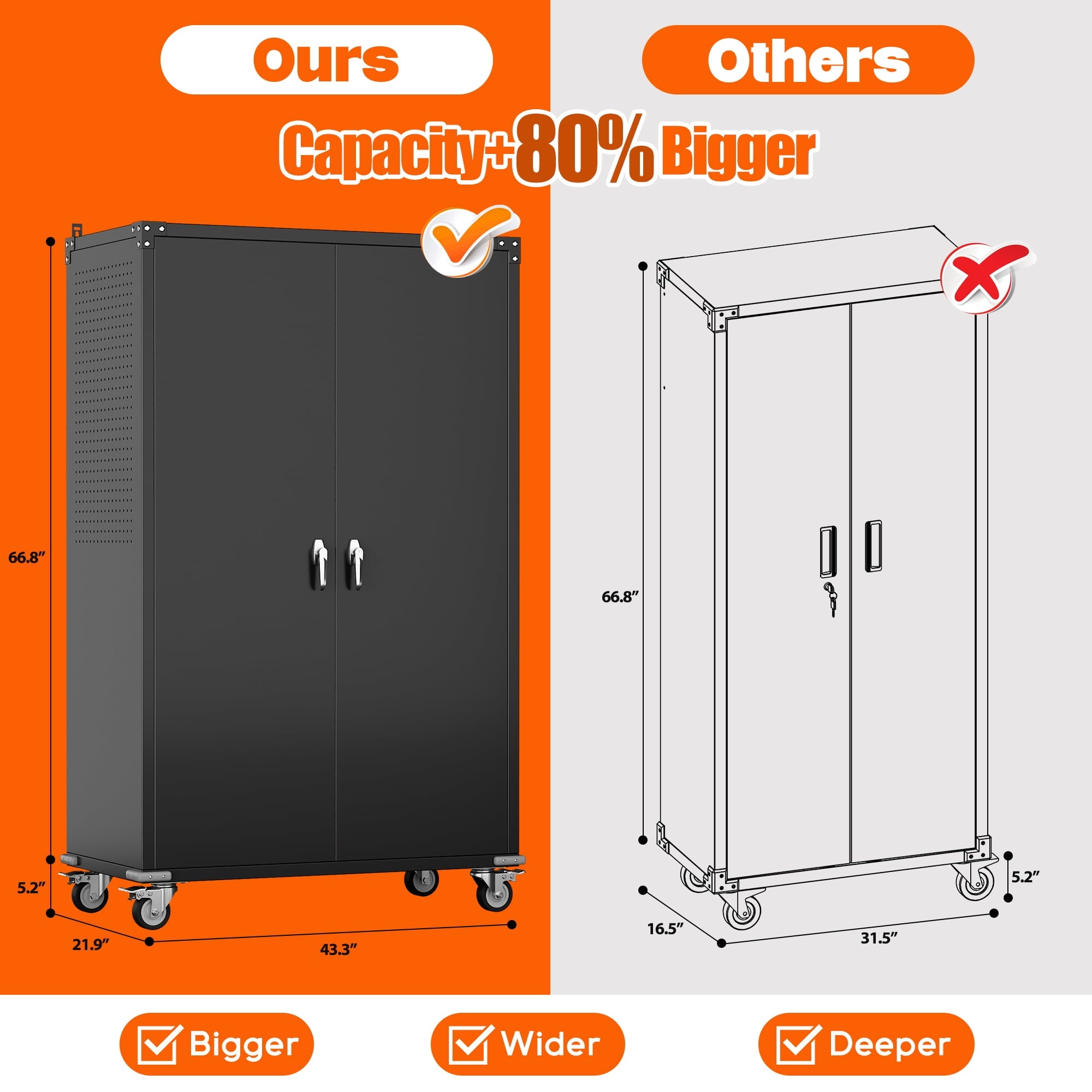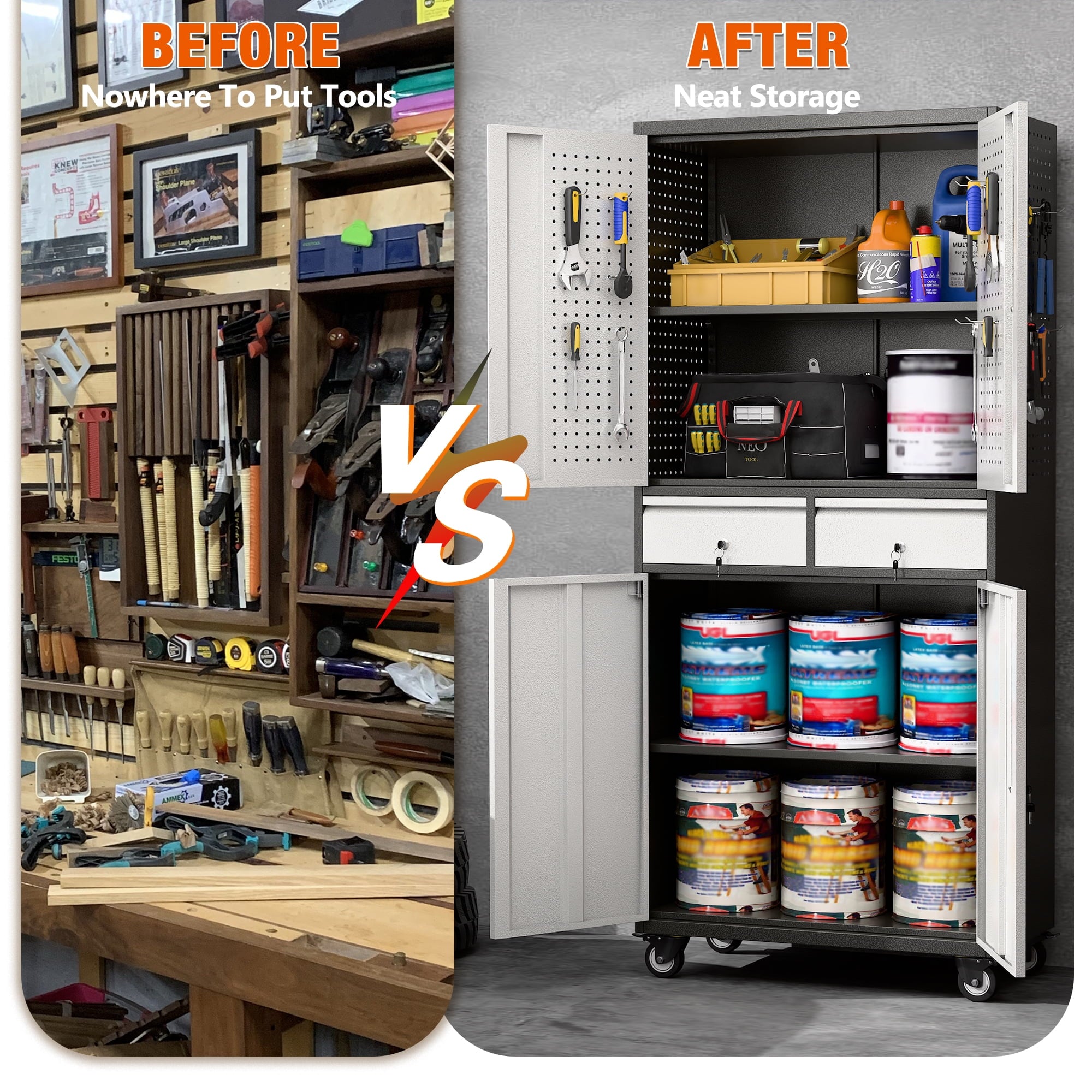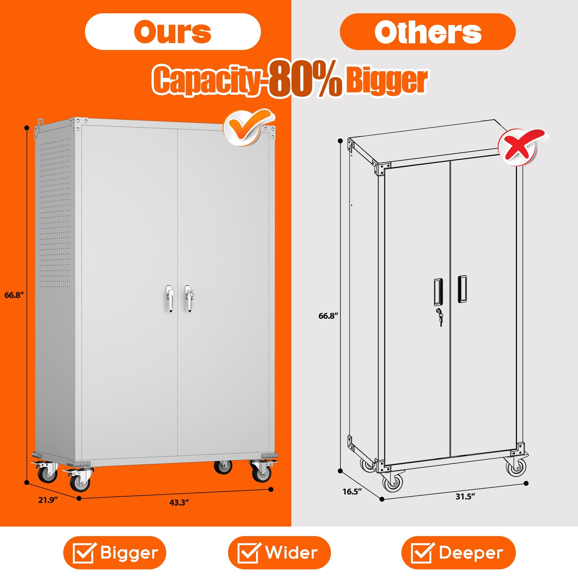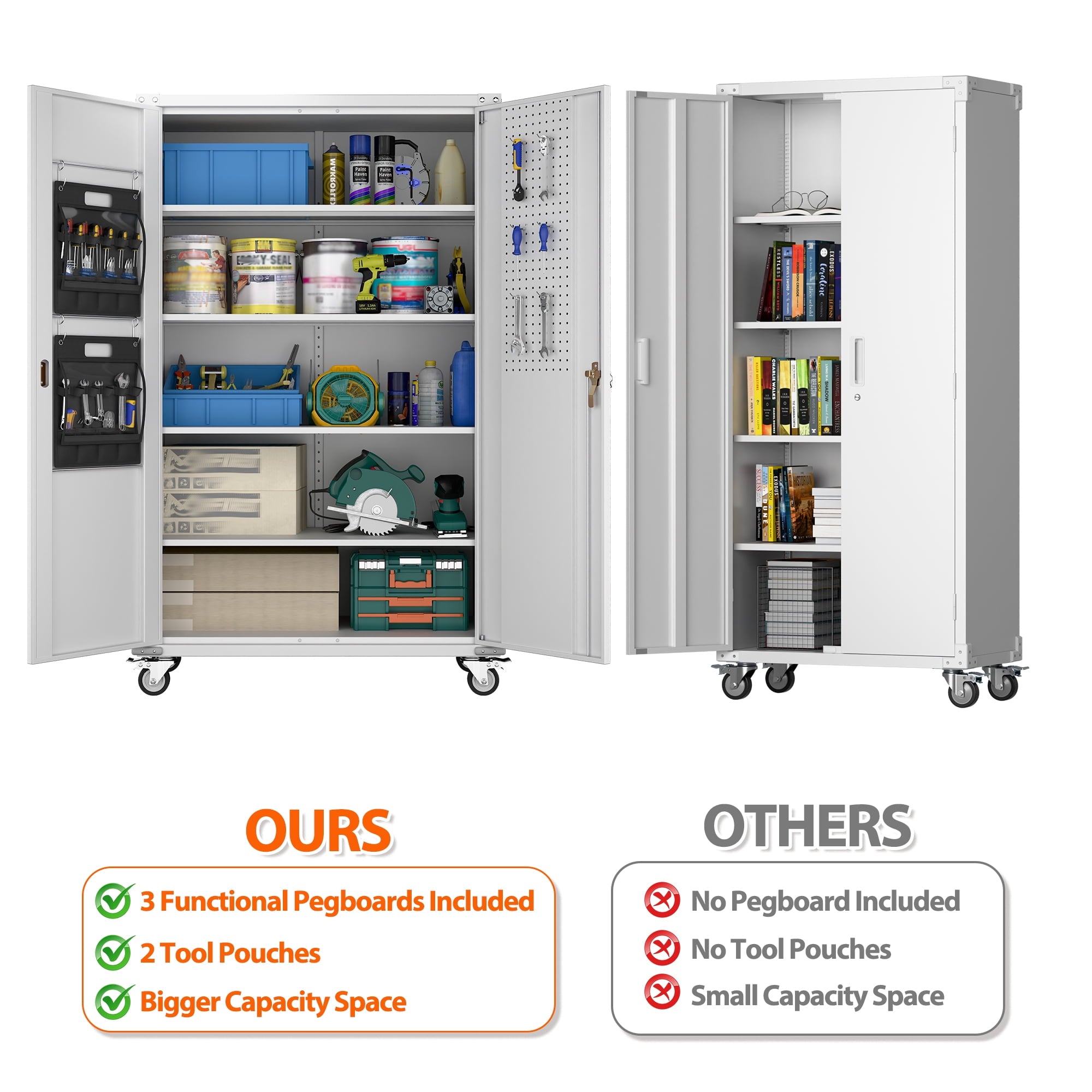 - [Select High-Quality Steel] Garage storage cabinet with wheels is made of cold-rolled steel. The reinforced structural design and high-quality metal materials provide the garage cabinets with good stability and load-bearing capacity.
