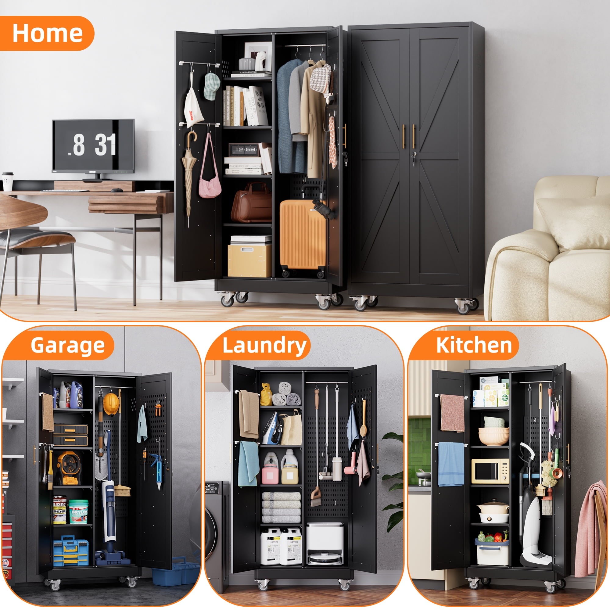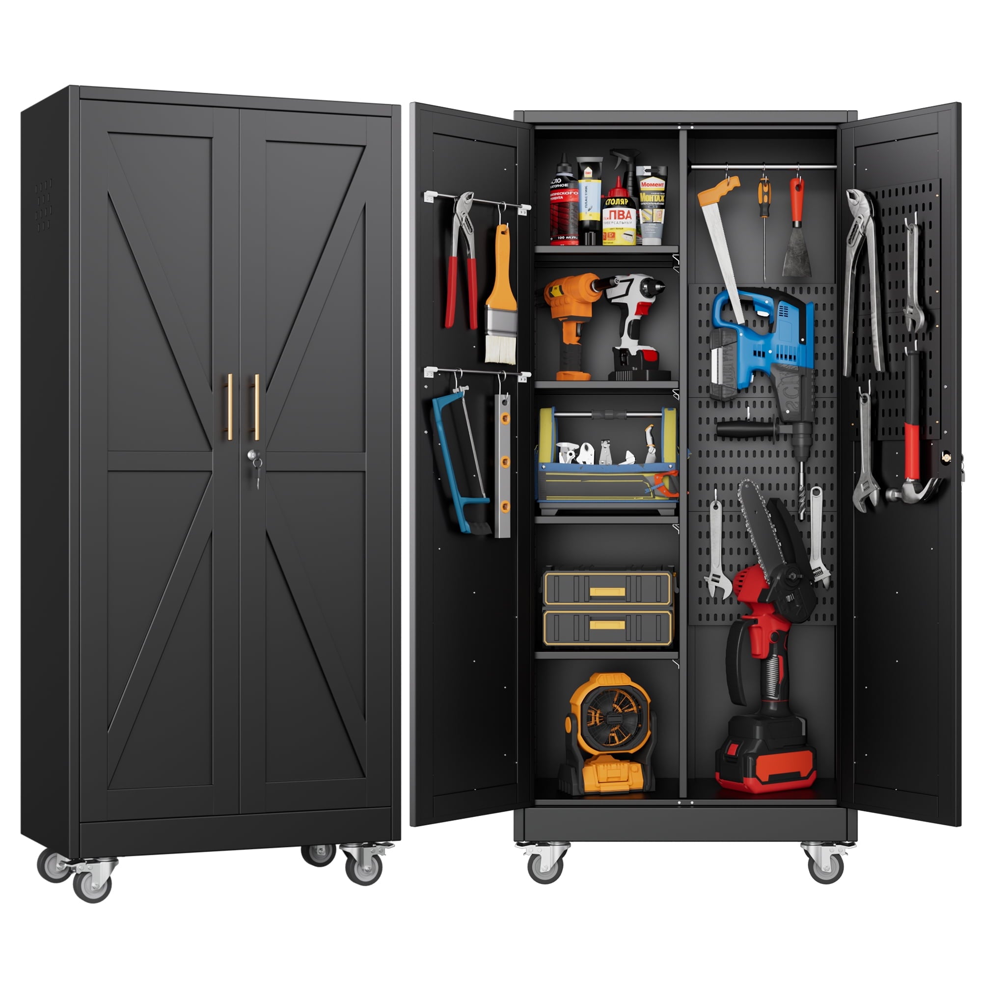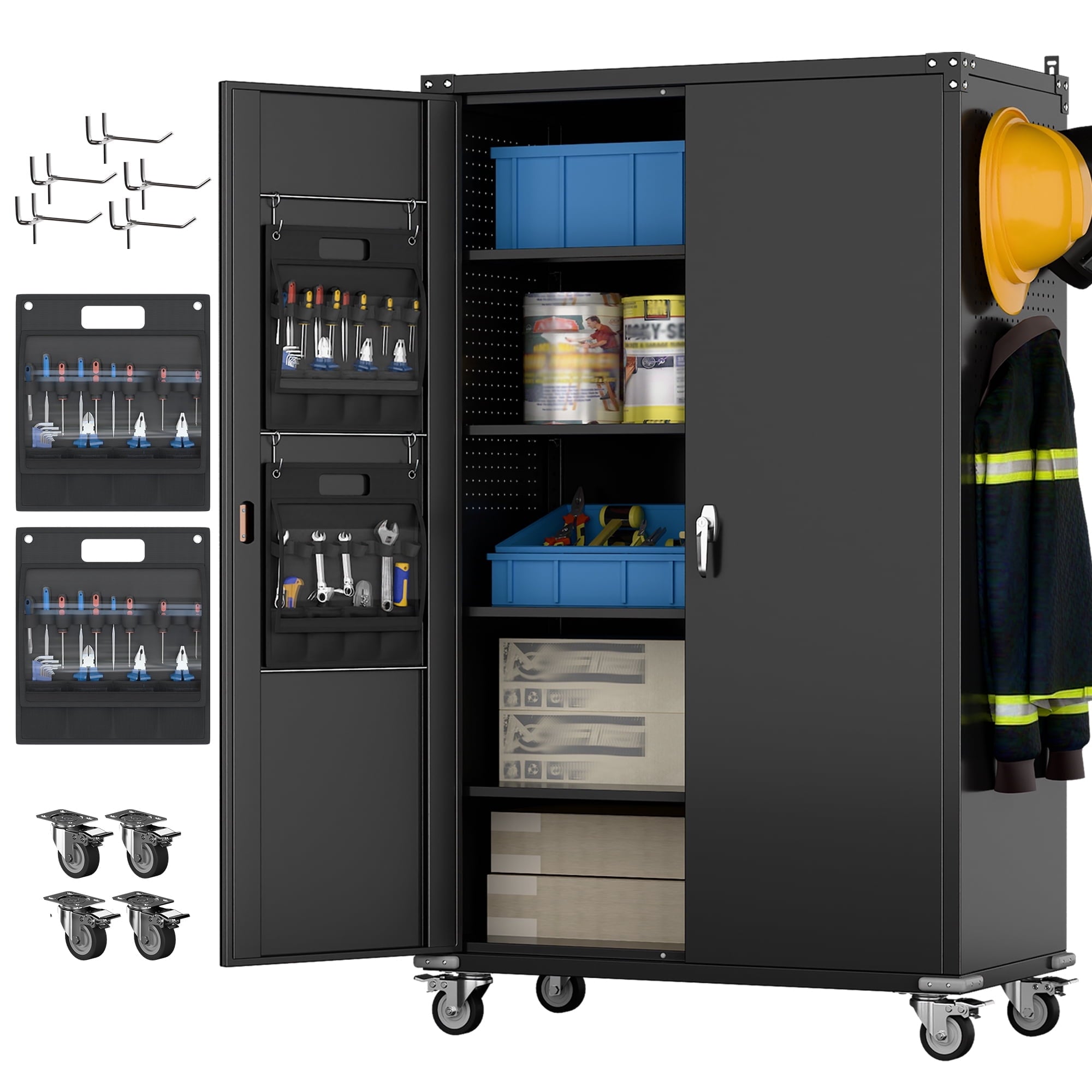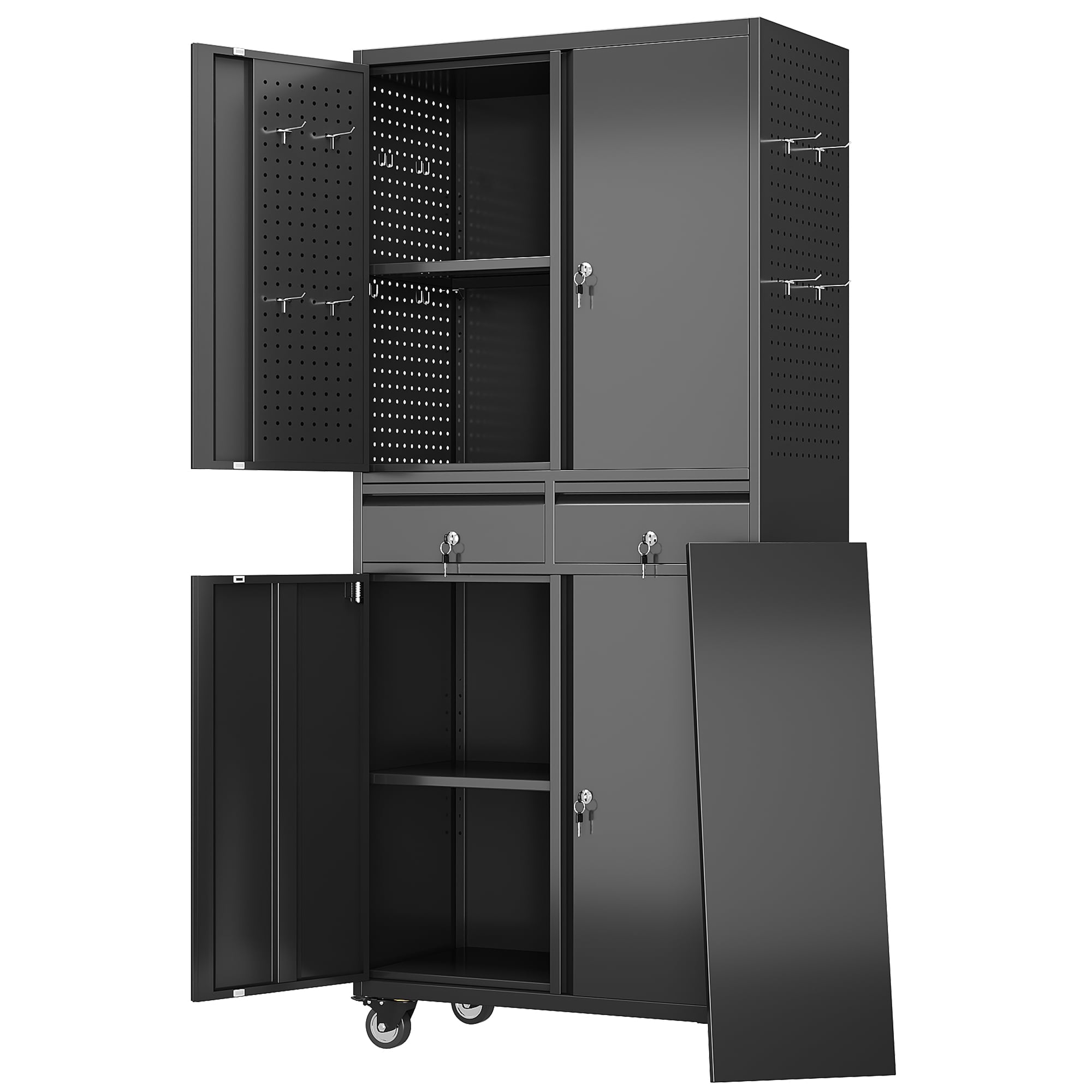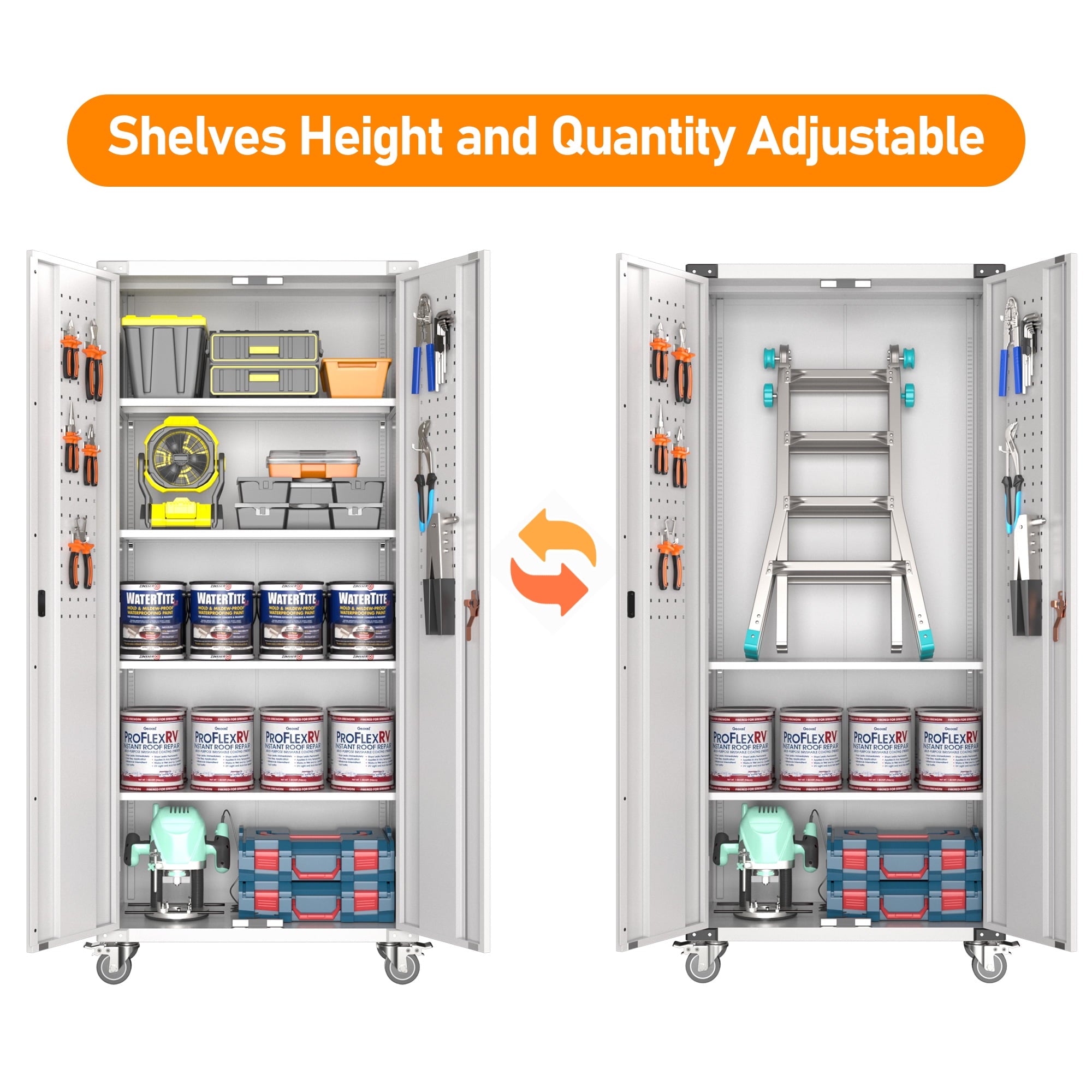 - [Select High-Quality Steel] Garage storage cabinet with wheels is made of cold-rolled steel. The reinforced structural design and high-quality metal materials provide the garage cabinets with good stability and load-bearing capacity.