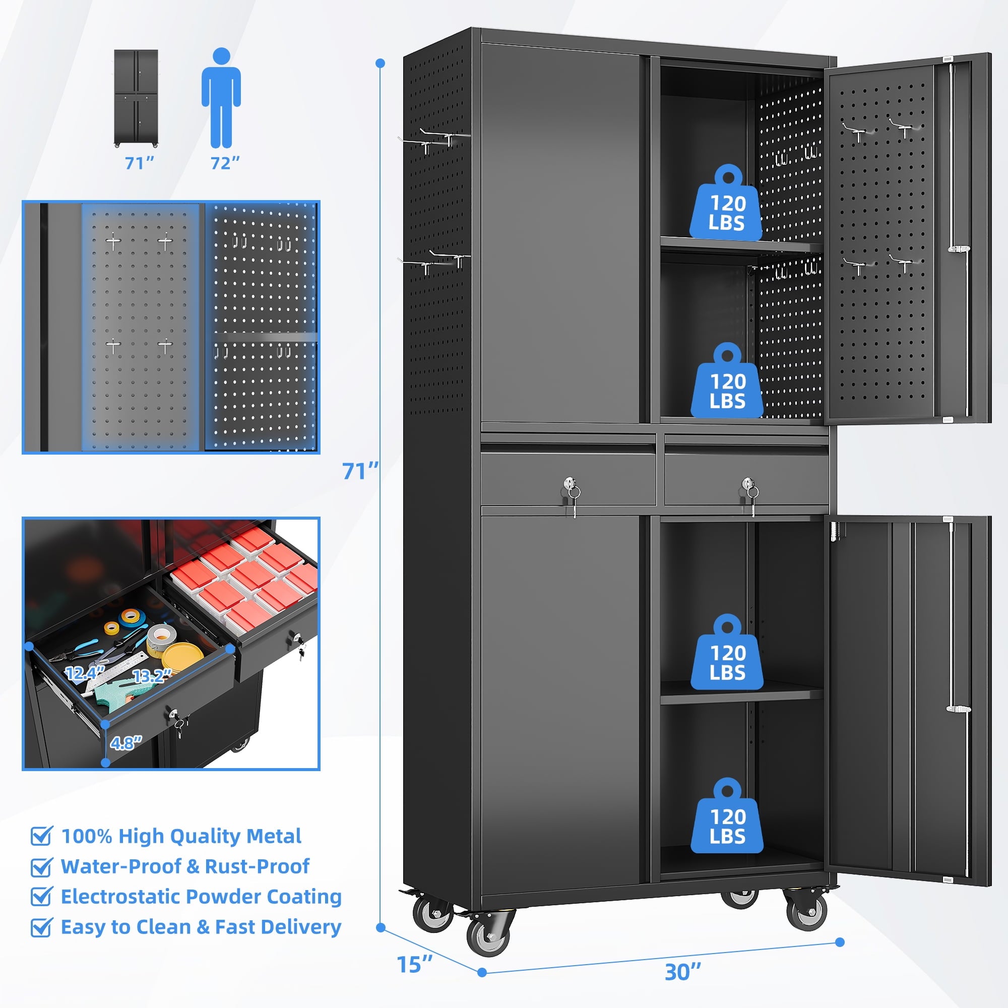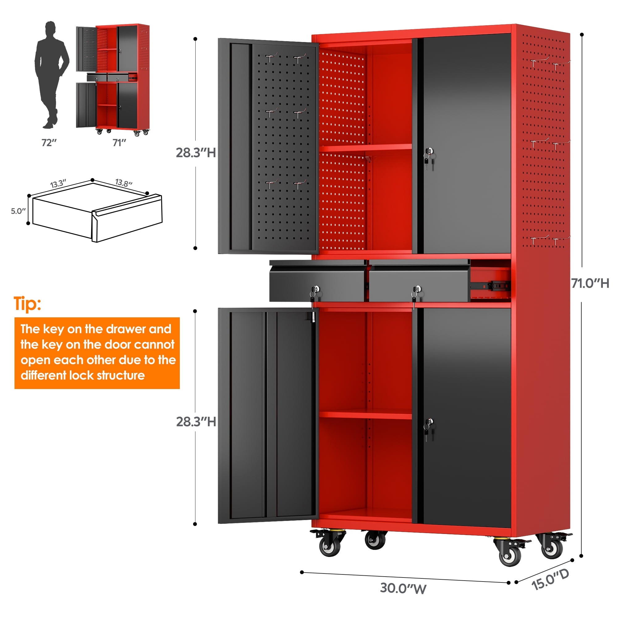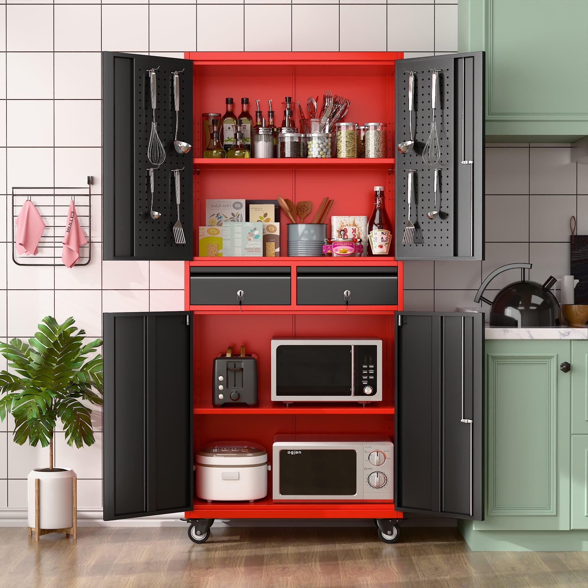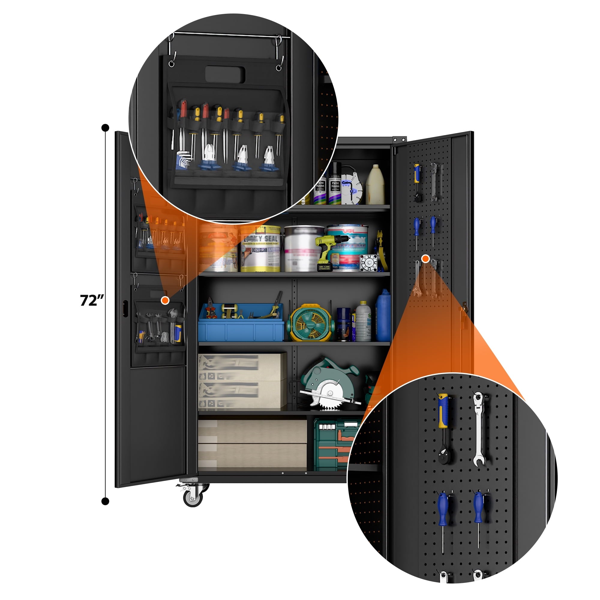 - [Select High-Quality Steel] Garage storage cabinet with wheels is made of cold-rolled steel. The reinforced structural design and high-quality metal materials provide the garage cabinets with good stability and load-bearing capacity.