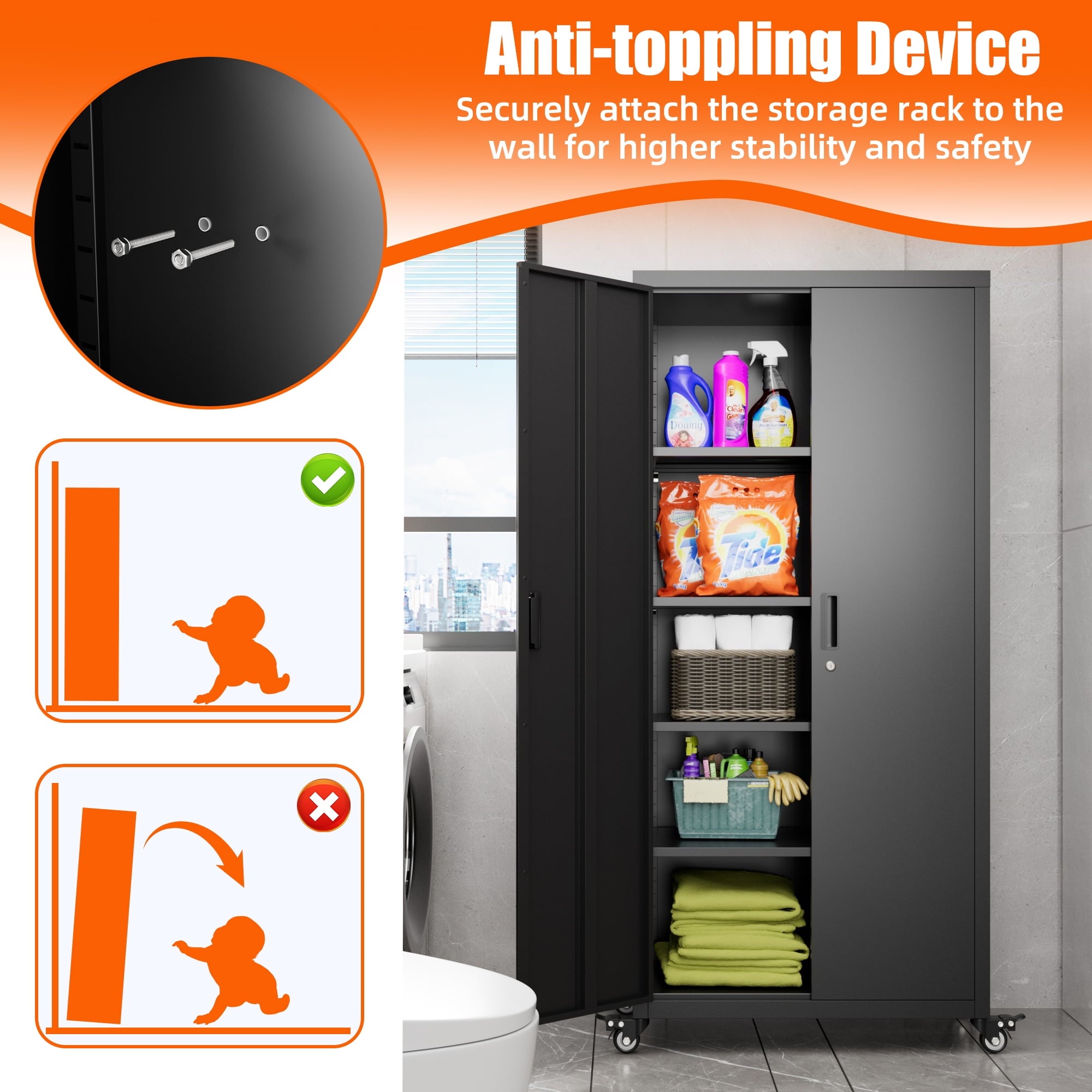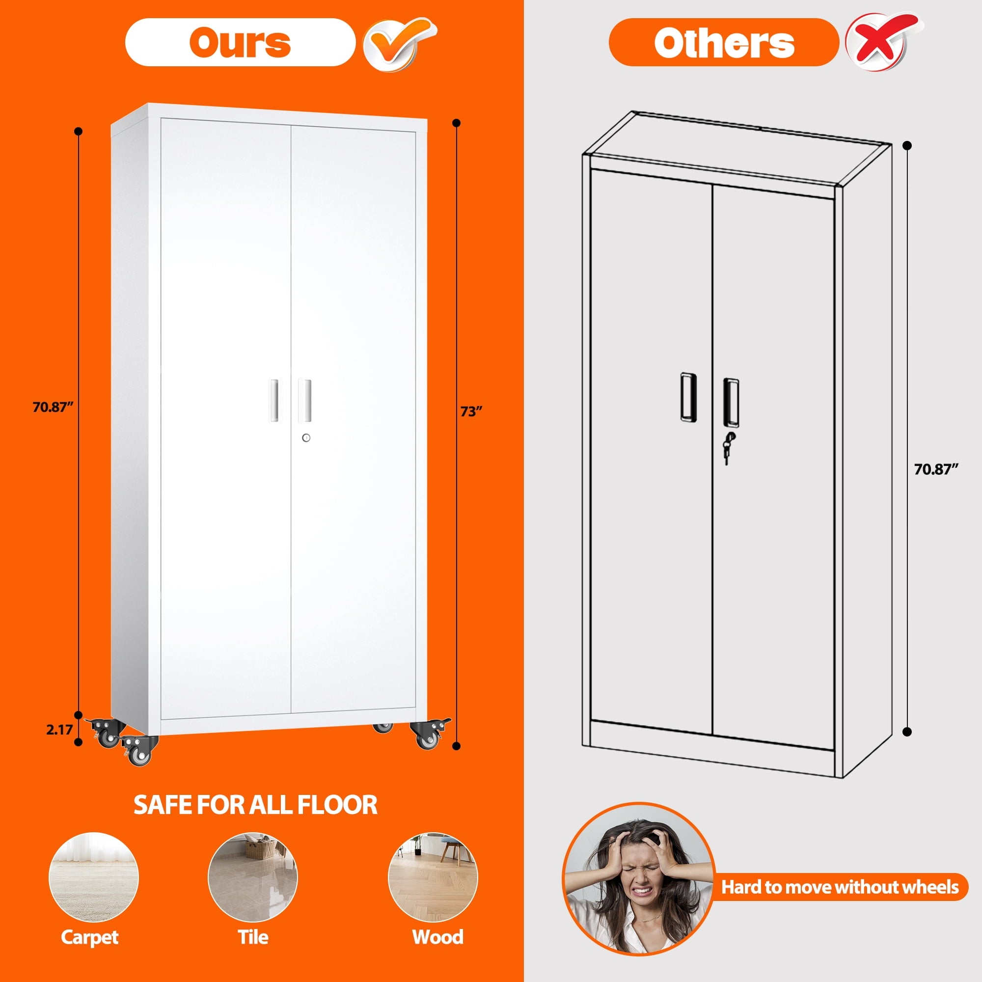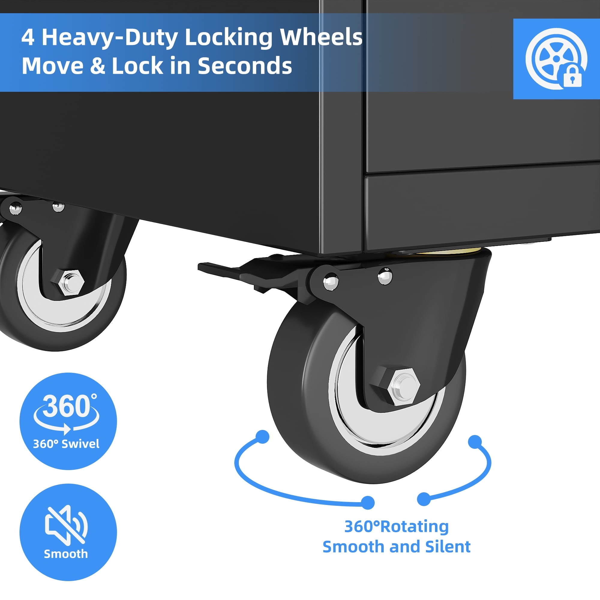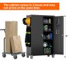 - [Swive Wheels with Lock] Metal Storage Cabinet with wheels has 4 small lockable wheels, you can move them around as needed and the casters and wheels work great on all the different surfaces, besides the wheels can be locked and you can fix the cabinet where you want to place.
