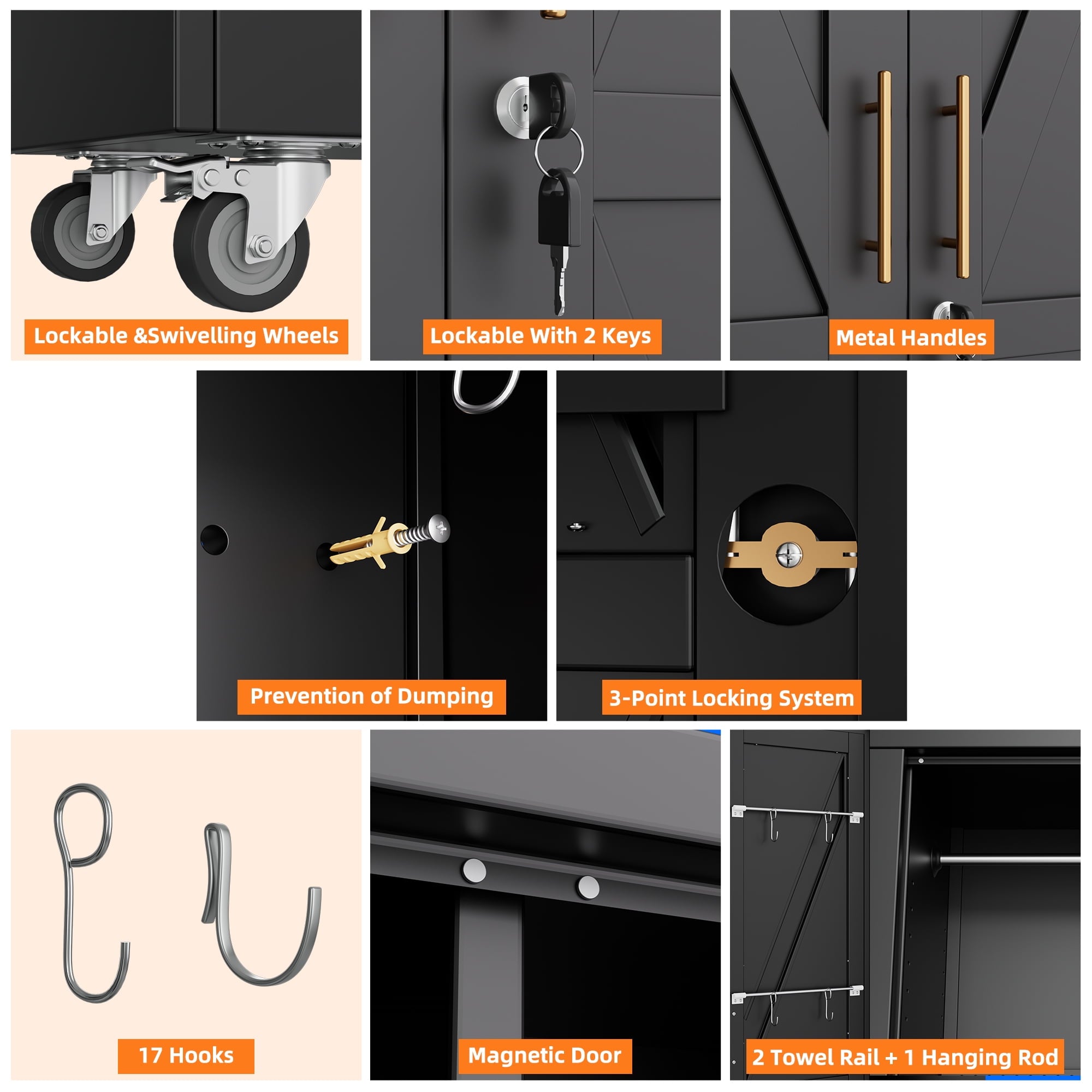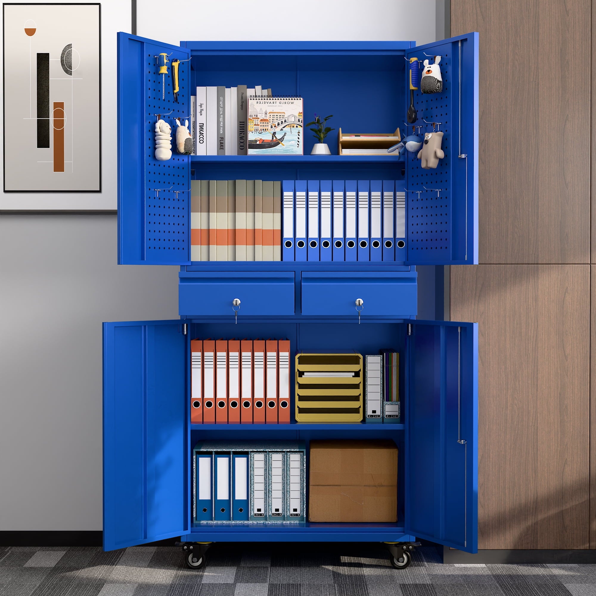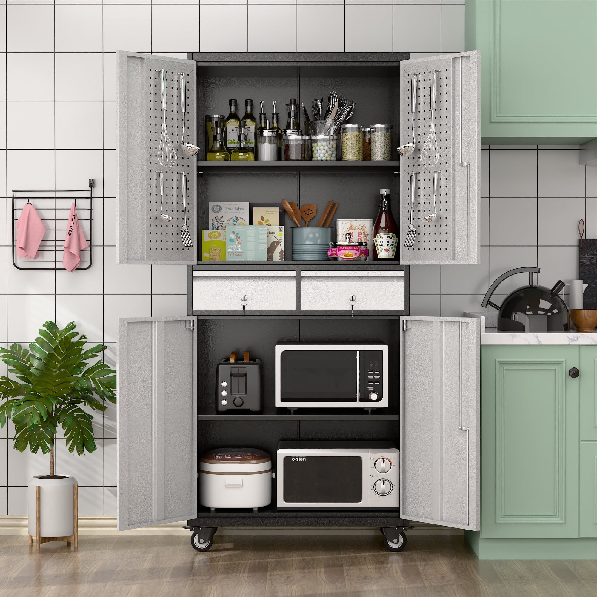 - [Swive Wheels with Lock] Metal Storage Cabinet with wheels has 4 small lockable wheels, you can move them around as needed and the casters and wheels work great on all the different surfaces, besides the wheels can be locked and you can fix the cabinet where you want to place.
