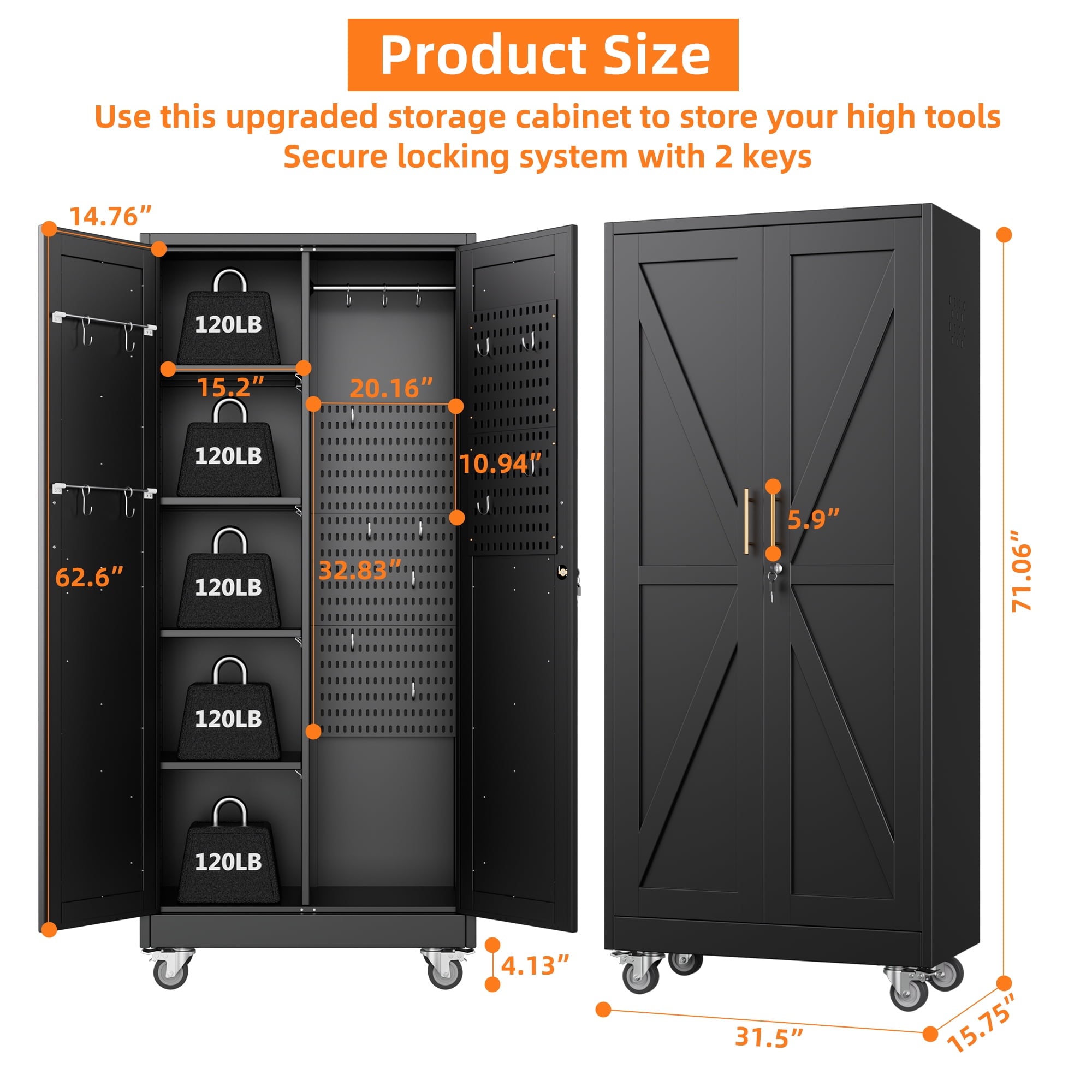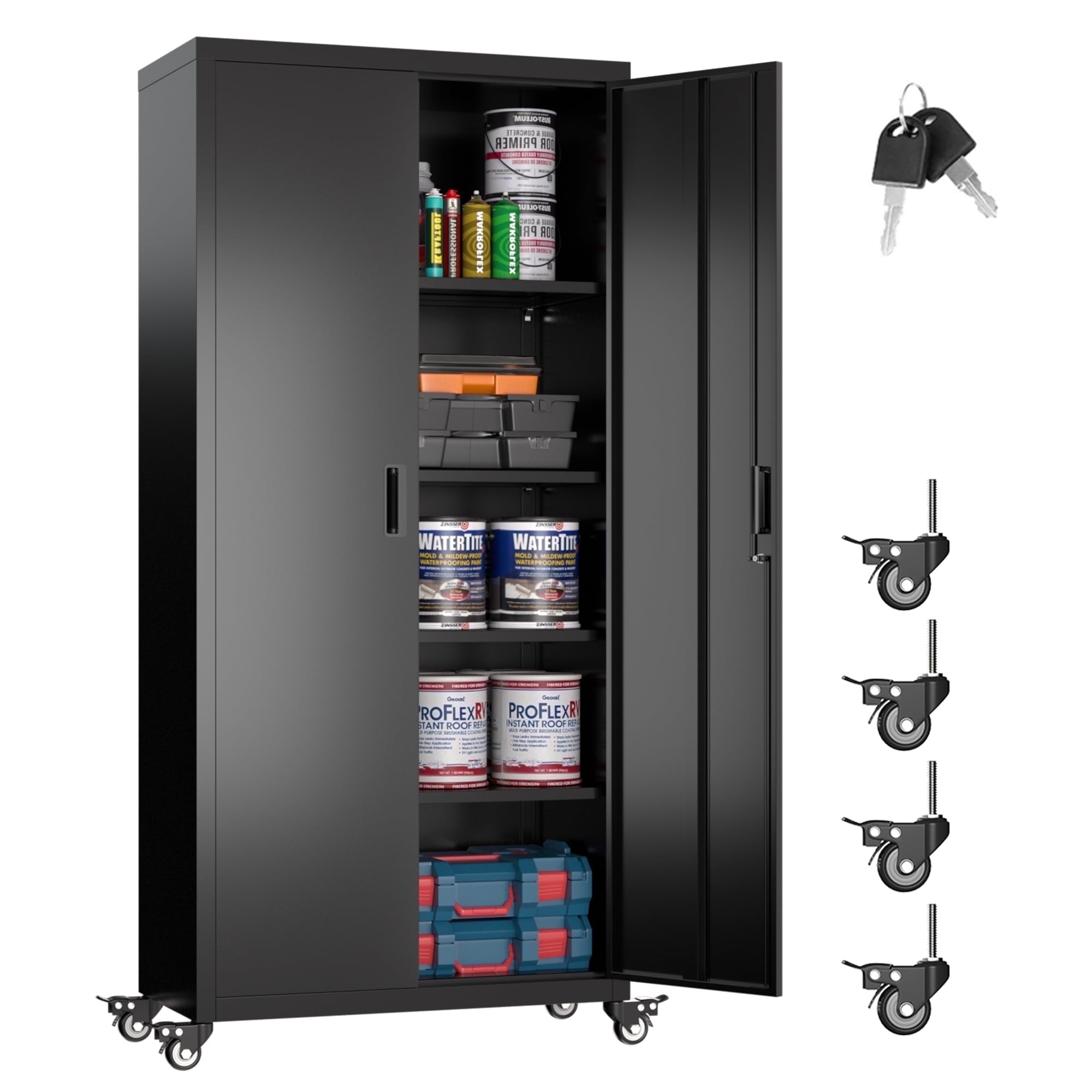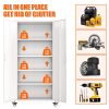 - [Adjustable Shelves&Large Weight Capacity] The metal garage storage cabinet with wheels has 4 adjustable and removable shelves, which can offer you flexible space. Each shelf of the storage cabinet on wheels can hold up to 120lbs. you can add lighting by yourself on top of the cabinet if it was dark where you keep it.