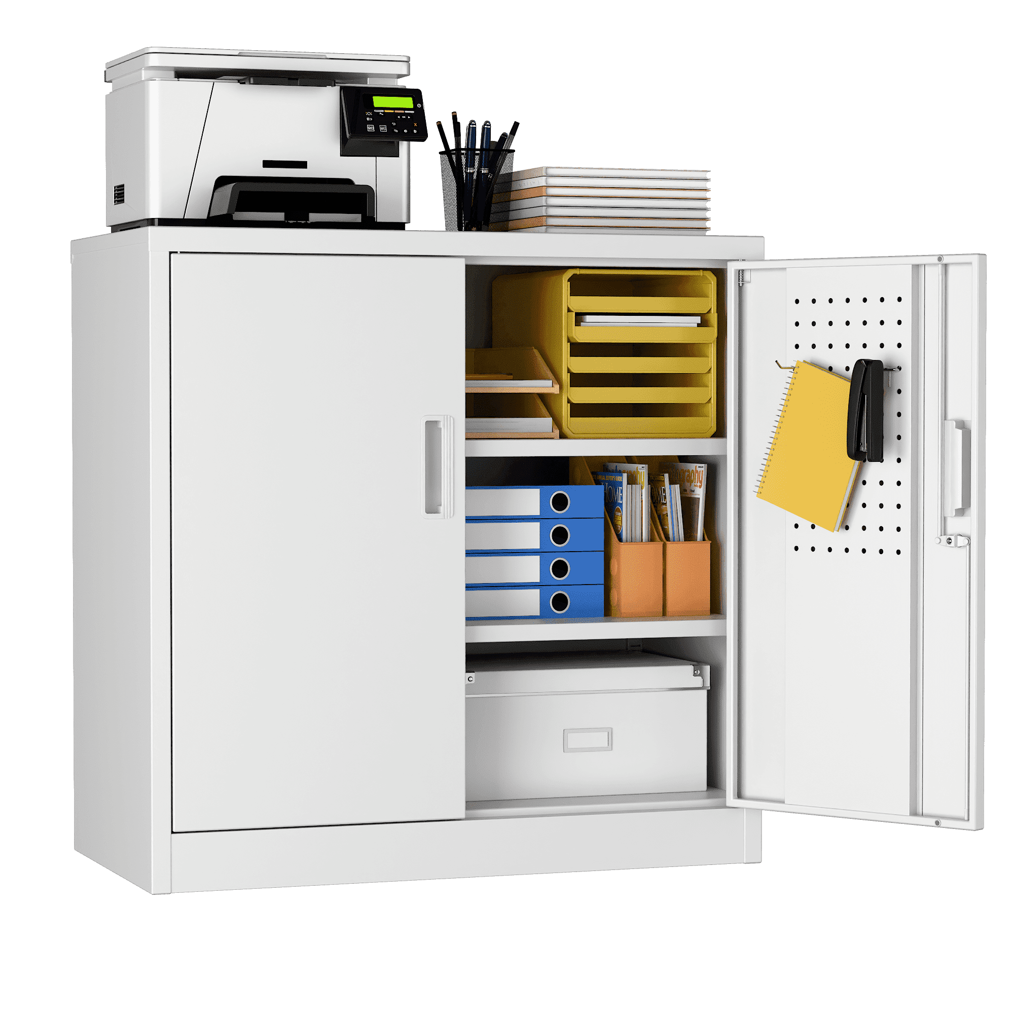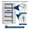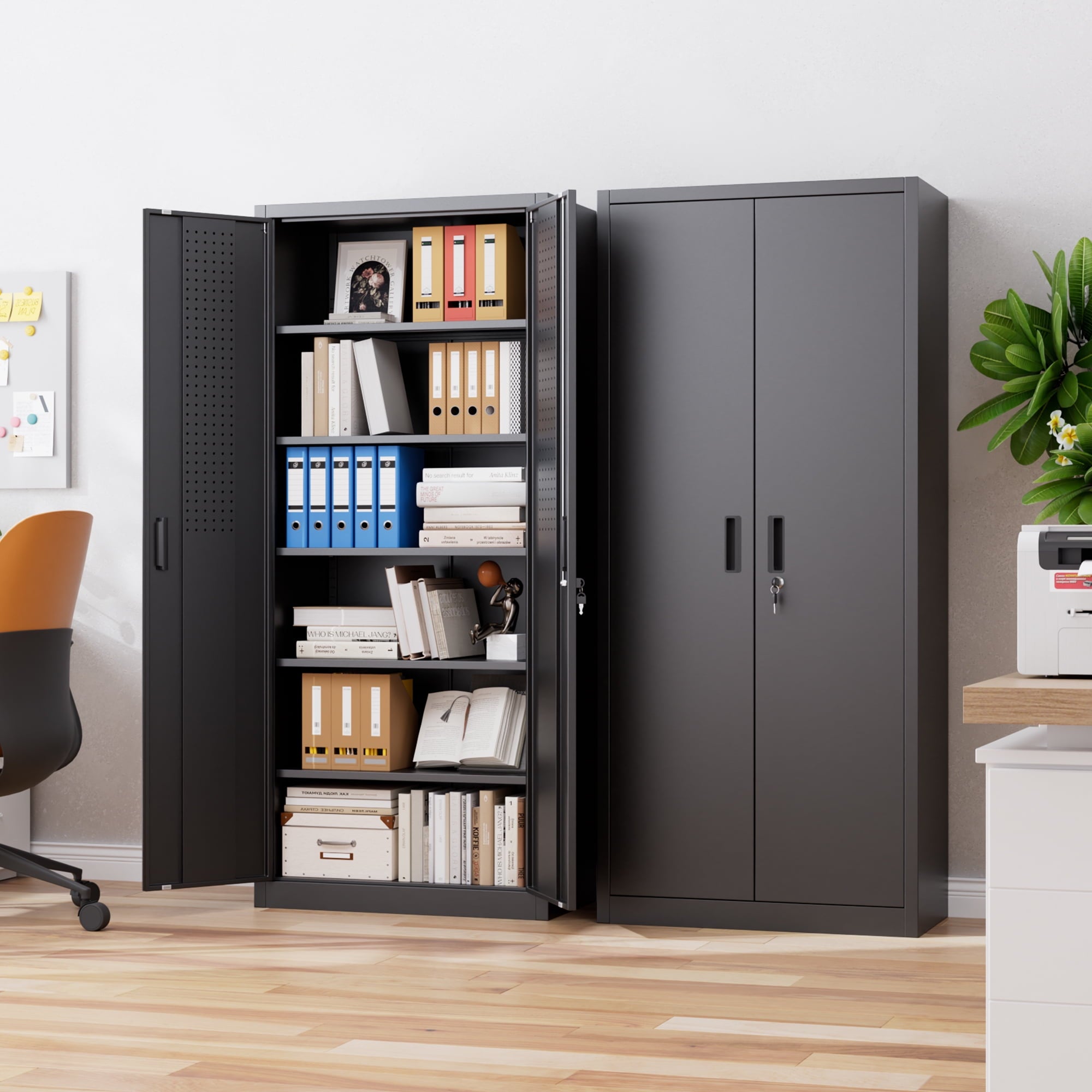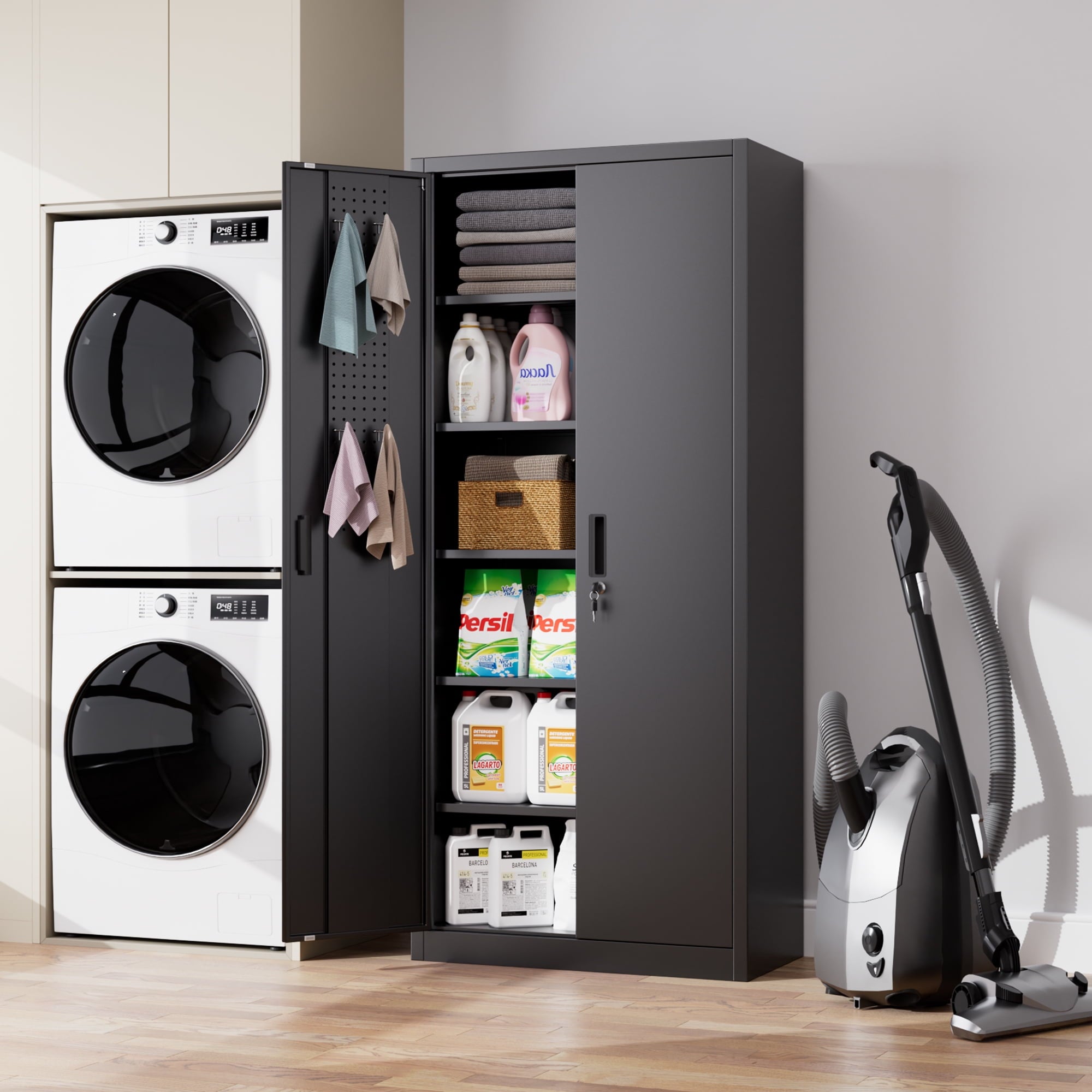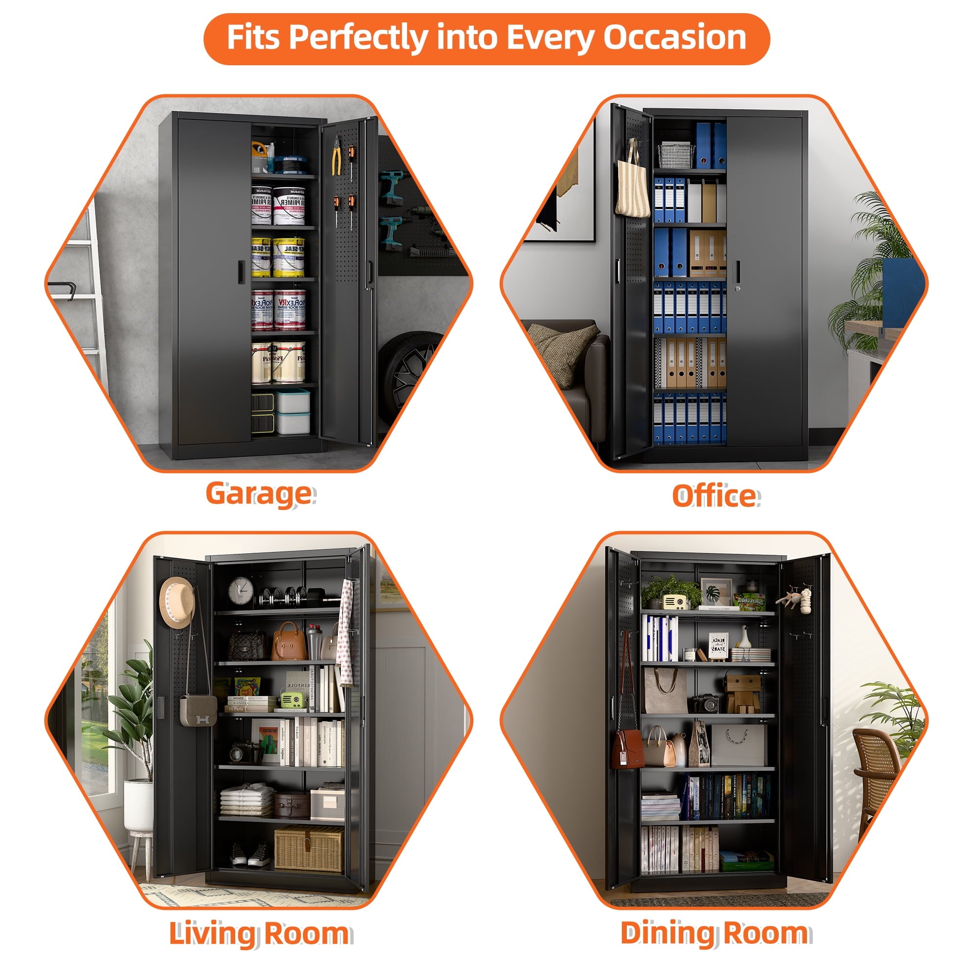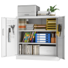 We focus on providing solution for your storage and organization needs in daily life.The upgraded metal storage cabinet has 5 adjustable partitions and a nail board behind the door, increasing your vertical storage space.Created with functional and maximized