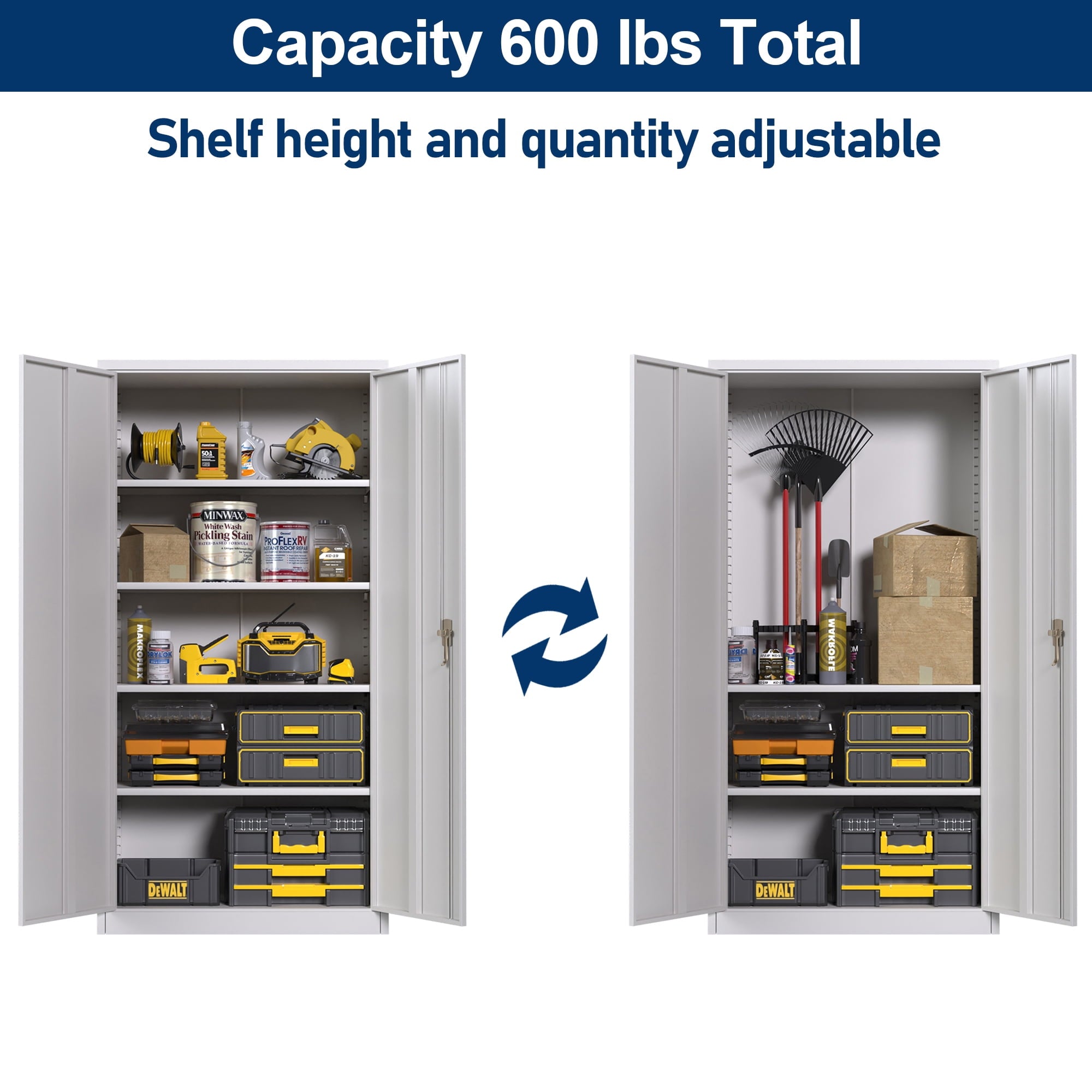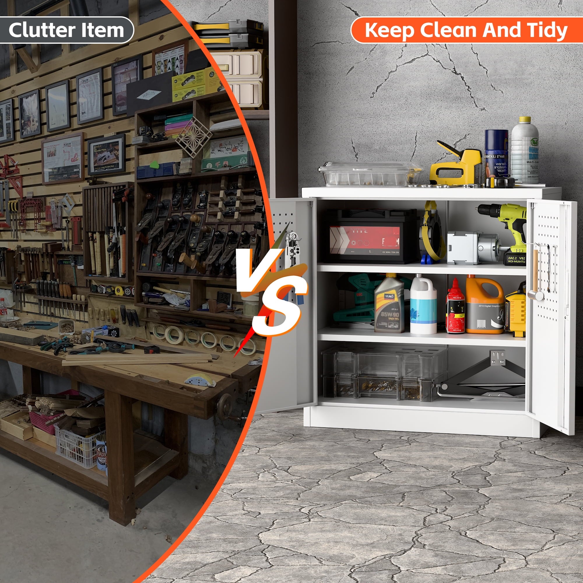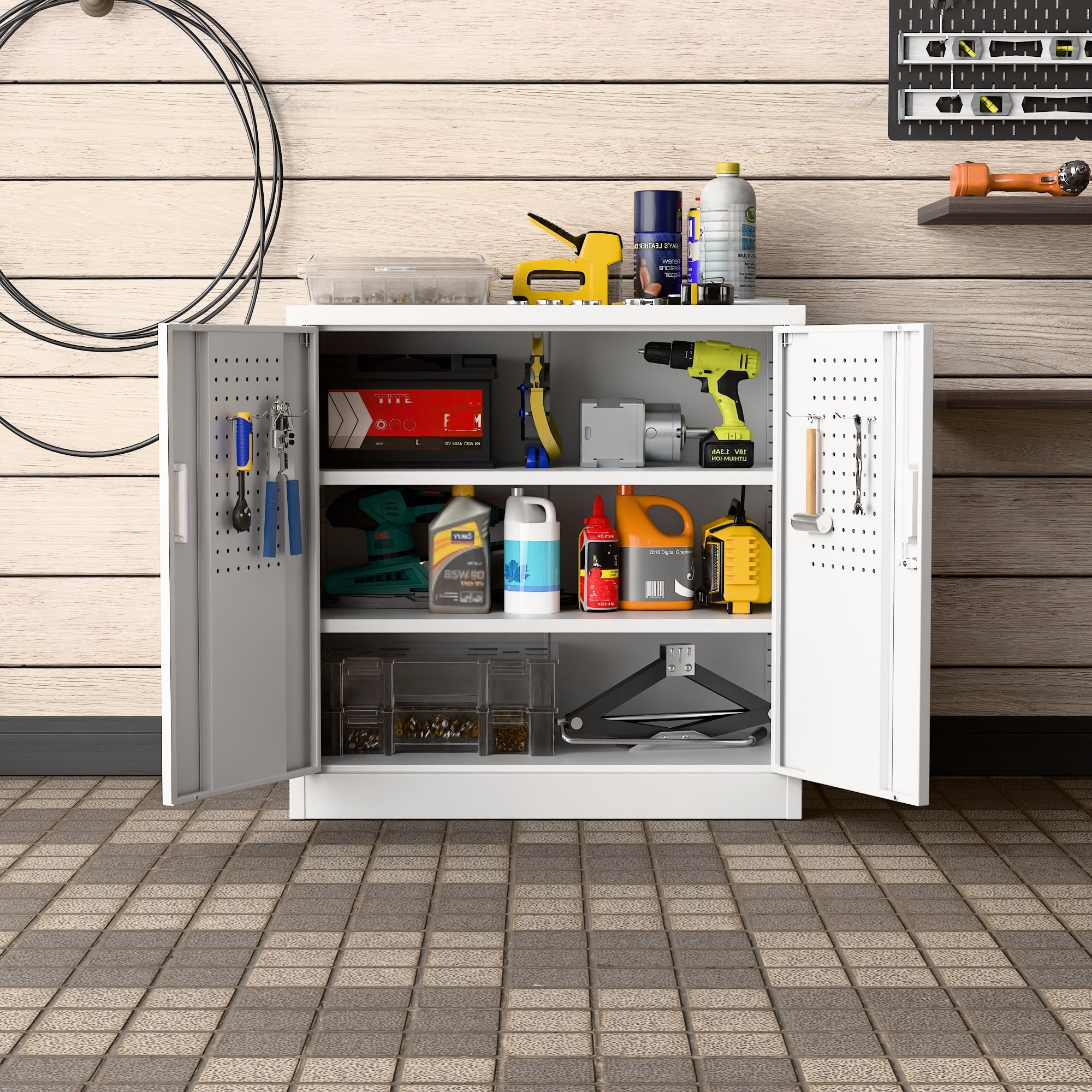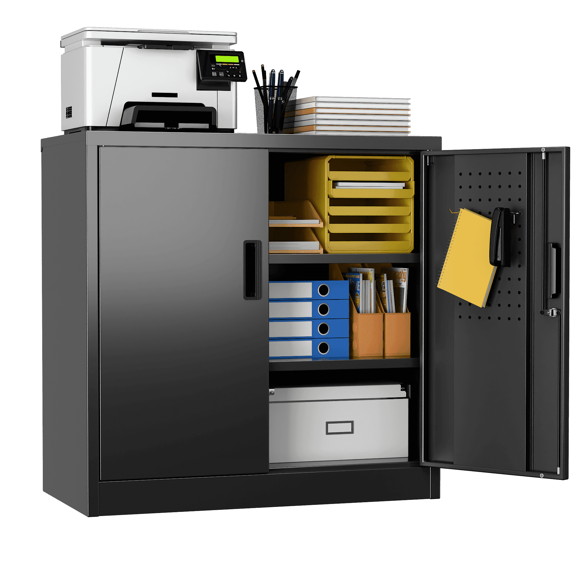 We focus on providing solution for your storage and organization needs in daily life.The upgraded metal storage cabinet has 5 adjustable partitions and a nail board behind the door, increasing your vertical storage space.Created with functional and maximized
