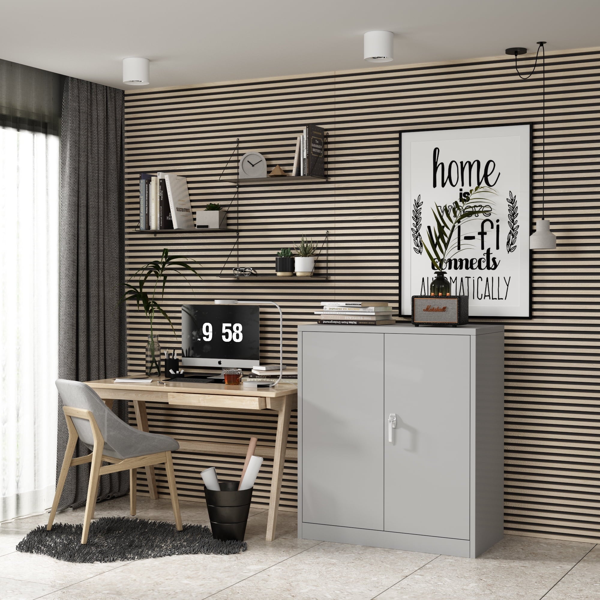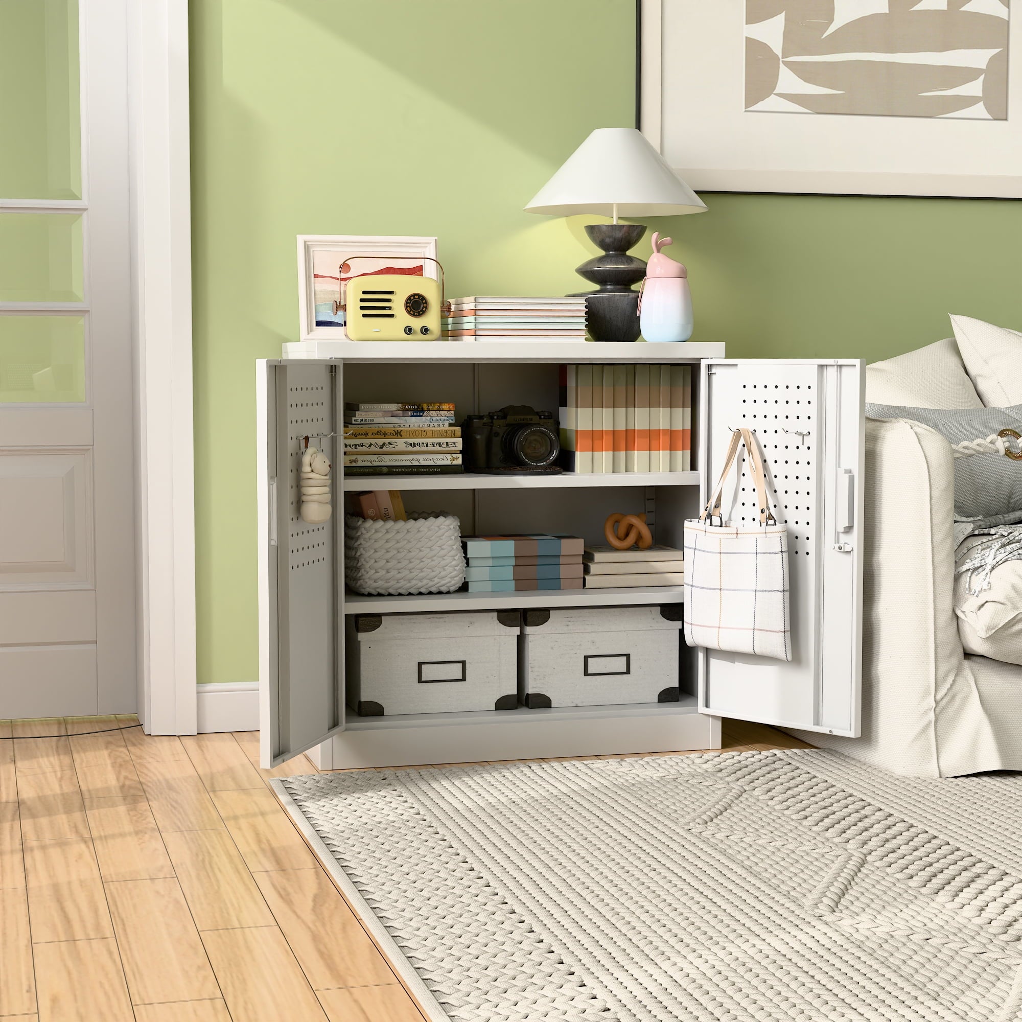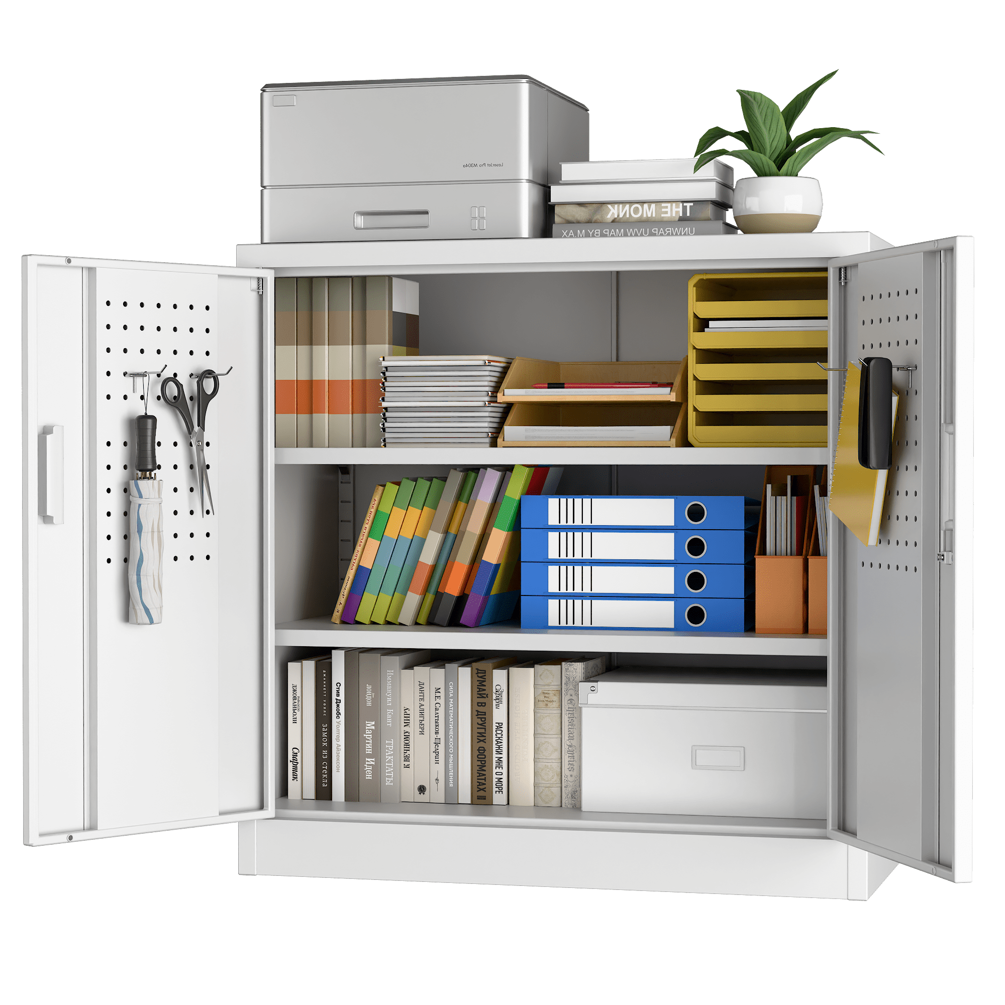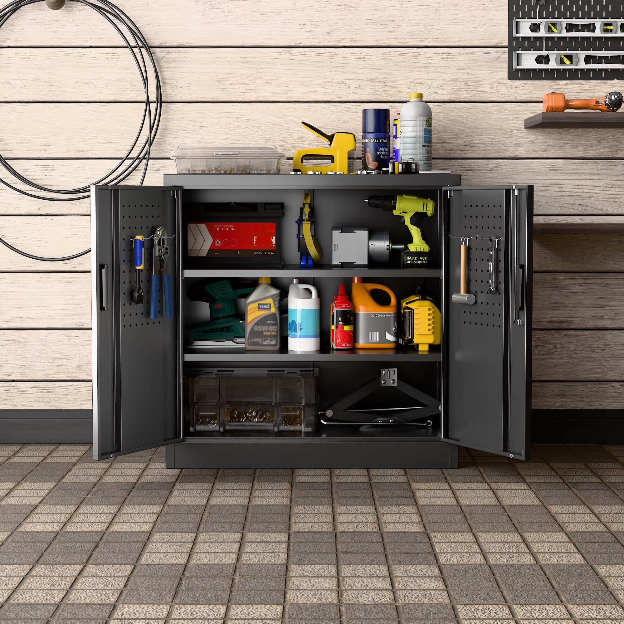 We focus on providing solution for your storage and organization needs in daily life.The upgraded metal storage cabinet has 5 adjustable partitions and a nail board behind the door, increasing your vertical storage space.Created with functional and maximized