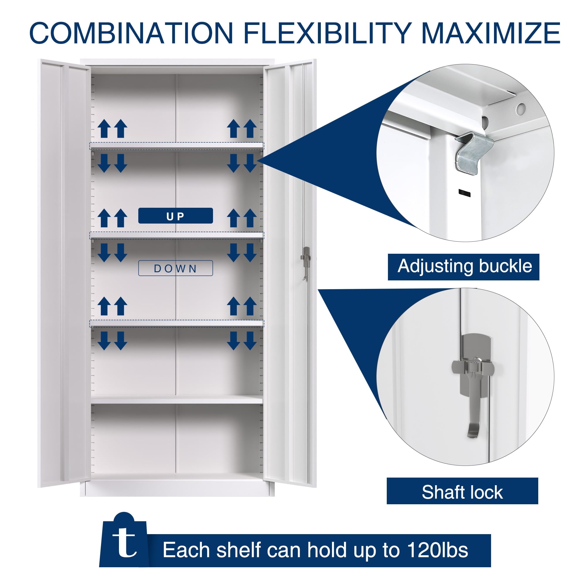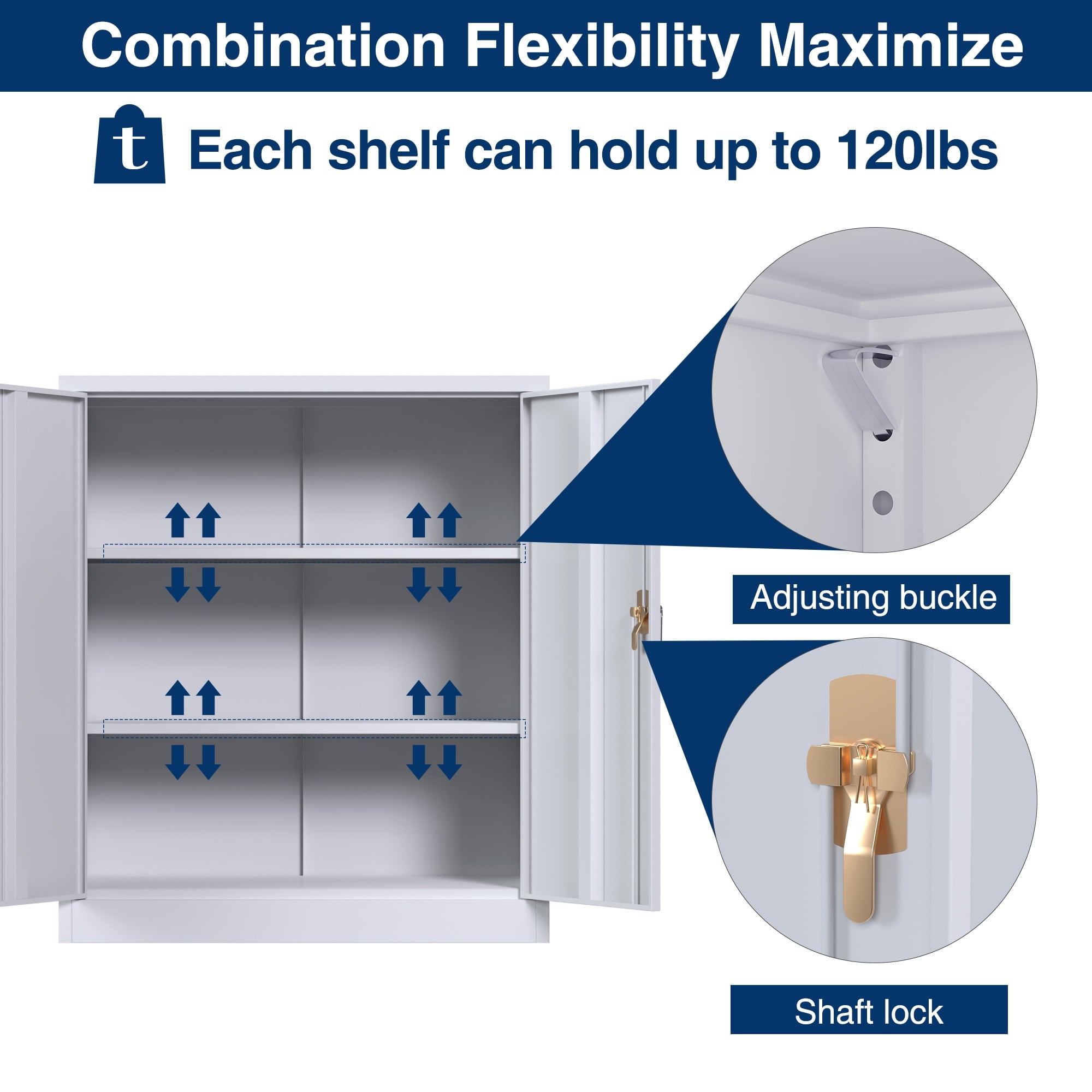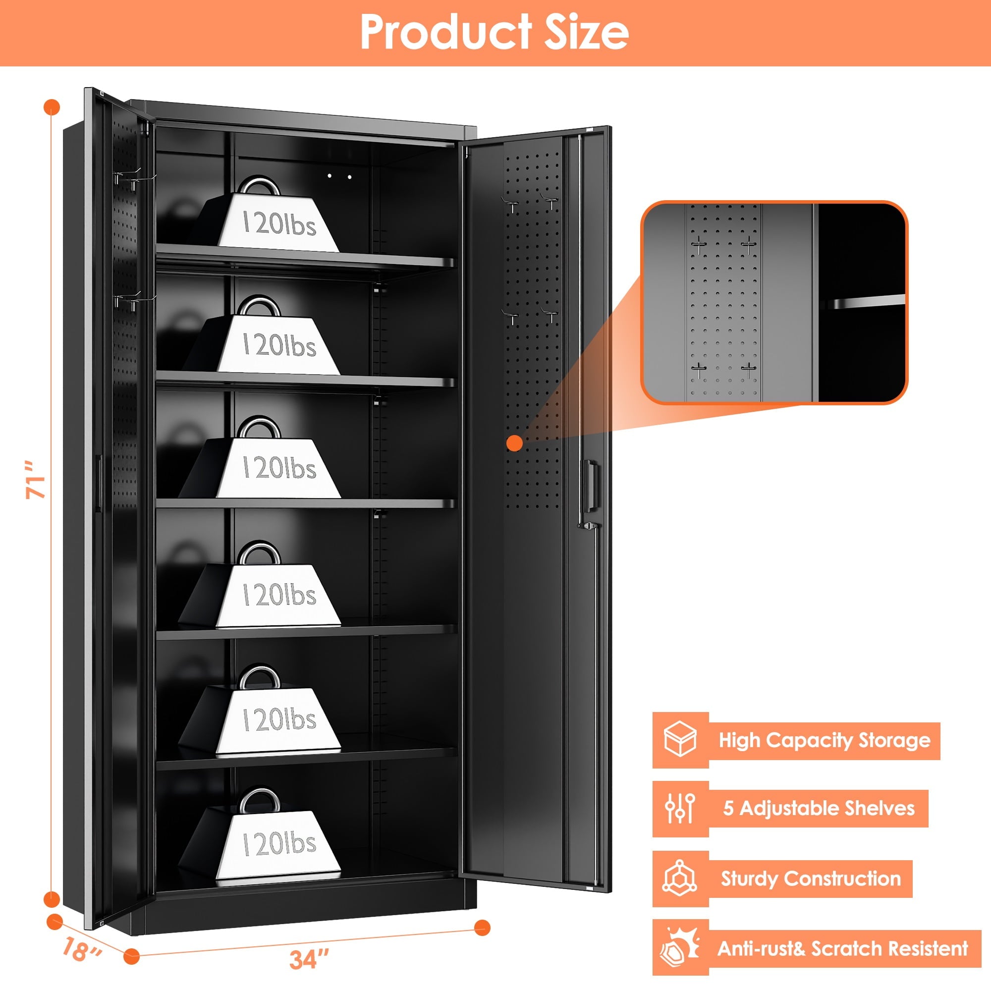 【Large Capacity】: This 2 door storage cabinet with 5 adjustable shelves that can be adjusted. Besides, each shelf of this metal office cabinet can hold up to 120lbs. It will meet your needs to accommodate items as much as you want.