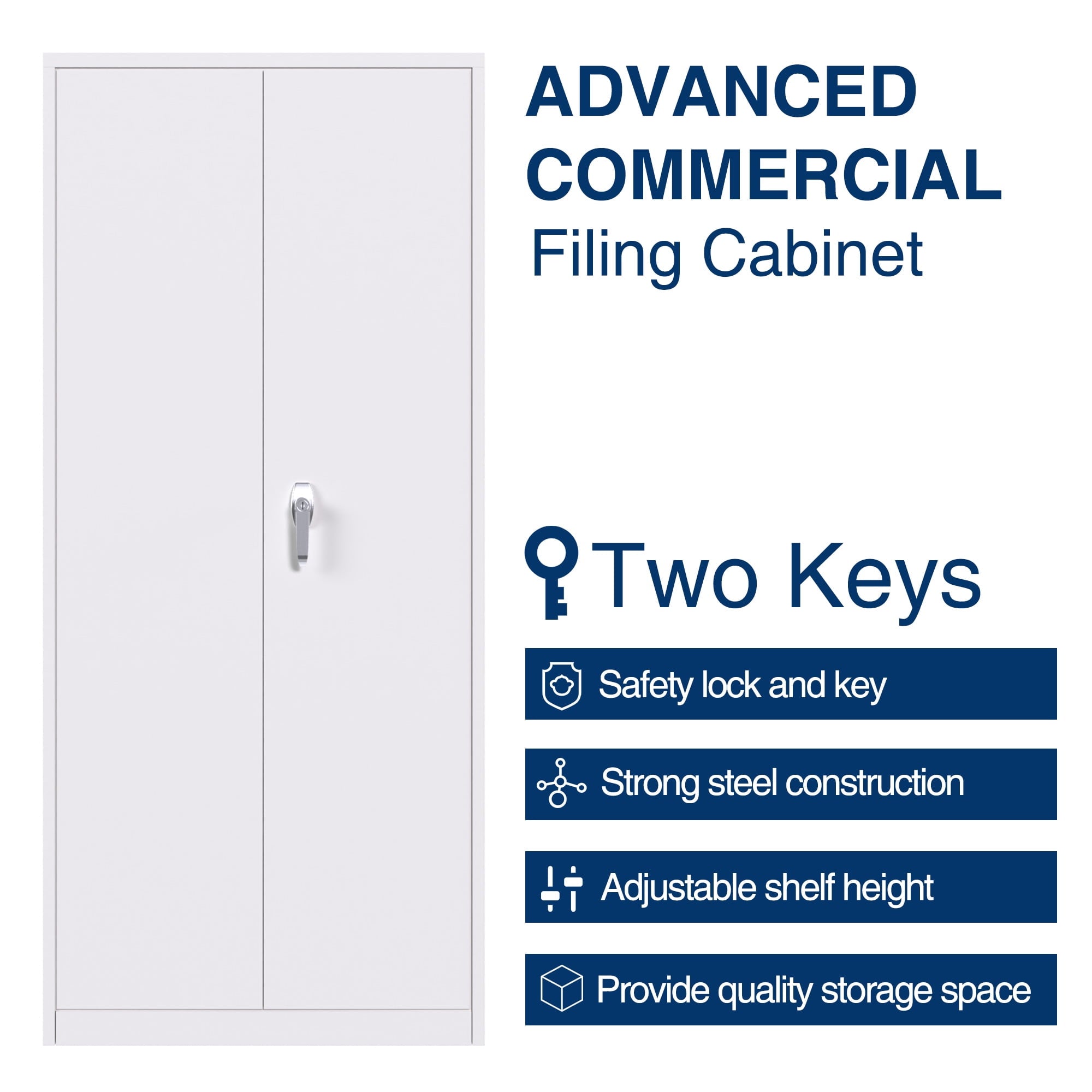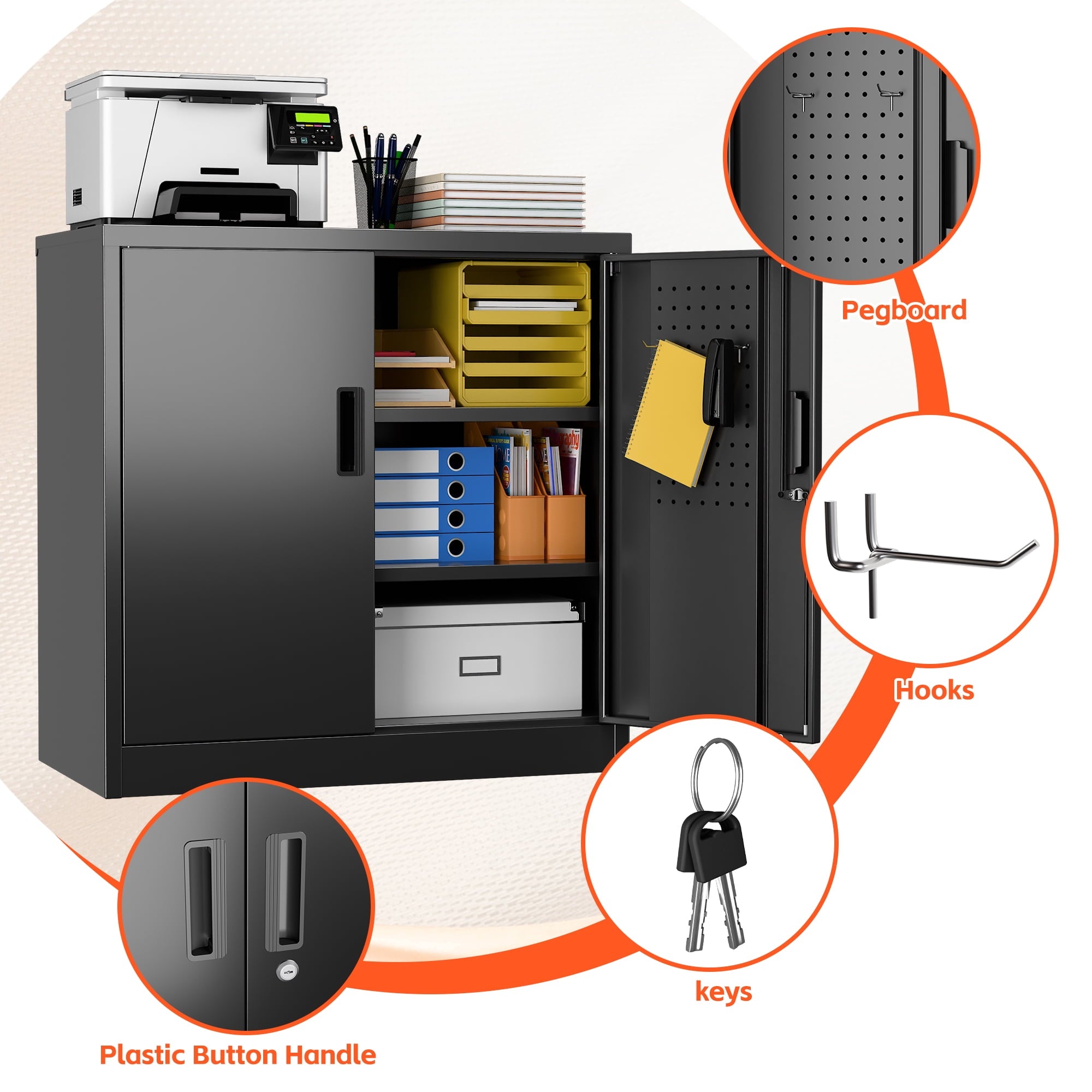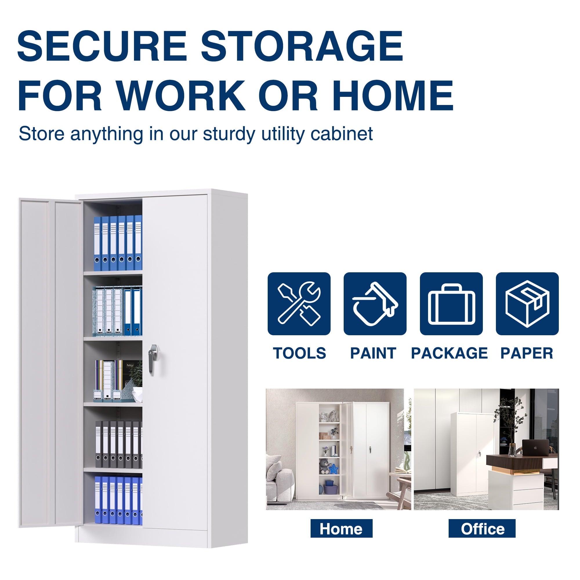 【Multiple Uses】2 door storage cabinet design with high-grade lock picking to secure valuables, and also it is enable to be mounted to the wall,thus you can place it in office, home, basements, shop, warehouse, garage.