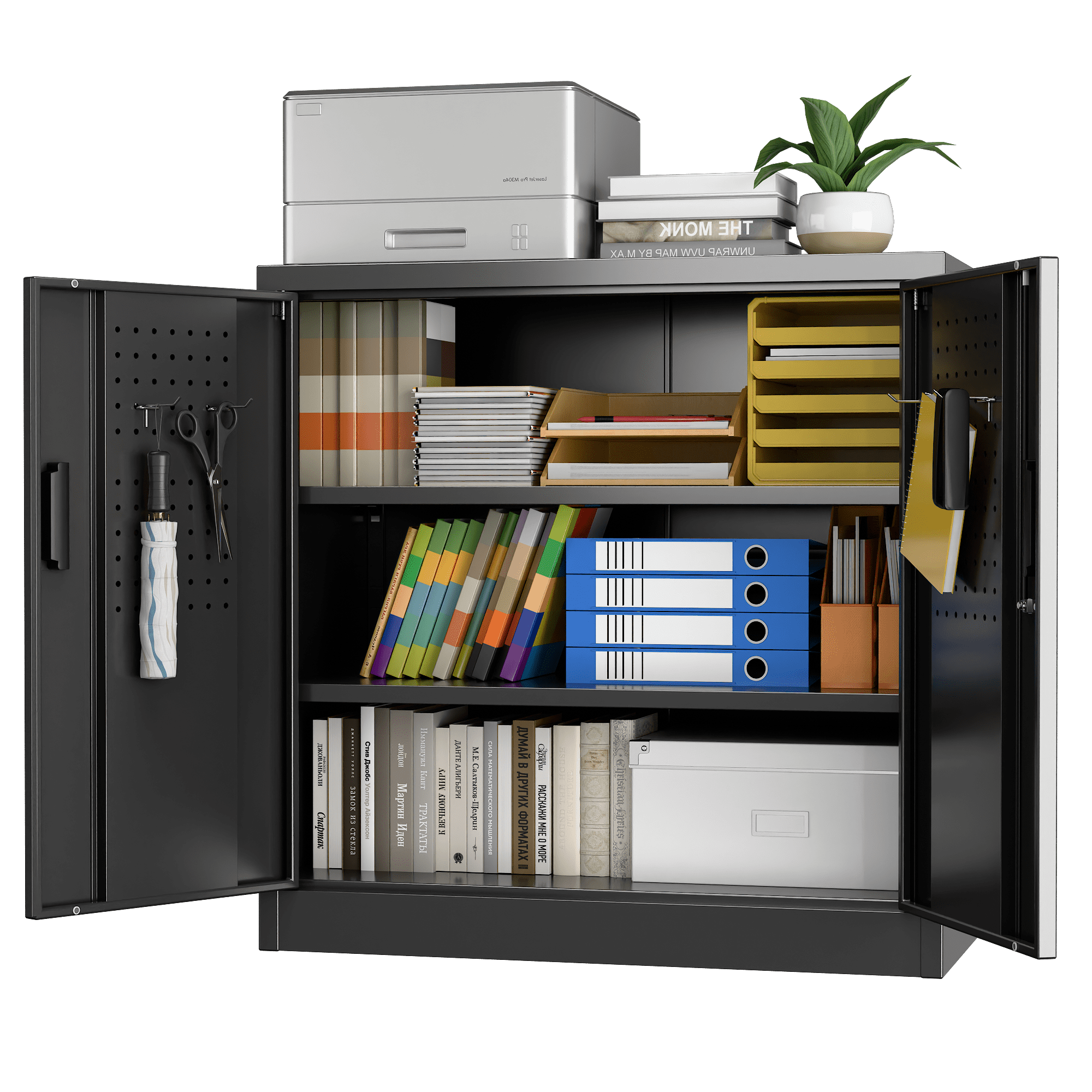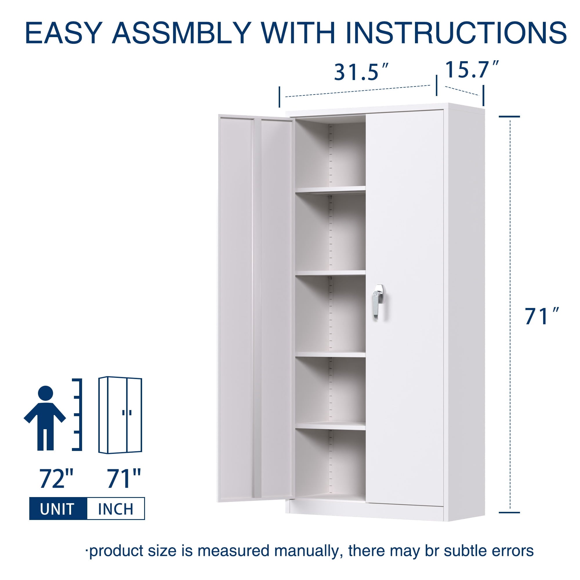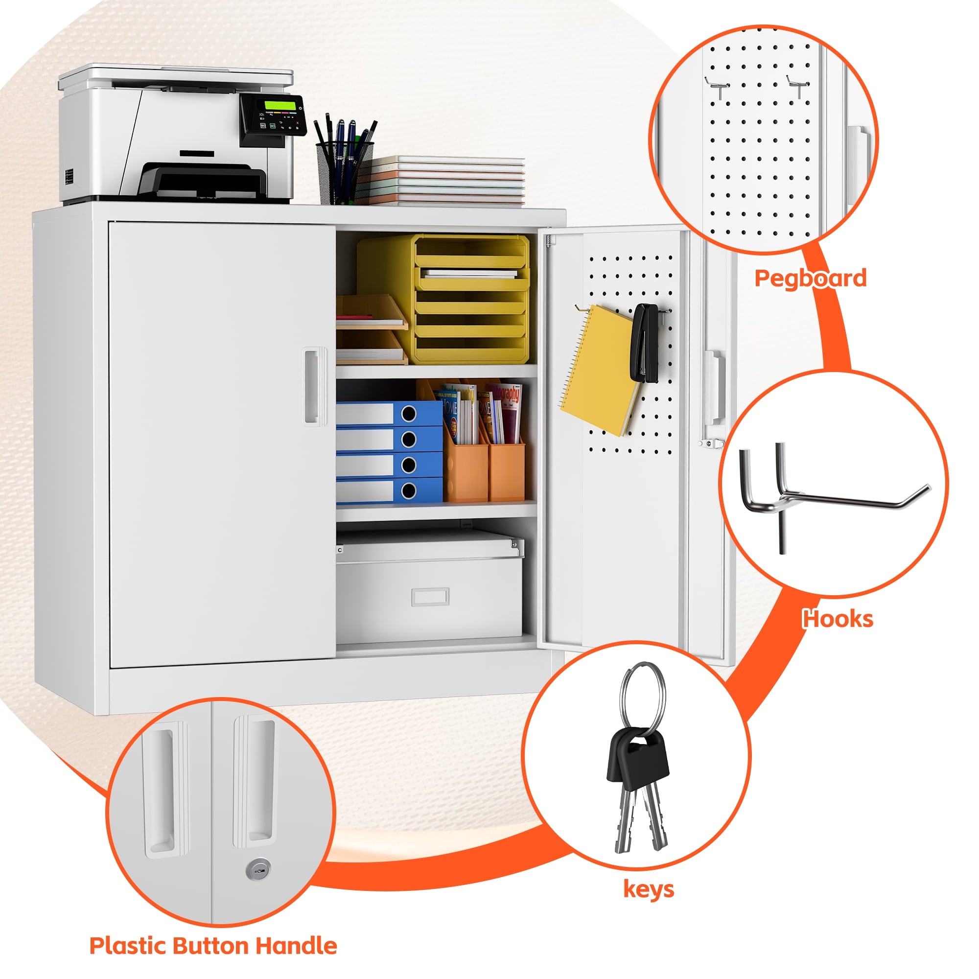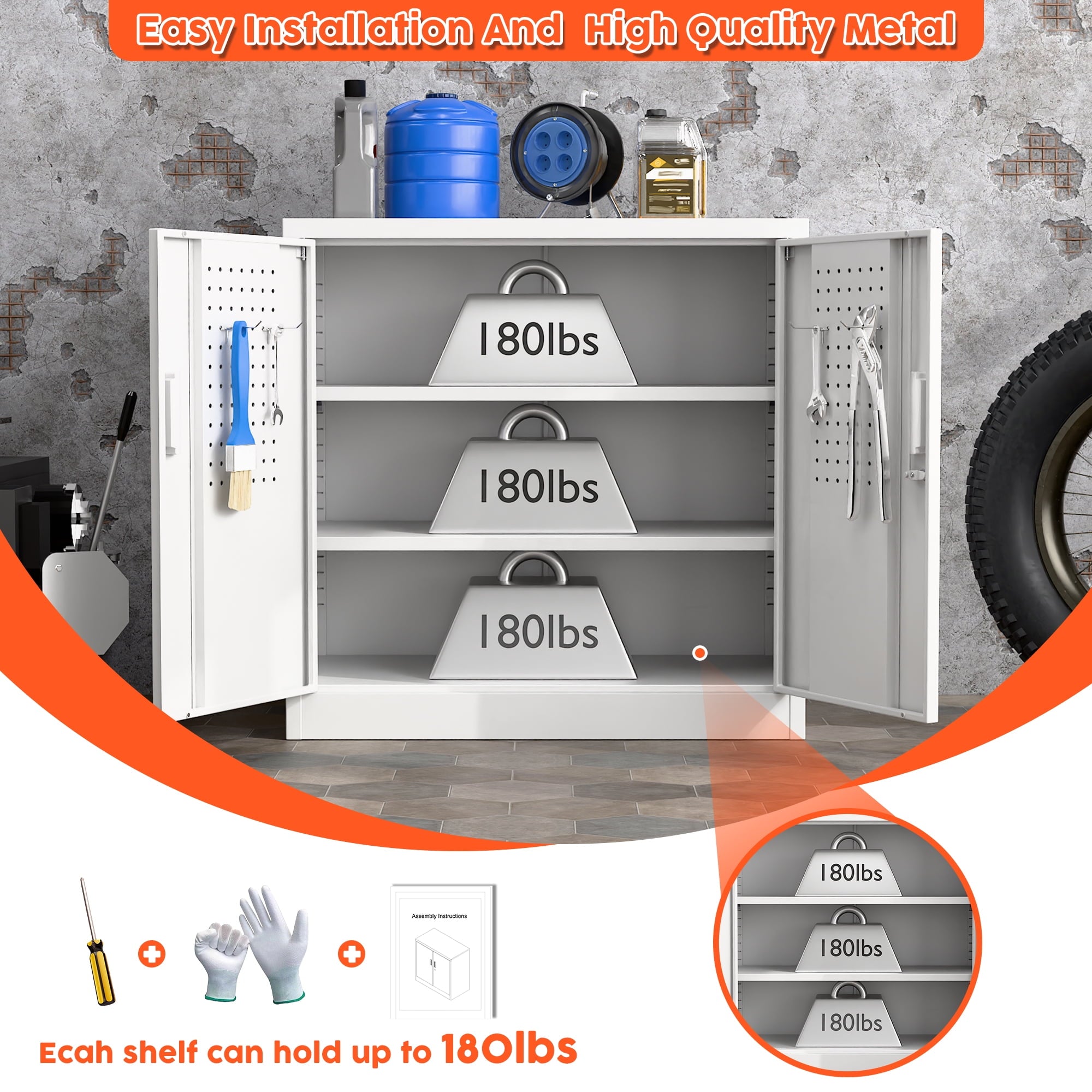 【Multiple Uses】2 door storage cabinet design with high-grade lock picking to secure valuables, and also it is enable to be mounted to the wall,thus you can place it in office, home, basements, shop, warehouse, garage.