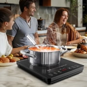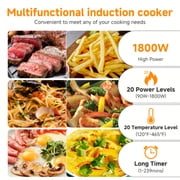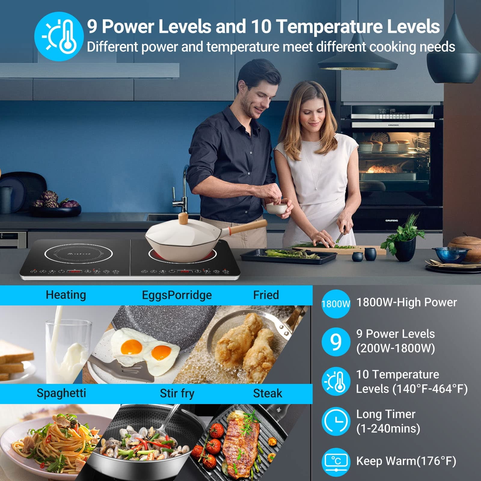 • 【Multi-Functions & Time Saver】: With two independent 2 Induction Burner heating areas and independent LED display, you can boil, simmer, fry, deep fry, stir fry, sauté, steam, sear, slow cook, BBQ, melt, grill, warm or simply re-heat and keep warm for up to 240mins! The applications are endless. Now It’s easy to prepare healthy, great tasting meals with a touch of a button. With 8 wattage settings of 200 and 1800/1600 watts(Left/Right), 10 temperature range:from 140℉-464℉, you can cook anywhere.